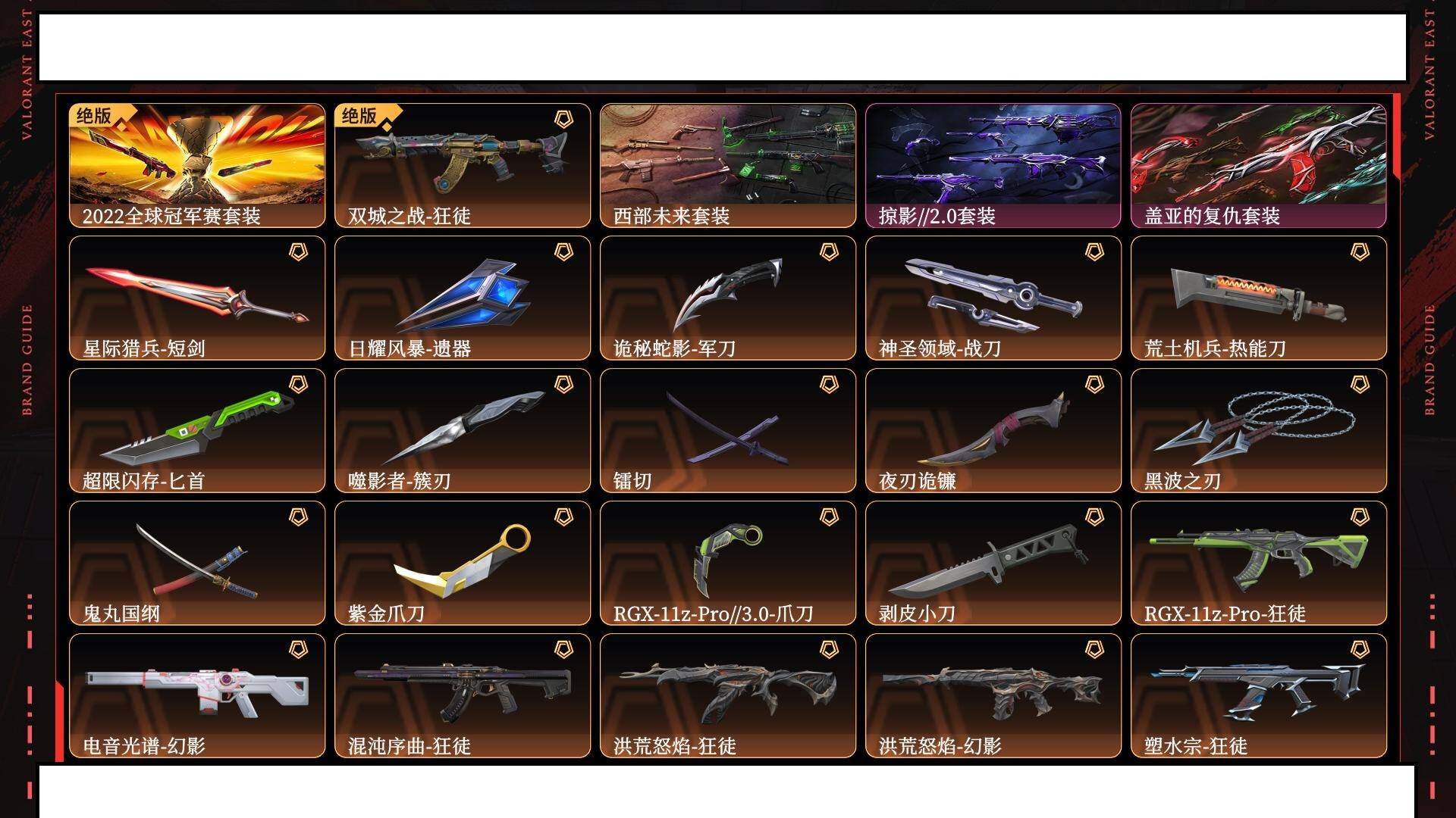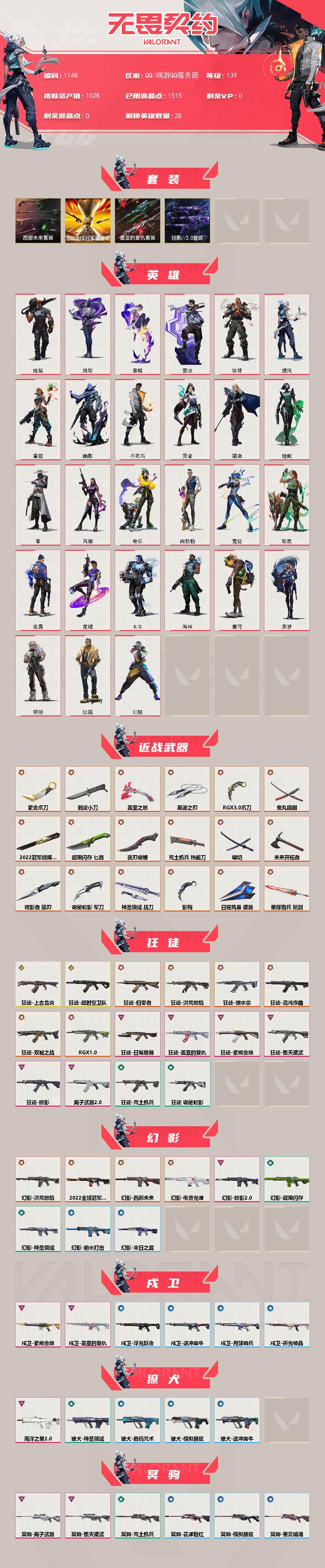 【1148】欢 336467【套装】:2022全球冠军赛套装,西部未来套装,盖亚的复仇套装,掠影//2.0套装 【英雄】:幻棱,炼狱,维斯,暮蝶,钛狐,壹决,铁臂,捷风,雷兹,幽影,不死鸟,贤者,猎枭,蝰蛇,零,芮娜,奇乐,尚勃勒,霓虹,斯凯,夜露,星礈,k/o,海神,盖可,黑梦,钢锁 【近战 武器】:近战武器-2022全球冠军赛 蝴蝶刀,近战武器-影钩,近战武器-剥皮小刀,近战武器-紫金爪刀,近战武器-rgx 11z pro//3.0 爪刀,近战武器-黑波之刃,近战武器-噬影者 簇刃,近战武器-镭切,近战武器-鬼丸国纲,近战武器-未来开拓者,近战武器-超限闪存 匕首,近战武器-盖亚之怒,近战武器-荒土机兵 热能刀,近战武器-夜刃诡镰,近战武器-诡秘蛇影 军刀,近战武器-神圣领域 战刀,近战武器-日耀风暴 遗器,近战武器-星际猎兵 短剑 【狂徒】:狂徒-上古龙炎,狂徒-超时空卫队,狂徒-归零者,狂徒-洪荒怒焰,狂徒-混沌序曲,狂徒-双城之战,狂徒-塑水宗,狂徒-rgx 11z pro,狂徒-堕天遗武,狂徒-掠影,狂徒-盖亚的复仇,狂徒-日冕雄师,狂徒-紫阙金琅,狂徒-离子武器//2.0,狂徒-荒土机兵,狂徒-诡秘蛇影 【幻影】:幻影-2022全球冠军赛,幻影-洪荒怒焰,幻影-西部未来,幻影-电音光谱,幻影-掠影//2.0,幻影-超限闪存,幻影-神圣领域,幻影-纳米打击,幻影-末日之翼,幻影-西部未来,幻影-电音光谱 【戍卫】:戍卫-盖亚的复仇,戍卫-紫阙金琅,戍卫-浮光跃金,戍卫-逆冲蛮牛,戍卫-月球哨兵,戍卫-折光棱晶 【獠犬】:獠犬-海洋之星//2.0,獠犬-神圣领域,獠犬-模拟赫兹,獠犬-逆冲蛮牛,獠犬-数码咒术 【冥驹】:冥驹-堕天遗武,冥驹-离子武器,冥驹-荒土机兵,冥驹-花漾粉红,冥驹-模拟赫兹,冥驹-星云暗涌 【飞将】:飞将-西部未来,飞将-盖亚的复仇,飞将-合金战车,飞将-末日之翼 【莽侠】:莽侠-rgx 11z pro//3.0,莽侠-超限闪存,莽侠-诡秘蛇影,莽侠-月球哨兵 【战神】:战神-奇点,战神-神圣领域,战神-浮光跃金,战神-数码咒术 【奥丁】:奥丁-西部未来,奥丁-掠影//2.0,奥丁-纳米打击,奥丁-末日之翼 【判官】:判官-上古龙炎,判官-诡秘蛇影,判官-纳米打击x,判官-数码咒术 【雄鹿】:雄鹿-起源,雄鹿-模拟赫兹,雄鹿-逆冲蛮牛,雄鹿-月球哨兵 【骇灵】:骇灵-紫阙金琅,骇灵-掠影//2.0,骇灵-荒土机兵,骇灵-无限竞技,骇灵-浮光跃金,骇灵-花漾粉红,骇灵-星云暗涌 【蜂刺】:蜂刺-超限闪存,蜂刺-合金战车,蜂刺-星云暗涌,蜂刺-折光棱晶 【标配】:标配-电音光谱,标配-赛博迷城,标配-荒土机兵,标配-浮光跃金,标配-折光棱晶,标配-电音光谱 【正义】:正义-奇点,正义-千灵华绽,正义-西部未来,正义-超限闪存,正义-合金战车,正义-纳米打击,正义-月球哨兵 【鬼魅】:鬼魅-盖亚的复仇,鬼魅-掠影//2.0,鬼魅-诡秘蛇影,鬼魅-模拟赫兹,鬼魅-星云暗涌 【狂怒】:狂怒-神圣领域,狂怒-花漾粉红,狂怒-逆冲蛮牛 【短炮】:短炮-归零者,短炮-末日之翼 【卡面】:终章:激斗汉堡 卡面,进入射程 卡面,分崩离析 卡面,纳米打击 卡面,抑制技术 卡面,激斗汉堡 卡面,瓦娃脸雪糕 p2 卡面,从黄昏到黎明 卡面,荒土机兵 卡面,银弹猎手 卡面,逆冲蛮牛 卡面,《双城之战》拥抱 卡面,精灵大战 卡面,欢迎来到底城 卡面,南瓜盛典 卡面,唱片的故事 卡面,钢弓与箭弦 卡面,排除故障 卡面,战术桌游 卡面,悠享食光 卡面,修车达人 卡面,热舞环节 卡面,模拟赫兹 卡面,浮光跃金 卡面,超限闪存 卡面,维斯工牌 卡面,正义的化身 卡面,时间到 卡面,最高舞台 卡面,红鳞松叶 卡面,clutch 卡面,梦幻奶茶 卡面,失控边缘 卡面,无畏契约:尚勃勒 卡面,源能反应 卡面,无畏契约go!第一卷:芮娜 卡面,无畏契约go!第一卷:零 卡面,《双城之战》金克丝 卡面,无畏契约go!第一卷:贤者 卡面,代号红色 卡面,冰淇淋店 卡面,新兵报到 卡面,v契约 卡面,无畏契约 卡面 【喷漆】:小小心意 喷漆,战“素”兔 喷漆,宇宙的指引 喷漆,请求重启 喷漆,逆冲蛮牛 喷漆,纳米打击 喷漆,鼻尖上的蝴蝶 喷漆,简笔画黯兽 喷漆,独守蝰腹 喷漆,他们将落荒而逃 喷漆,通缉:战术企鹅 喷漆,荒土机兵 喷漆,别挡我吃球! 喷漆,嗨宝南瓜灯 喷漆,嘭! 喷漆,都算到了 喷漆,控场勿近 喷漆,皮蛋呼呼 喷漆,像素星礈 喷漆,图谋不轨的零 喷漆,小丑猫 喷漆,模拟赫兹 喷漆,高丽风情小熊 喷漆,蹲到一个 喷漆,全力集中 喷漆,超限闪存 喷漆,rua一下 喷漆,熊抱 喷漆,高丽风情小虎 喷漆,记在小本本 喷漆,防弹企鹅 喷漆,高丽风情小蛙 喷漆,超级粉丝 喷漆,捷风差距 喷漆,审判之爪 喷漆,拼一呛 喷漆,致命优雅 喷漆,铁臂尴尬 喷漆,买装还是存钱 喷漆,关门放狗 喷漆,酷熊冲浪 喷漆,胜利属于无畏契约 喷漆,glhf 喷漆,无畏契约 喷漆 【挂饰】:终章:猫猫木乃伊 挂饰,荒土机兵 挂饰,悠闲鸡块 挂饰,猫猫木乃伊 挂饰,水壶 挂饰,纳米打击 挂饰,逆冲蛮牛 挂饰,可爱糖糖 挂饰,伞绳 挂饰,《双城之战》小蛋糕 挂饰,第九季//第三幕 纪念币 挂饰,拳击战术熊 挂饰,工具腰带 挂饰,无畏契约go!第一卷 芮娜 挂饰,无畏契约go!第一卷 零 挂饰,暗藏猫腻 挂饰,高丽风情 挂饰,鱼骨头 挂饰,熔岩灯 挂饰,超限闪存 挂饰,迷你k/o 挂饰,模拟赫兹 挂饰,第九季//第二幕 纪念币 挂饰,薰衣草之心 挂饰,袖珍捷风 挂饰,z世代特饮 挂饰,第九季//第一幕 纪念币 挂饰,天外飞客 挂饰,红鳞松叶 挂饰,《双城之战》魄罗 挂饰,第七季//第二幕 纪念币 挂饰,无畏契约 纪念币 挂饰