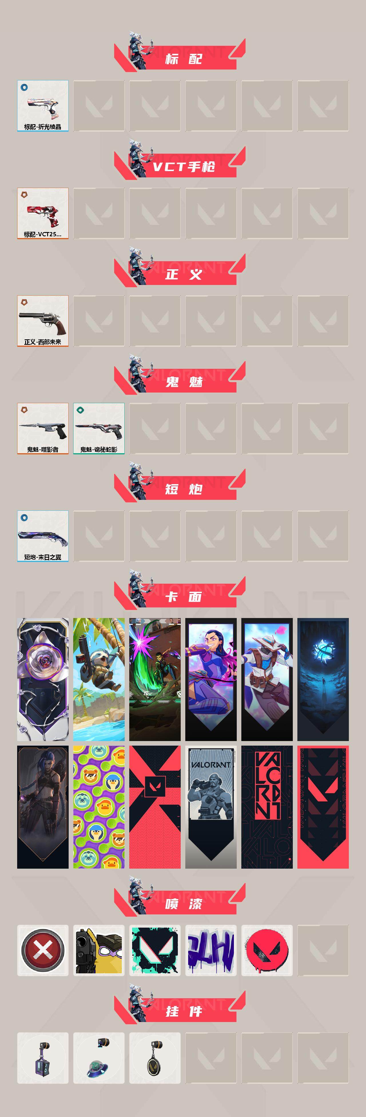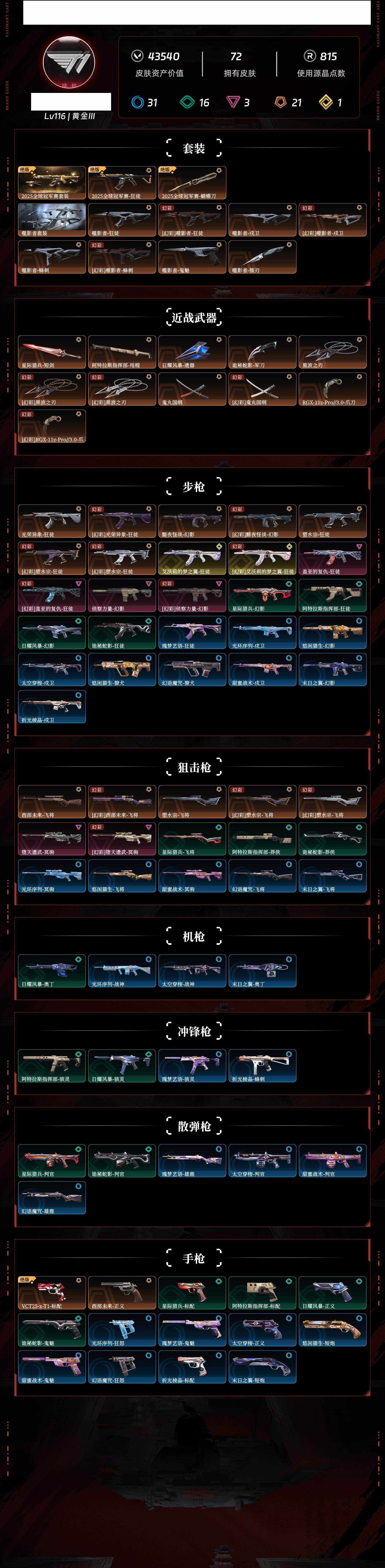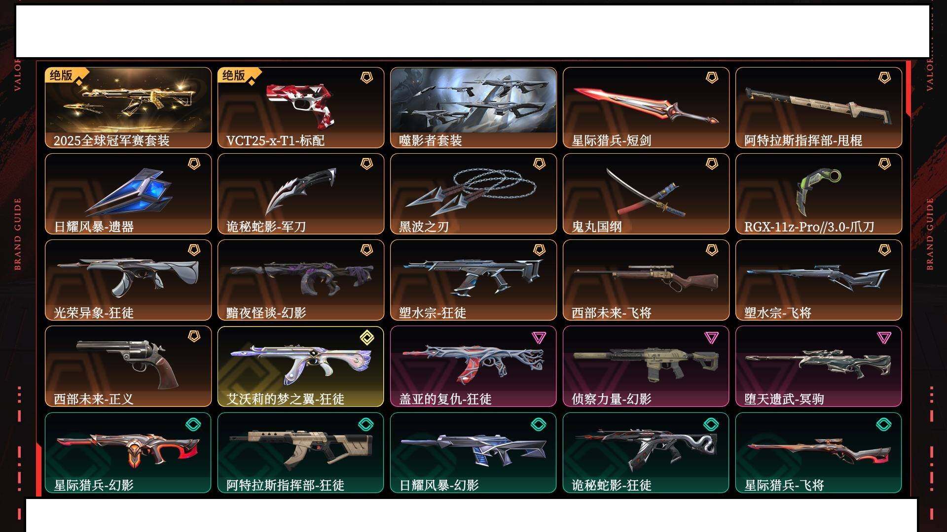 【1149】【套装】:2025全球冠军赛套装,噬影者套装 【英雄】:幻棱,炼狱,维斯,暮蝶,壹决,铁臂,捷风,雷兹,幽影,不死鸟,贤者,猎枭,蝰蛇,零,芮娜,尚勃勒,霓虹,夜露,k/o,盖可,黑梦,钢锁 【近战 武器】:近战武器-2025全球冠军赛 蝴蝶刀,近战武器-rgx 11z pro//3.0 爪刀,近战武器-黑波之刃,近战武器-噬影者 簇刃,近战武器-鬼丸国纲,近战武器-诡秘蛇影 军刀,近战武器-日耀风暴 遗器,近战武器-阿特拉斯指挥部 甩棍,近战武器-星际猎兵 短剑 【狂徒】:狂徒-艾沃莉的梦之翼,狂徒-2025全球冠军赛,狂徒-塑水宗,狂徒-噬影者,狂徒-光荣异象,狂徒-盖亚的复仇,狂徒-诡秘蛇影 【幻影】:幻影-黯夜怪谈,幻影-侦察力量,幻影-末日之翼 【戍卫】:戍卫-噬影者,戍卫-折光棱晶 【冥驹】:冥驹-堕天遗武 【飞将】:飞将-塑水宗,飞将-西部未来,飞将-末日之翼 【莽侠】:莽侠-诡秘蛇影 【奥丁】:奥丁-末日之翼 【判官】:判官-诡秘蛇影 【蜂刺】:蜂刺-噬影者,蜂刺-折光棱晶 【标配】:标配-折光棱晶 【vct手呛】:标配-vct25 x t1 【正义】:正义-西部未来 【鬼魅】:鬼魅-噬影者,鬼魅-诡秘蛇影 【短炮】:短炮-末日之翼 【卡面】:铁之华 卡面,树懒大作战 卡面,源能反应 卡面,无畏契约go!第一卷:芮娜 卡面,无畏契约go!第一卷:零 卡面,无垠星环 卡面,《双城之战》金克丝 卡面,战术小伙伴 卡面,代号红色 卡面,新兵报到 卡面,v契约 卡面,无畏契约 卡面 【喷漆】:买装还是存钱 喷漆,放下武器 喷漆,胜利属于无畏契约 喷漆,glhf 喷漆,无畏契约 喷漆 【挂饰】:动力机箱 挂饰,天外飞客 挂饰,无畏契约 纪念币 挂饰