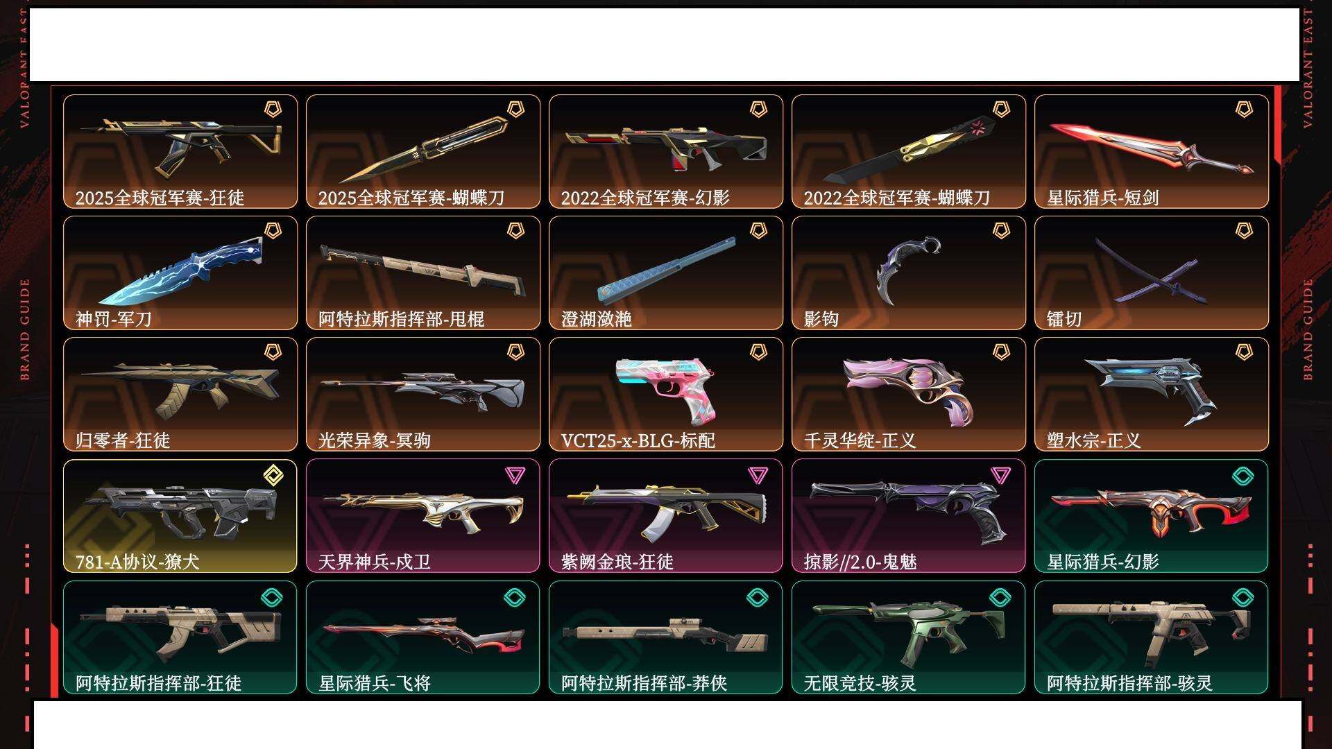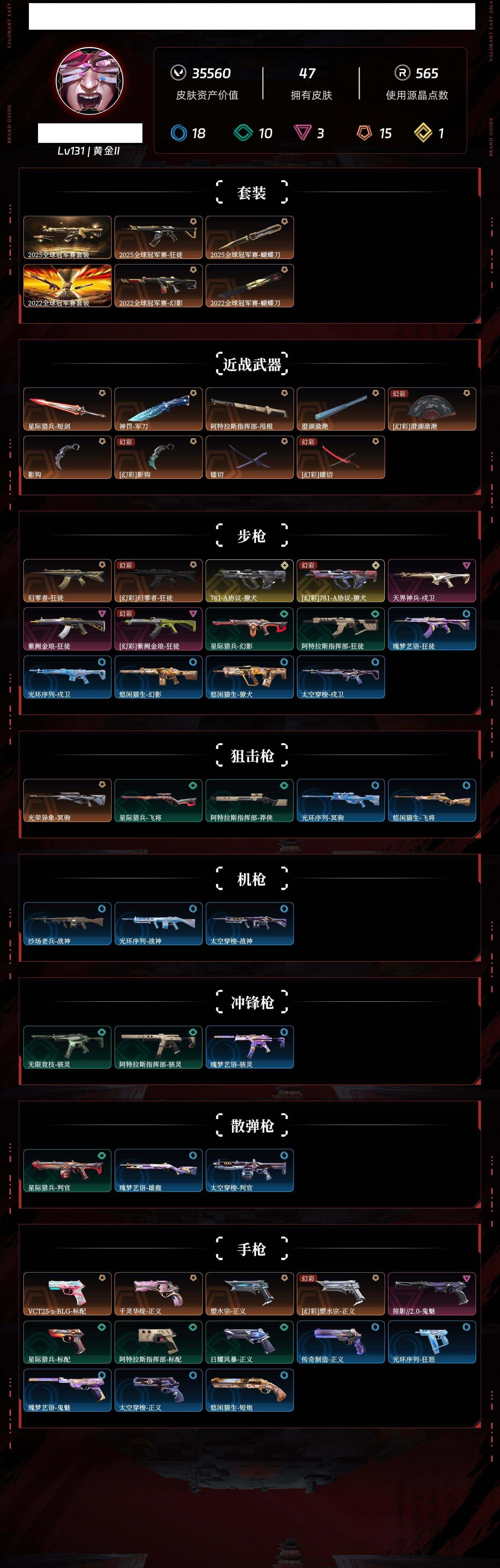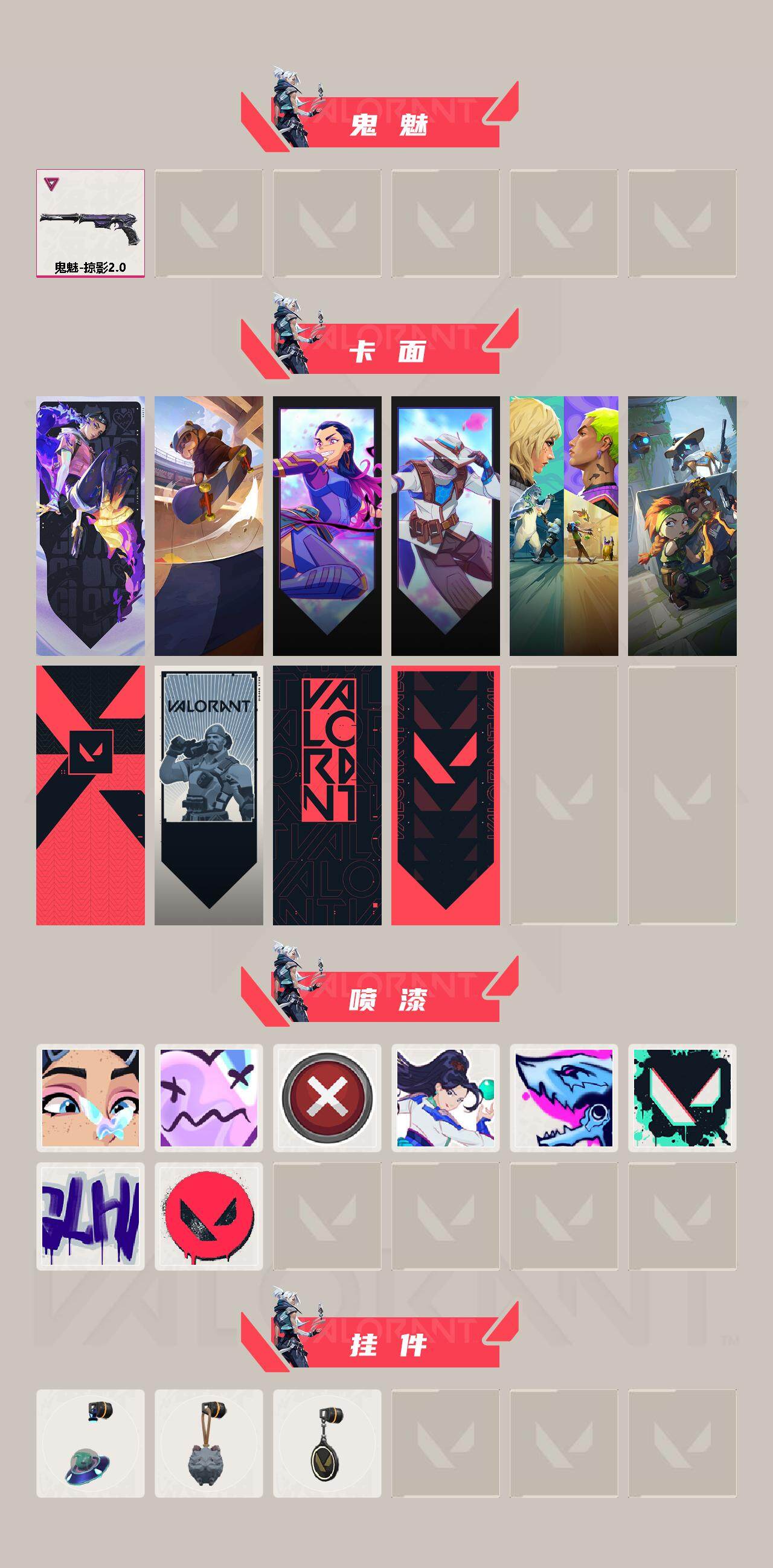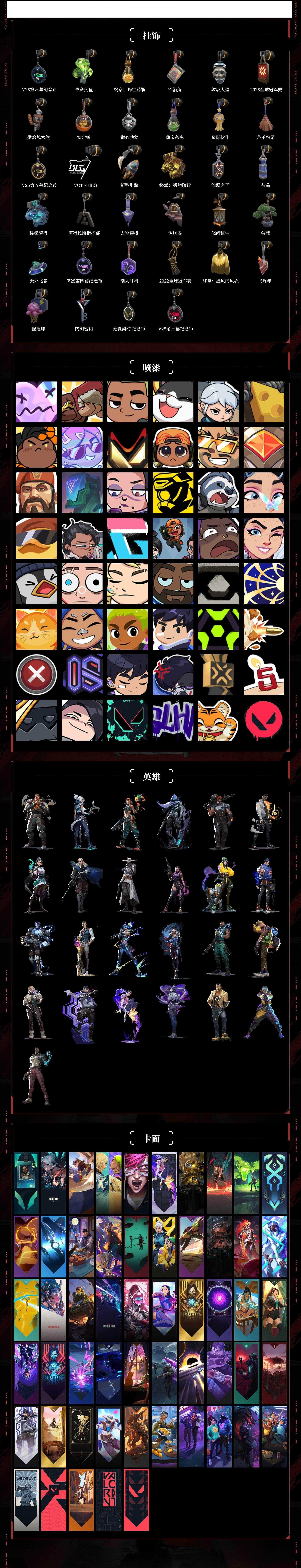 【1152】欢 231634【套装】:2025全球冠军赛套装,2022全球冠军赛套装 【英雄】:幻棱,炼狱,维斯,暮蝶,钛狐,壹决,铁臂,捷风,雷兹,幽影,不死鸟,贤者,猎枭,蝰蛇,零,芮娜,奇乐,尚勃勒,霓虹,斯凯,夜露,k/o,海神,盖可,黑梦,钢锁 【近战 武器】:近战武器-2025全球冠军赛 蝴蝶刀,近战武器-2022全球冠军赛 蝴蝶刀,近战武器-影钩,近战武器-镭切,近战武器-澄湖潋滟,近战武器-神罚 军刀,近战武器-阿特拉斯指挥部 甩棍,近战武器-星际猎兵 短剑 【狂徒】:狂徒-2025全球冠军赛,狂徒-归零者,狂徒-紫阙金琅 【幻影】:幻影-2022全球冠军赛 【戍卫】:戍卫-天界神兵 【獠犬】:獠犬-781-a协议 【冥驹】:冥驹-光荣异象 【战神】:战神-沙场老兵 【骇灵】:骇灵-无限竞技 【vct手呛】:标配-vct25 x blg 【正义】:正义-千灵华绽,正义-塑水宗,正义-传奇制造 【鬼魅】:鬼魅-掠影//2.0 【卡面】:无畏契约:暮蝶 卡面,clutch 卡面,无畏契约go!第一卷:芮娜 卡面,无畏契约go!第一卷:零 卡面,钢锁vs盖可 卡面,别冒尖 卡面,代号红色 卡面,新兵报到 卡面,v契约 卡面,无畏契约 卡面 【喷漆】:鼻尖上的蝴蝶 喷漆,伤心心 喷漆,买装还是存钱 喷漆,无畏契约go!第一卷:贤者 喷漆,暴走萝莉 喷漆,胜利属于无畏契约 喷漆,glhf 喷漆,无畏契约 喷漆 【挂饰】:天外飞客 挂饰,《双城之战》魄罗 挂饰,无畏契约 纪念币 挂饰