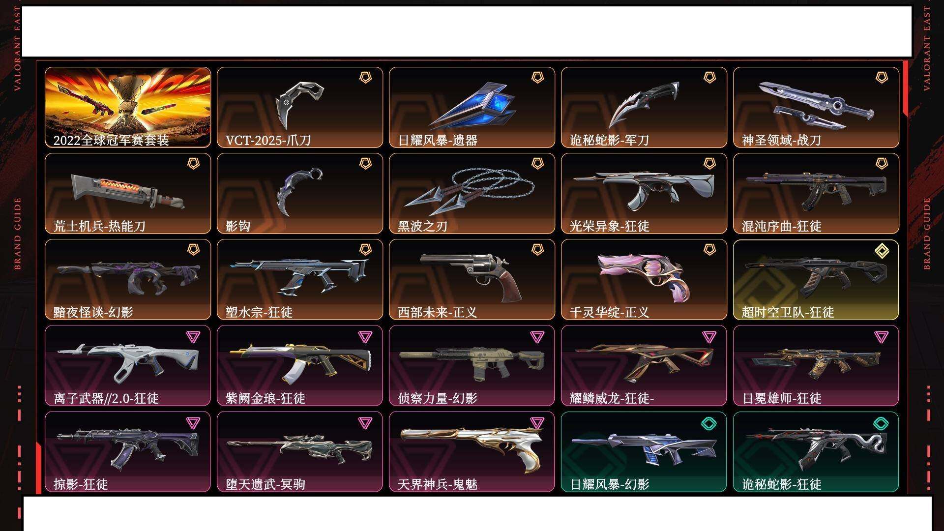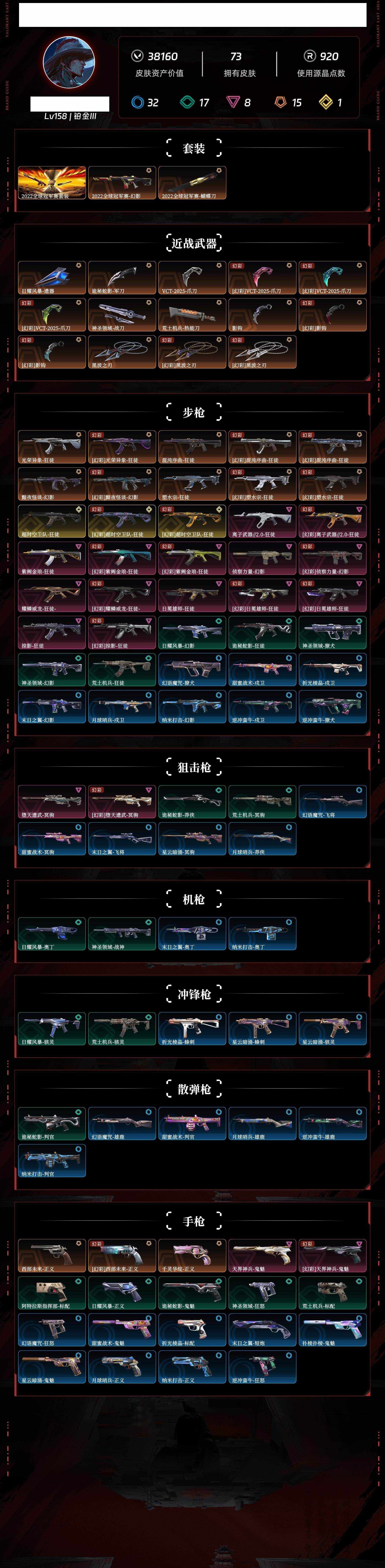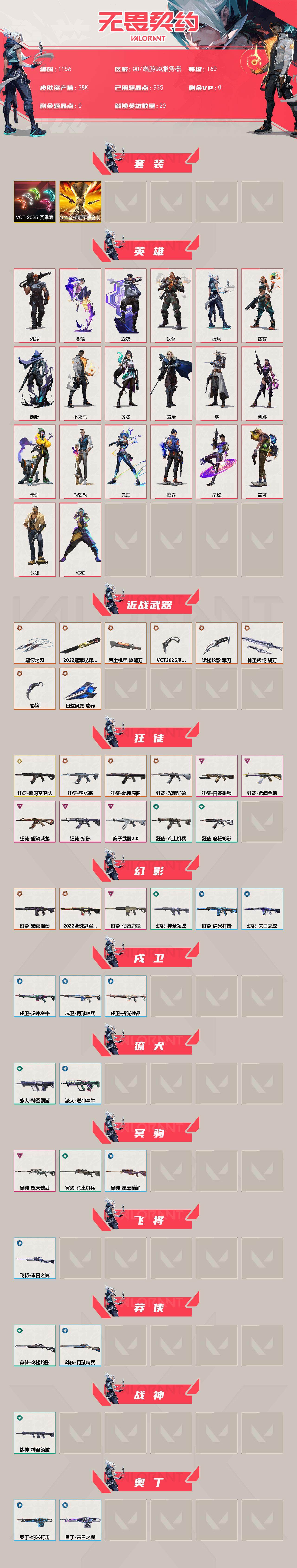 【1156】欢 125858【套装】:2022全球冠军赛套装,vct 2025 赛季套装 【英雄】:幻棱,炼狱,暮蝶,钛狐,壹决,铁臂,捷风,雷兹,幽影,不死鸟,贤者,猎枭,零,芮娜,奇乐,尚勃勒,霓虹,夜露,星礈,盖可 【近战 武器】:近战武器-2022全球冠军赛 蝴蝶刀,近战武器-影钩,近战武器-vct 2025 爪刀,近战武器-黑波之刃,近战武器-荒土机兵 热能刀,近战武器-诡秘蛇影 军刀,近战武器-神圣领域 战刀,近战武器-日耀风暴 遗器 【狂徒】:狂徒-超时空卫队,狂徒-混沌序曲,狂徒-塑水宗,狂徒-光荣异象,狂徒-掠影,狂徒-日冕雄师,狂徒-耀鳞威龙,狂徒-紫阙金琅,狂徒-离子武器//2.0,狂徒-荒土机兵,狂徒-诡秘蛇影 【幻影】:幻影-2022全球冠军赛,幻影-黯夜怪谈,幻影-侦察力量,幻影-神圣领域,幻影-纳米打击,幻影-末日之翼 【戍卫】:戍卫-逆冲蛮牛,戍卫-月球哨兵,戍卫-折光棱晶 【獠犬】:獠犬-神圣领域,獠犬-逆冲蛮牛 【冥驹】:冥驹-堕天遗武,冥驹-荒土机兵,冥驹-星云暗涌 【飞将】:飞将-末日之翼 【莽侠】:莽侠-诡秘蛇影,莽侠-月球哨兵 【战神】:战神-神圣领域 【奥丁】:奥丁-纳米打击,奥丁-末日之翼 【判官】:判官-诡秘蛇影,判官-纳米打击x 【雄鹿】:雄鹿-逆冲蛮牛,雄鹿-月球哨兵 【骇灵】:骇灵-荒土机兵,骇灵-星云暗涌 【蜂刺】:蜂刺-星云暗涌,蜂刺-折光棱晶 【标配】:标配-荒土机兵,标配-折光棱晶 【正义】:正义-千灵华绽,正义-西部未来,正义-纳米打击,正义-月球哨兵 【鬼魅】:鬼魅-天界神兵,鬼魅-诡秘蛇影,鬼魅-扑棱扑棱,鬼魅-星云暗涌 【狂怒】:狂怒-神圣领域,狂怒-逆冲蛮牛 【短炮】:短炮-末日之翼 【卡面】:终章:激斗汉堡 卡面,进入射程 卡面,分崩离析 卡面,纳米打击 卡面,抑制技术 卡面,激斗汉堡 卡面,瓦娃脸雪糕 p2 卡面,从黄昏到黎明 卡面,荒土机兵 卡面,银弹猎手 卡面,逆冲蛮牛 卡面,《双城之战》拥抱 卡面,精灵大战 卡面,欢迎来到底城 卡面,南瓜盛典 卡面,无畏契约:暮蝶 卡面,修车达人 卡面,正义的化身 卡面,clutch 卡面,无畏契约go!第一卷:芮娜 卡面,无畏契约go!第一卷:零 卡面,《双城之战》金克丝 卡面,代号红色 卡面,新兵报到 卡面,v契约 卡面,无畏契约 卡面 【喷漆】:小小心意 喷漆,战“素”兔 喷漆,宇宙的指引 喷漆,请求重启 喷漆,逆冲蛮牛 喷漆,纳米打击 喷漆,鼻尖上的蝴蝶 喷漆,简笔画黯兽 喷漆,独守蝰腹 喷漆,他们将落荒而逃 喷漆,通缉:战术企鹅 喷漆,荒土机兵 喷漆,别挡我吃球! 喷漆,嗨宝南瓜灯 喷漆,嘭! 喷漆,都算到了 喷漆,控场勿近 喷漆,伤心心 喷漆,熊抱 喷漆,铁臂尴尬 喷漆,买装还是存钱 喷漆,暴走萝莉 喷漆,静电火花 喷漆 ,凌空惊吓 喷漆,胜利属于无畏契约 喷漆,glhf 喷漆,无畏契约 喷漆 【挂饰】:终章:猫猫木乃伊 挂饰,荒土机兵 挂饰,悠闲鸡块 挂饰,猫猫木乃伊 挂饰,水壶 挂饰,纳米打击 挂饰,逆冲蛮牛 挂饰,可爱糖糖 挂饰,伞绳 挂饰,《双城之战》小蛋糕 挂饰,第九季//第三幕 纪念币 挂饰,第九季//第二幕 纪念币 挂饰,传世莲华 挂饰,天外飞客 挂饰,无畏契约 纪念币 挂饰