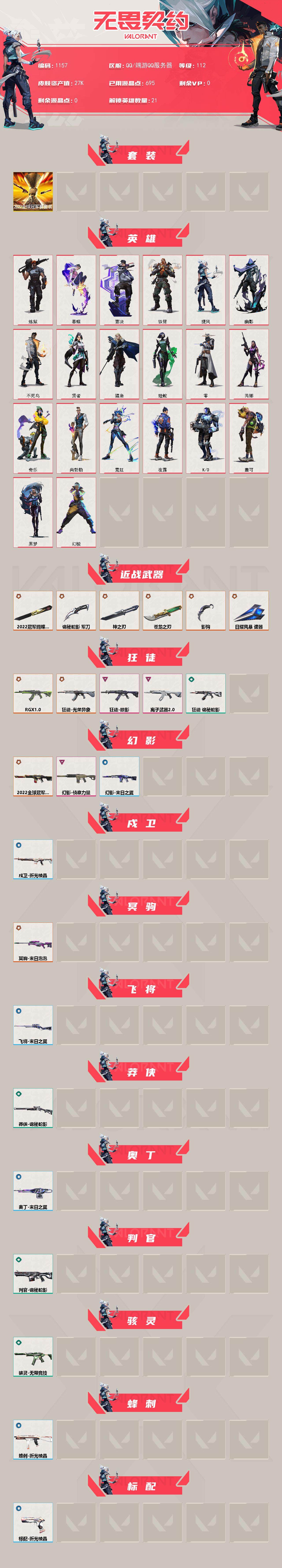 【1157】欢 723327【套装】:2022全球冠军赛套装 【英雄】:幻棱,炼狱,暮蝶,壹决,铁臂,捷风,幽影,不死鸟,贤者,猎枭,蝰蛇,零,芮娜,奇乐,尚勃勒,霓虹,夜露,k/o,盖可,黑梦 【近战 武器】:近战武器-2022全球冠军赛 蝴蝶刀,近战武器-影钩,近战武器-5周年//公测重制版 苍龙之刃,近战武器-神之刃,近战武器-诡秘蛇影 军刀,近战武器-日耀风暴 遗器 【狂徒】:狂徒-rgx 11z pro,狂徒-光荣异象,狂徒-掠影,狂徒-离子武器//2.0,狂徒-诡秘蛇影 【幻影】:幻影-2022全球冠军赛,幻影-侦察力量,幻影-末日之翼 【戍卫】:戍卫-折光棱晶 【冥驹】:冥驹-末日泡泡 【飞将】:飞将-末日之翼 【莽侠】:莽侠-诡秘蛇影 【奥丁】:奥丁-末日之翼 【判官】:判官-诡秘蛇影 【骇灵】:骇灵-无限竞技 【蜂刺】:蜂刺-折光棱晶 【标配】:标配-折光棱晶 【vct手呛】:标配-vct25 x edg 【正义】:正义-西部未来 【鬼魅】:鬼魅-诡秘蛇影 【短炮】:短炮-末日之翼 【卡面】:从黄昏到黎明 卡面,《双城之战》拥抱 卡面,精灵大战 卡面,欢迎来到底城 卡面,南瓜盛典 卡面,无畏契约:暮蝶 卡面,热舞环节 卡面,树懒大作战 卡面,clutch 卡面,无畏契约go!第一卷:芮娜 卡面,无畏契约go!第一卷:零 卡面,无垠星环 卡面,《双城之战》金克丝 卡面,无畏契约go!第一卷:贤者 卡面,钢锁vs盖可 卡面,别冒尖 卡面,代号红色 卡面,新兵报到 卡面,v契约 卡面,无畏契约 卡面 【喷漆】:嘭! 喷漆,都算到了 喷漆,控场勿近 喷漆,伤心心 喷漆,超能偶像 喷漆,拼一呛 喷漆,买装还是存钱 喷漆,关门放狗 喷漆,无畏契约go!第一卷:芮娜 喷漆,红鳞 喷漆,无畏契约go!第一卷:贤者 喷漆,蕊形灯 喷漆,放下武器 喷漆,放手一搏 喷漆,胜利属于无畏契约 喷漆,glhf 喷漆,无畏契约 喷漆 【挂饰】:《双城之战》小蛋糕 挂饰,第九季//第三幕 纪念币 挂饰,鱼骨头 挂饰,薰衣草之心 挂饰,z世代特饮 挂饰,动力机箱 挂饰,vct x edg 挂饰,天外飞客 挂饰,红鳞松叶 挂饰,《双城之战》魄罗 挂饰,海豹的认可 挂饰,无畏契约 纪念币 挂饰