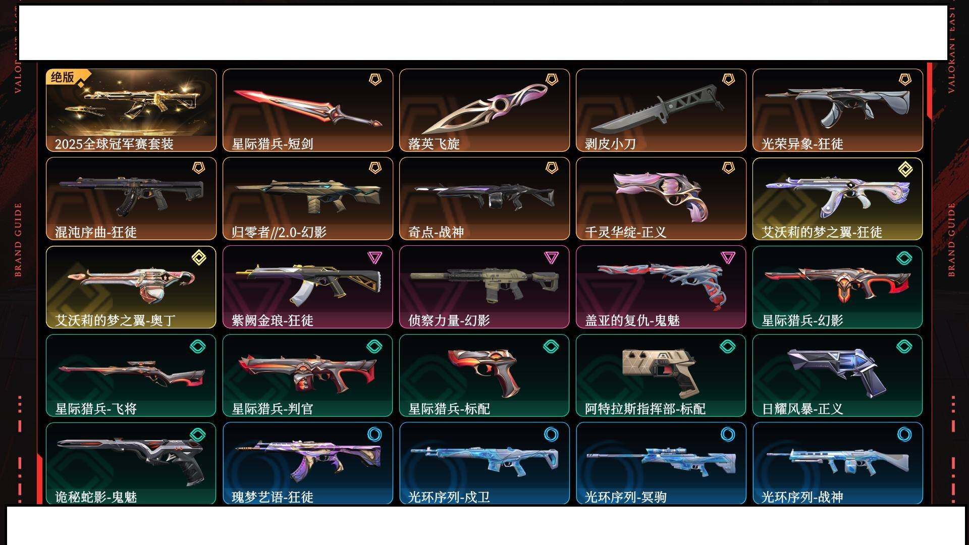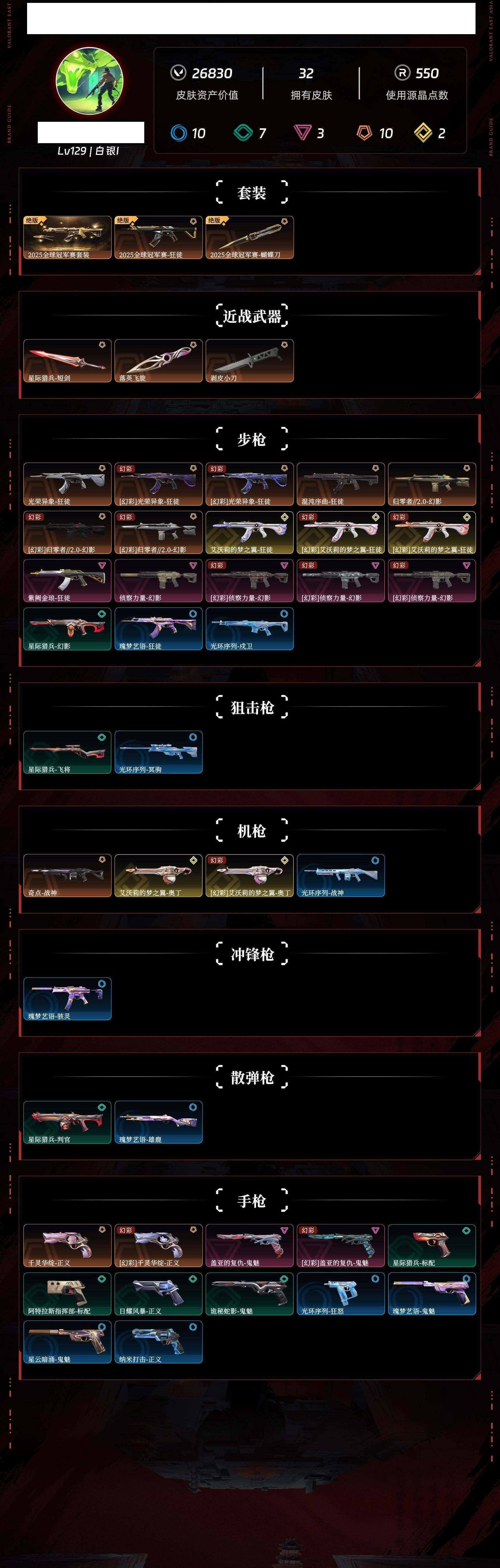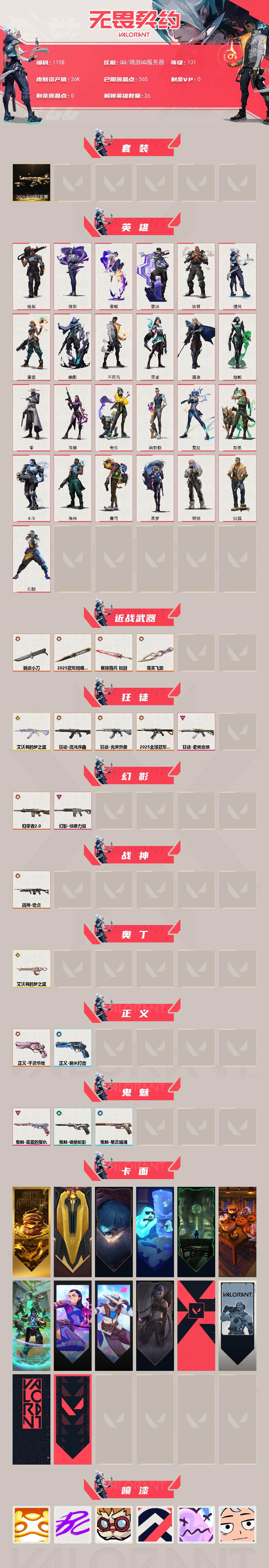 【1158】欢 208867【套装】:2025全球冠军赛套装 【英雄】:幻棱,炼狱,维斯,暮蝶,钛狐,壹决,铁臂,捷风,雷兹,幽影,不死鸟,贤者,猎枭,蝰蛇,零,芮娜,奇乐,尚勃勒,霓虹,斯凯,k/o,海神,盖可,黑梦,钢锁 【近战 武器】:近战武器-2025全球冠军赛 蝴蝶刀,近战武器-剥皮小刀,近战武器-落英飞旋,近战武器-星际猎兵 短剑 【狂徒】:狂徒-艾沃莉的梦之翼,狂徒-2025全球冠军赛,狂徒-混沌序曲,狂徒-光荣异象,狂徒-紫阙金琅 【幻影】:幻影-归零者//2.0,幻影-侦察力量 【战神】:战神-奇点 【奥丁】:奥丁-艾沃莉的梦之翼 【正义】:正义-千灵华绽,正义-纳米打击 【鬼魅】:鬼魅-盖亚的复仇,鬼魅-诡秘蛇影,鬼魅-星云暗涌 【卡面】:终章:激斗汉堡 卡面,进入射程 卡面,《双城之战》拥抱 卡面,精灵大战 卡面,欢迎来到底城 卡面,南瓜盛典 卡面,哨卫者之领域 卡面,无畏契约go!第一卷:芮娜 卡面,无畏契约go!第一卷:零 卡面,《双城之战》金克丝 卡面,代号红色 卡面,新兵报到 卡面,v契约 卡面,无畏契约 卡面 【喷漆】:嗨宝南瓜灯 喷漆,嘭! 喷漆,都算到了 喷漆,控场勿近 喷漆,伤心心 喷漆,又被闪了 喷漆,黯兽卖萌 喷漆,买装还是存钱 喷漆,萌化了 喷漆,胜利属于无畏契约 喷漆,glhf 喷漆,无畏契约 喷漆 【挂饰】:终章:猫猫木乃伊 挂饰,悠闲鸡块 挂饰,伞绳 挂饰,《双城之战》小蛋糕 挂饰,第九季//第三幕 纪念币 挂饰,天外飞客 挂饰,无畏契约 纪念币 挂饰