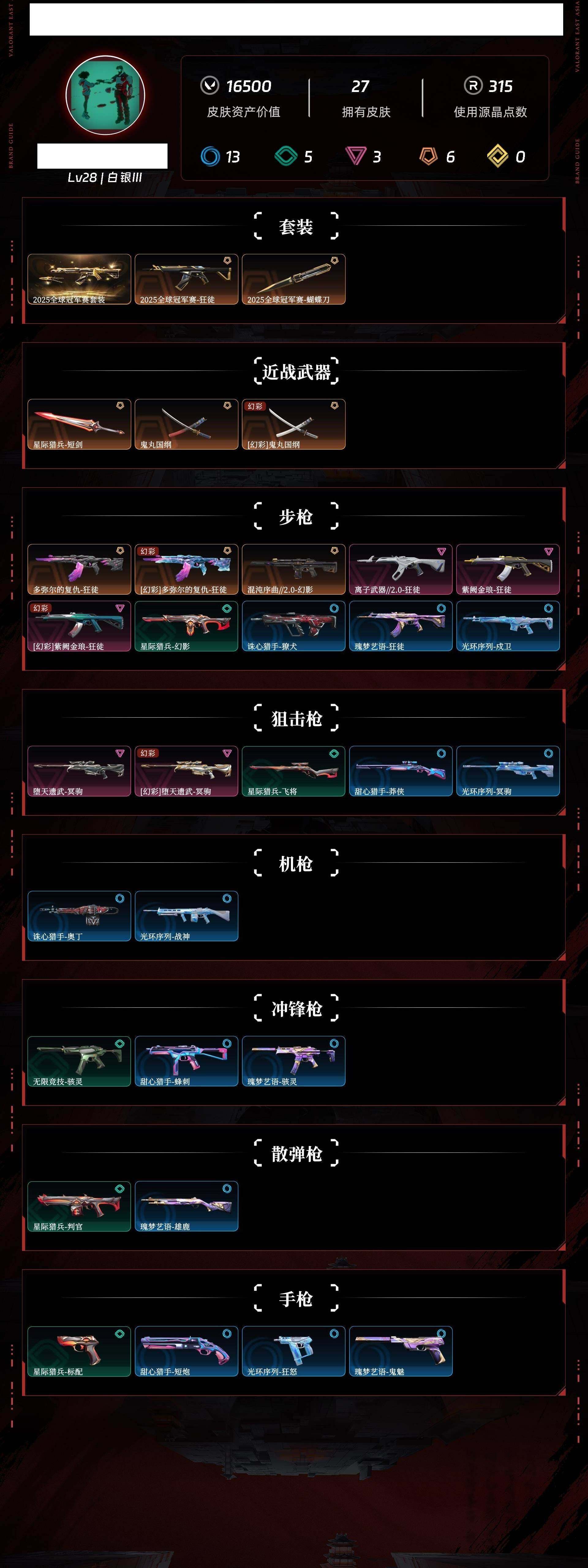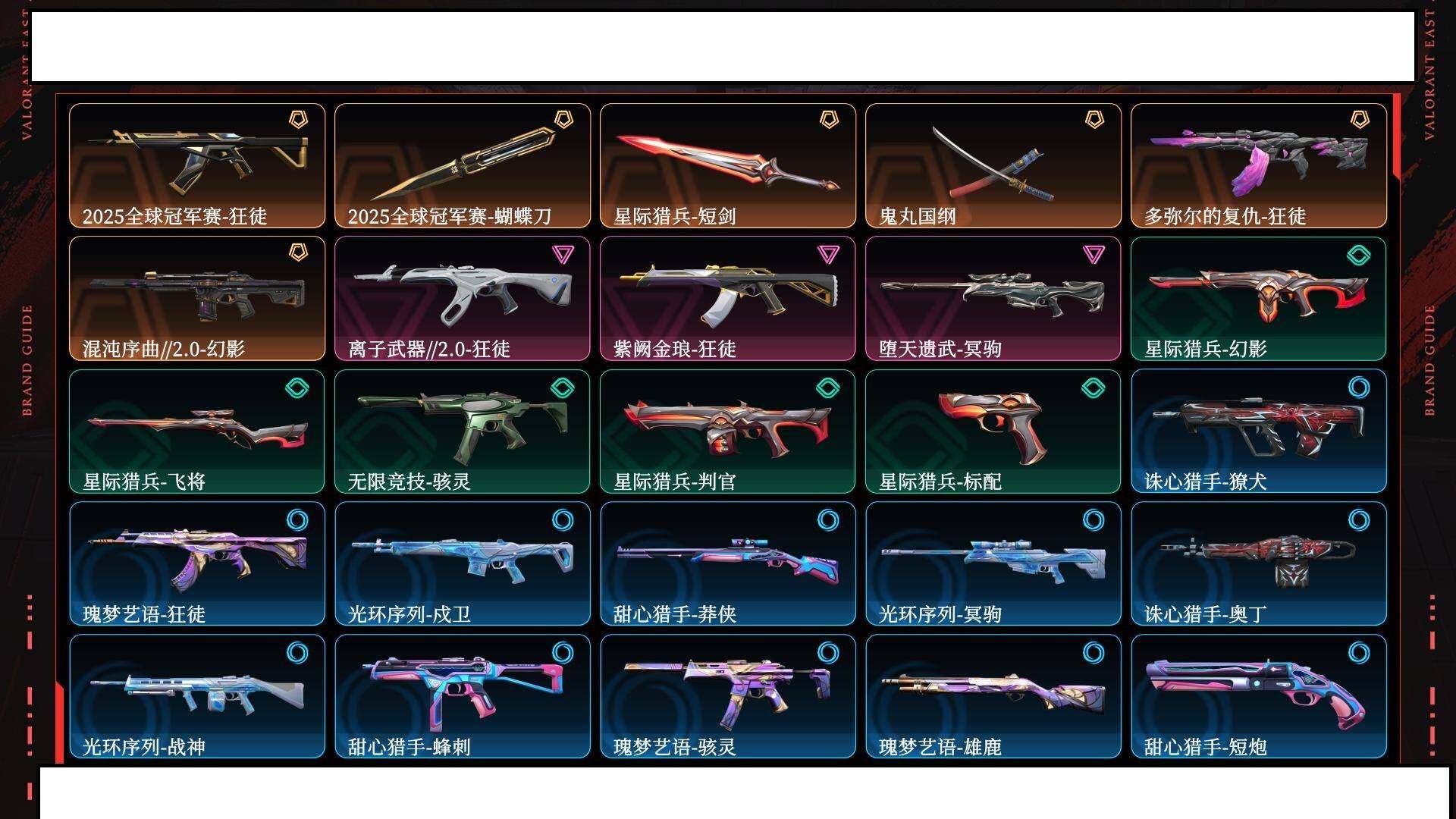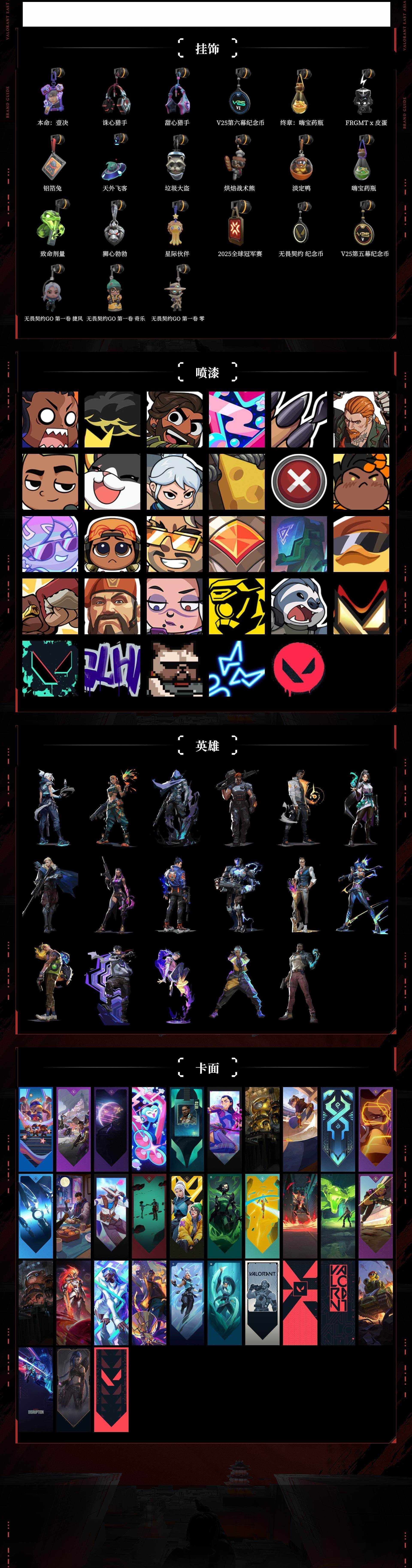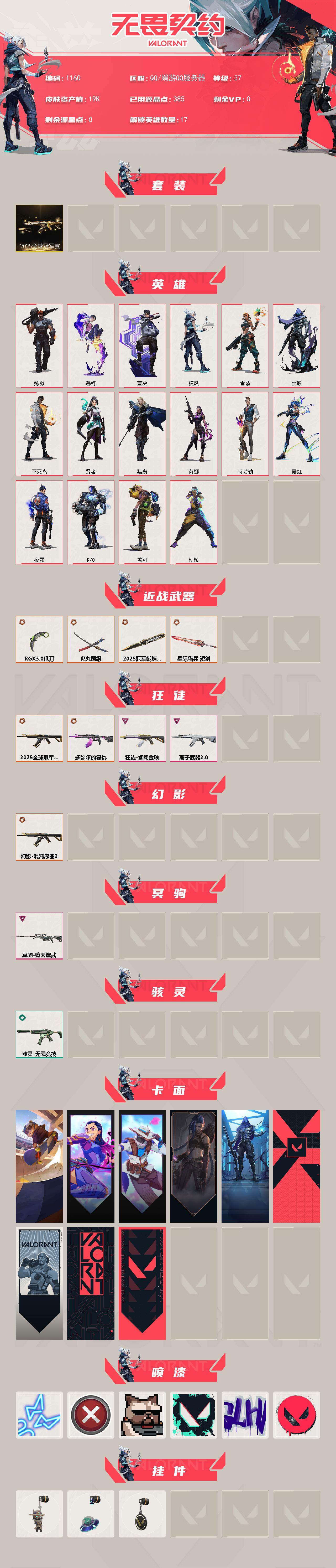 【1160】欢 360109【套装】:2025全球冠军赛套装 【英雄】:幻棱,炼狱,暮蝶,壹决,捷风,雷兹,幽影,不死鸟,贤者,猎枭,芮娜,尚勃勒,霓虹,夜露,k/o,盖可 【近战 武器】:近战武器-2025全球冠军赛 蝴蝶刀,近战武器-rgx 11z pro//3.0 爪刀,近战武器-鬼丸国纲,近战武器-星际猎兵 短剑 【狂徒】:狂徒-2025全球冠军赛,狂徒-多弥尔的复仇,狂徒-紫阙金琅,狂徒-离子武器//2.0 【幻影】:幻影-混沌序曲//2.0 【冥驹】:冥驹-堕天遗武 【骇灵】:骇灵-无限竞技 【卡面】:clutch 卡面,无畏契约go!第一卷:芮娜 卡面,无畏契约go!第一卷:零 卡面,《双城之战》金克丝 卡面,暗呛 卡面,代号红色 卡面,新兵报到 卡面,v契约 卡面,无畏契约 卡面 【喷漆】:霓光四射 喷漆,买装还是存钱 喷漆,关门放狗 喷漆,胜利属于无畏契约 喷漆,glhf 喷漆,无畏契约 喷漆 【挂饰】:无畏契约go!第一卷 零 挂饰,天外飞客 挂饰,无畏契约 纪念币 挂饰