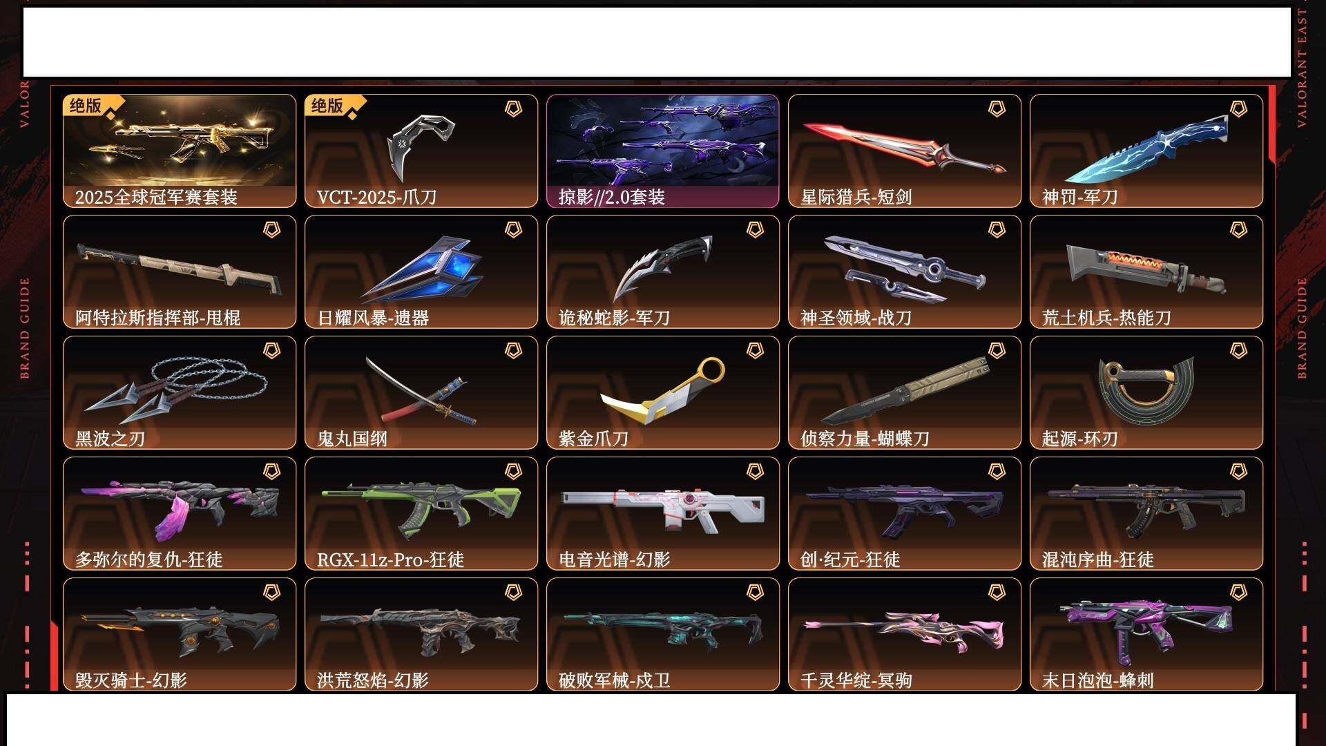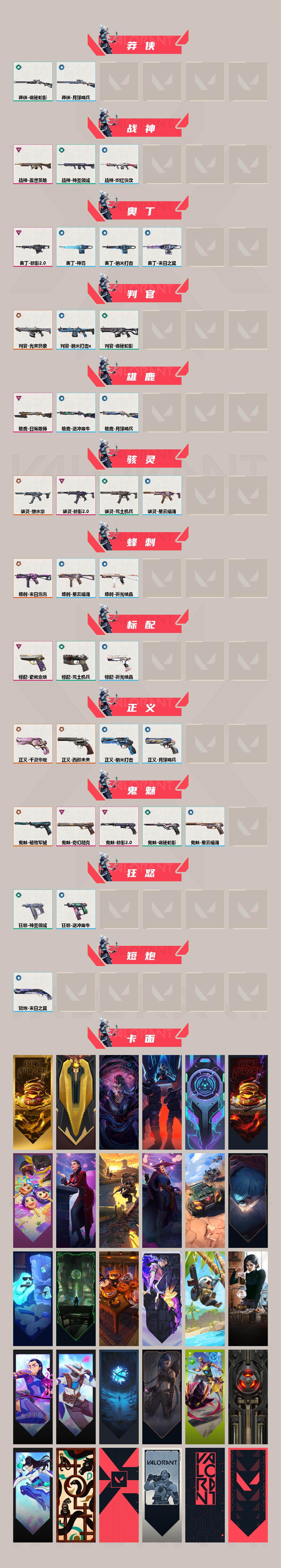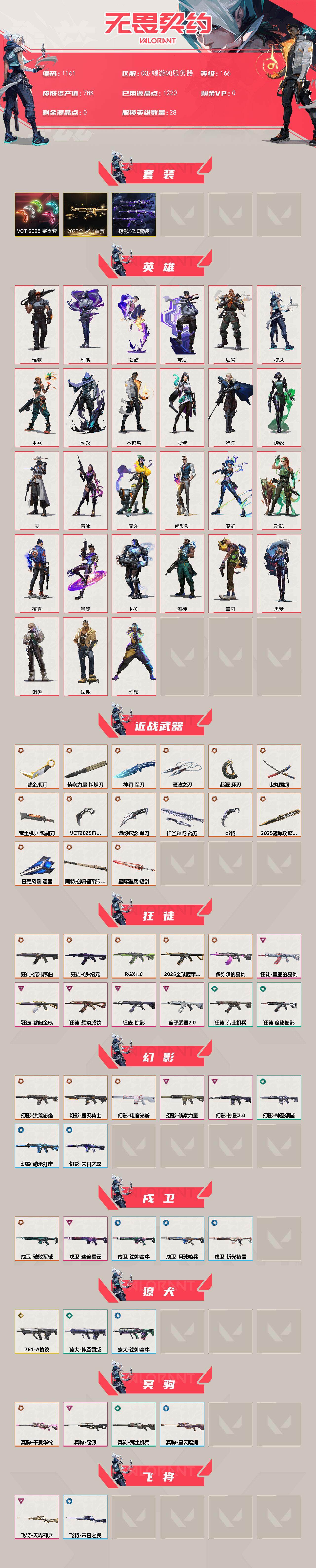 【1161】欢 172889【套装】:2025全球冠军赛套装,vct 2025 赛季套装,掠影//2.0套装 【英雄】:幻棱,炼狱,维斯,暮蝶,钛狐,壹决,铁臂,捷风,雷兹,幽影,不死鸟,贤者,猎枭,蝰蛇,零,芮娜,奇乐,尚勃勒,霓虹,斯凯,夜露,星礈,k/o,海神,盖可,黑梦,钢锁 【近战 武器】:近战武器-2025全球冠军赛 蝴蝶刀,近战武器-影钩,近战武器-侦察力量 蝴蝶刀,近战武器-vct 2025 爪刀,近战武器-紫金爪刀,近战武器-黑波之刃,近战武器-鬼丸国纲,近战武器-荒土机兵 热能刀,近战武器-起源 环刃,近战武器-神罚 军刀,近战武器-诡秘蛇影 军刀,近战武器-神圣领域 战刀,近战武器-日耀风暴 遗器,近战武器-阿特拉斯指挥部 甩棍,近战武器-星际猎兵 短剑 【狂徒】:狂徒-2025全球冠军赛,狂徒-混沌序曲,狂徒-创·纪元,狂徒-rgx 11z pro,狂徒-多弥尔的复仇,狂徒-掠影,狂徒-盖亚的复仇,狂徒-耀鳞威龙,狂徒-紫阙金琅,狂徒-离子武器//2.0,狂徒-荒土机兵,狂徒-诡秘蛇影 【幻影】:幻影-洪荒怒焰,幻影-毁灭骑士,幻影-电音光谱,幻影-侦察力量,幻影-掠影//2.0,幻影-神圣领域,幻影-纳米打击,幻影-末日之翼,幻影-电音光谱 【戍卫】:戍卫-破败军械,戍卫-迷邃星云,戍卫-逆冲蛮牛,戍卫-月球哨兵,戍卫-折光棱晶 【獠犬】:獠犬-781-a协议,獠犬-神圣领域,獠犬-逆冲蛮牛 【冥驹】:冥驹-千灵华绽,冥驹-起源,冥驹-荒土机兵,冥驹-星云暗涌 【飞将】:飞将-天界神兵,飞将-末日之翼 【莽侠】:莽侠-诡秘蛇影,莽侠-月球哨兵 【战神】:战神-盖世英雄,战神-神圣领域,战神-炽红快攻 【奥丁】:奥丁-掠影//2.0,奥丁-纳米打击,奥丁-神罚,奥丁-末日之翼 【判官】:判官-光荣异象,判官-诡秘蛇影,判官-纳米打击x 【雄鹿】:雄鹿-日冕雄师,雄鹿-逆冲蛮牛,雄鹿-月球哨兵 【骇灵】:骇灵-塑水宗,骇灵-掠影//2.0,骇灵-荒土机兵,骇灵-星云暗涌 【蜂刺】:蜂刺-末日泡泡,蜂刺-星云暗涌,蜂刺-折光棱晶 【标配】:标配-紫阙金琅,标配-荒土机兵,标配-折光棱晶 【正义】:正义-千灵华绽,正义-西部未来,正义-纳米打击,正义-月球哨兵 【鬼魅】:鬼魅-破败军械,鬼魅-奇幻朋克,鬼魅-掠影//2.0,鬼魅-诡秘蛇影,鬼魅-星云暗涌 【狂怒】:狂怒-神圣领域,狂怒-逆冲蛮牛 【短炮】:短炮-末日之翼 【卡面】:终章:激斗汉堡 卡面,进入射程 卡面,分崩离析 卡面,纳米打击 卡面,抑制技术 卡面,激斗汉堡 卡面,瓦娃脸雪糕 p2 卡面,从黄昏到黎明 卡面,荒土机兵 卡面,银弹猎手 卡面,逆冲蛮牛 卡面,《双城之战》拥抱 卡面,精灵大战 卡面,欢迎来到底城 卡面,南瓜盛典 卡面,无畏契约:暮蝶 卡面,树懒大作战 卡面,虹吸式咖啡壶 卡面,无畏契约go!第一卷:芮娜 卡面,无畏契约go!第一卷:零 卡面,无垠星环 卡面,《双城之战》金克丝 卡面,势不可挡//盖可 卡面,钢轨卫士 卡面,无畏契约go!第一卷:贤者 卡面,萌彩剪影 卡面,代号红色 卡面,新兵报到 卡面,v契约 卡面,无畏契约 卡面 【喷漆】:小小心意 喷漆,战“素”兔 喷漆,宇宙的指引 喷漆,请求重启 喷漆,逆冲蛮牛 喷漆,纳米打击 喷漆,鼻尖上的蝴蝶 喷漆,简笔画黯兽 喷漆,独守蝰腹 喷漆,他们将落荒而逃 喷漆,通缉:战术企鹅 喷漆,荒土机兵 喷漆,别挡我吃球! 喷漆,嗨宝南瓜灯 喷漆,嘭! 喷漆,都算到了 喷漆,控场勿近 喷漆,伤心心 喷漆,倒吸一口凉气 喷漆,买装还是存钱 喷漆,关门放狗 喷漆,无畏契约go!第一卷:芮娜 喷漆,放下武器 喷漆,胜利属于无畏契约 喷漆,glhf 喷漆,无畏契约 喷漆 【挂饰】:终章:猫猫木乃伊 挂饰,荒土机兵 挂饰,悠闲鸡块 挂饰,猫猫木乃伊 挂饰,水壶 挂饰,纳米打击 挂饰,逆冲蛮牛 挂饰,可爱糖糖 挂饰,伞绳 挂饰,《双城之战》小蛋糕 挂饰,第九季//第三幕 纪念币 挂饰,动力机箱 挂饰,天外飞客 挂饰,《双城之战》魄罗 挂饰,无畏契约 纪念币 挂饰