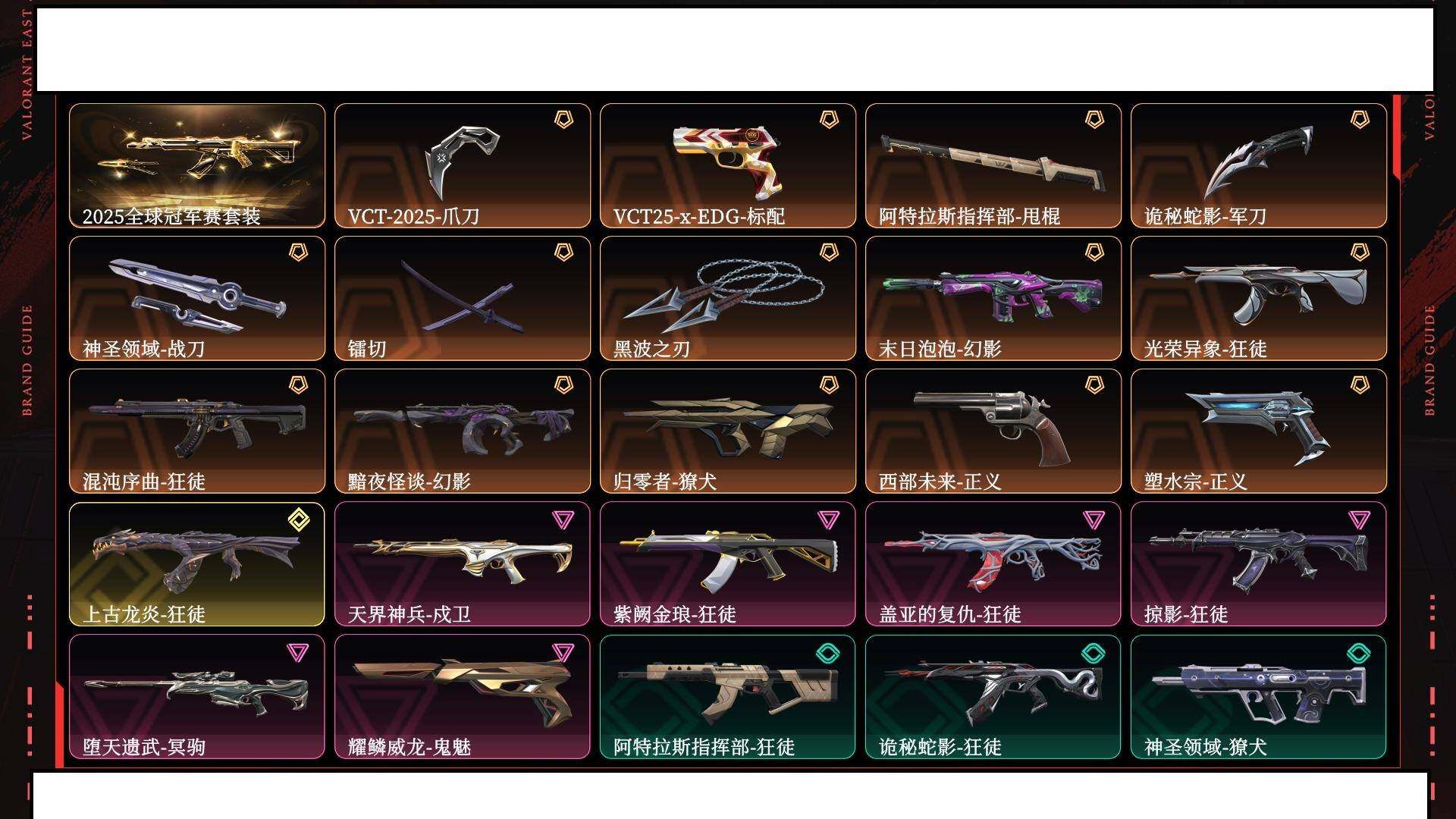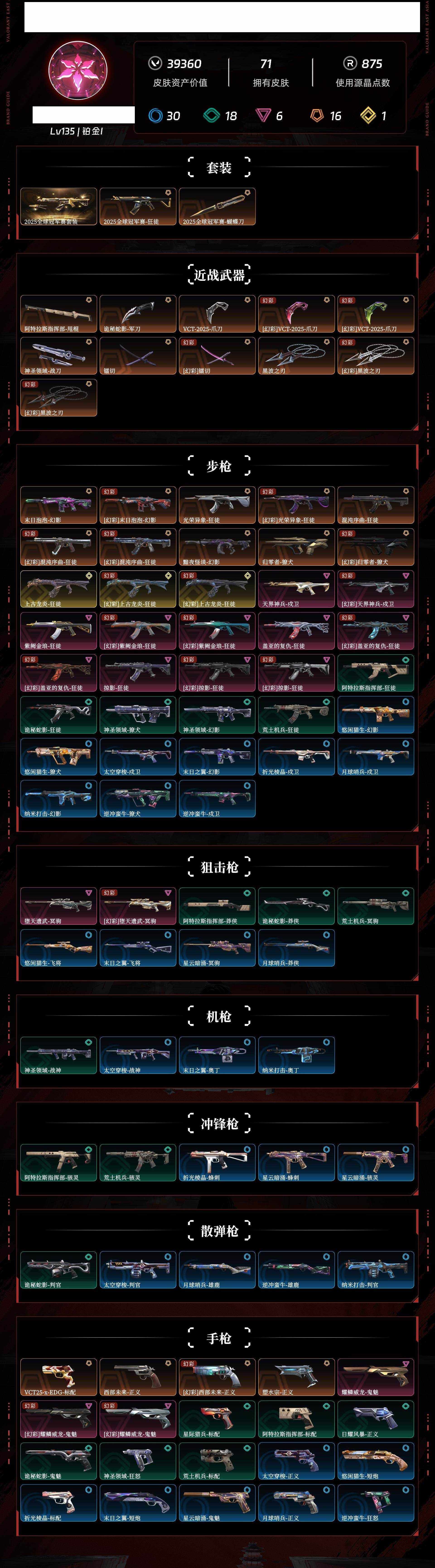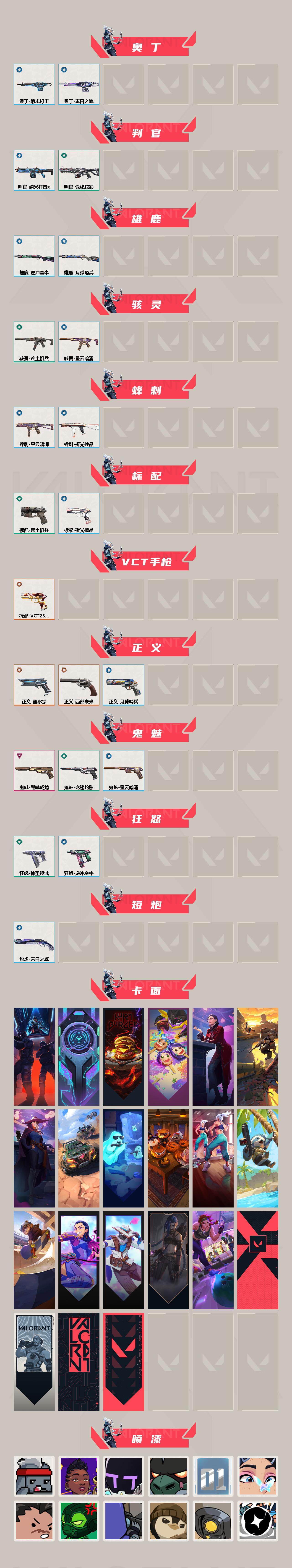 【1162】欢 364746【套装】:2025全球冠军赛套装,vct 2025 赛季套装 【英雄】:幻棱,炼狱,维斯,暮蝶,钛狐,壹决,铁臂,捷风,雷兹,幽影,不死鸟,贤者,猎枭,蝰蛇,零,芮娜,奇乐,尚勃勒,霓虹,斯凯,夜露,星礈,k/o,海神,盖可,黑梦,钢锁 【近战 武器】:近战武器-2025全球冠军赛 蝴蝶刀,近战武器-vct 2025 爪刀,近战武器-黑波之刃,近战武器-镭切,近战武器-诡秘蛇影 军刀,近战武器-神圣领域 战刀,近战武器-阿特拉斯指挥部 甩棍 【狂徒】:狂徒-上古龙炎,狂徒-2025全球冠军赛,狂徒-混沌序曲,狂徒-光荣异象,狂徒-掠影,狂徒-盖亚的复仇,狂徒-紫阙金琅,狂徒-荒土机兵,狂徒-诡秘蛇影 【幻影】:幻影-黯夜怪谈,幻影-末日泡泡,幻影-神圣领域,幻影-纳米打击,幻影-末日之翼 【戍卫】:戍卫-天界神兵,戍卫-逆冲蛮牛,戍卫-月球哨兵,戍卫-折光棱晶 【獠犬】:獠犬-归零者,獠犬-神圣领域,獠犬-逆冲蛮牛 【冥驹】:冥驹-堕天遗武,冥驹-荒土机兵,冥驹-星云暗涌 【飞将】:飞将-末日之翼 【莽侠】:莽侠-诡秘蛇影,莽侠-月球哨兵 【战神】:战神-神圣领域 【奥丁】:奥丁-纳米打击,奥丁-末日之翼 【判官】:判官-诡秘蛇影,判官-纳米打击x 【雄鹿】:雄鹿-逆冲蛮牛,雄鹿-月球哨兵 【骇灵】:骇灵-荒土机兵,骇灵-星云暗涌 【蜂刺】:蜂刺-星云暗涌,蜂刺-折光棱晶 【标配】:标配-荒土机兵,标配-折光棱晶 【vct手呛】:标配-vct25 x edg 【正义】:正义-塑水宗,正义-西部未来,正义-月球哨兵 【鬼魅】:鬼魅-耀鳞威龙,鬼魅-诡秘蛇影,鬼魅-星云暗涌 【狂怒】:狂怒-神圣领域,狂怒-逆冲蛮牛 【短炮】:短炮-末日之翼 【卡面】:纳米打击 卡面,抑制技术 卡面,激斗汉堡 卡面,瓦娃脸雪糕 p2 卡面,从黄昏到黎明 卡面,荒土机兵 卡面,银弹猎手 卡面,逆冲蛮牛 卡面,精灵大战 卡面,南瓜盛典 卡面,热舞环节 卡面,树懒大作战 卡面,clutch 卡面,无畏契约go!第一卷:芮娜 卡面,无畏契约go!第一卷:零 卡面,《双城之战》金克丝 卡面,一击全倒 卡面,代号红色 卡面,新兵报到 卡面,v契约 卡面,无畏契约 卡面 【喷漆】:战“素”兔 喷漆,宇宙的指引 喷漆,请求重启 喷漆,逆冲蛮牛 喷漆,纳米打击 喷漆,鼻尖上的蝴蝶 喷漆,简笔画黯兽 喷漆,独守蝰腹 喷漆,他们将落荒而逃 喷漆,通缉:战术企鹅 喷漆,荒土机兵 喷漆,别挡我吃球! 喷漆,嗨宝南瓜灯 喷漆,控场勿近 喷漆,买装还是存钱 喷漆,胜利属于无畏契约 喷漆,glhf 喷漆,无畏契约 喷漆 【挂饰】:悠闲鸡块 挂饰,猫猫木乃伊 挂饰,水壶 挂饰,纳米打击 挂饰,逆冲蛮牛 挂饰,可爱糖糖 挂饰,伞绳 挂饰,第九季//第三幕 纪念币 挂饰,无畏契约go!第一卷 芮娜 挂饰,薰衣草之心 挂饰,z世代特饮 挂饰,vct x edg 挂饰,天外飞客 挂饰,《双城之战》魄罗 挂饰,插电音乐 挂饰,无畏契约 纪念币 挂饰