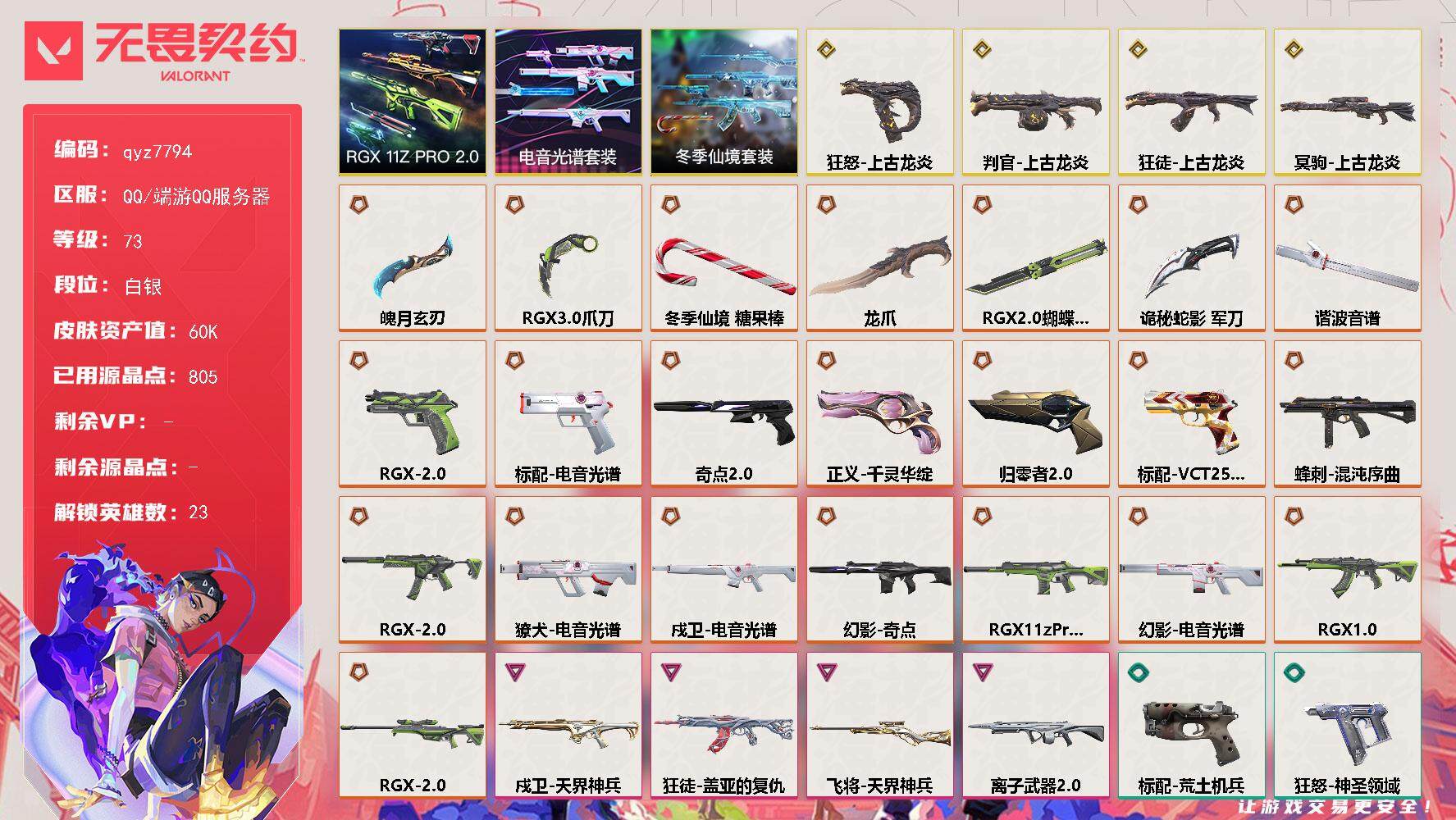 【qyz7794】精品73级白银小号-低价捡漏出喜欢的来吧-qyz7794-套装:-上古龙炎套装rgx-11z-pro//20电音光谱-近战武器皮肤:-魄月玄刃爪刀-rgx-11z-pro-30冬季仙境糖果棒龙爪rgx-11z-pro//20-蝴蝶刀诡秘蛇影谐波音谱-步呛皮肤:-幻影-奇点狂徒-盖亚的复仇戍卫-天界神兵狂徒-上古龙炎幻影-rgx-11z-pro//20幻影-电音光谱戍卫-电音光谱獠犬-电音光谱狂徒-rgx-11z-pro-佩呛皮肤:-正义-千灵华绽鬼魅-奇点//20正义-归零者//20狂怒-上古龙炎标配-vct25xedg标配-rgx-11z-pro//20标配-电音光谱-狙击呛皮肤:-飞将-天界神兵冥驹-上古龙炎冥驹-rgx-11z-pro//20-冲锋呛皮肤:-蜂刺-混沌序曲骇灵-rgx-11z-pro//20-霰弹呛皮肤:-判官-上古龙炎-机呛皮肤:-战神-离子武器20-亮点:-【qyz7794】【套装】:上古龙炎套装,电音光谱套装,rgx-11z-pro//20套装,冬季仙境套装【英雄】:幻棱,炼狱,维斯,暮蝶,钛狐,壹决,捷风,雷兹,不死鸟,贤者,猎枭,蝰蛇,零,芮娜,奇乐,尚勃勒,霓虹,斯凯,夜露,盖可,黑梦,钢锁【近战-武器】:近战武器-谐波音谱,近战武器-rgx-11z-pro//20-蝴蝶刀,近战武器-rgx-11z-pro//30-爪刀,近战武器-龙爪,近战武器-魄月玄刃,近战武器-冬季仙境-糖果棒,近战武器-诡秘蛇影-军刀【狂徒】:狂徒-上古龙炎,狂徒-rgx-11z-pro,狂徒-盖亚的复仇,狂徒-冬季仙境,狂徒-诡秘蛇影【幻影】:幻影-奇点,幻影-rgx-11z-pro//20,幻影-电音光谱,幻影-冬季仙境,幻影-神圣领域,幻影-末日之翼,幻影-电音光谱【戍卫】:戍卫-电音光谱,戍卫-天界神兵,戍卫-月球哨兵,戍卫-折光棱晶,戍卫-电音光谱【獠犬】:獠犬-电音光谱,獠犬-神圣领域,獠犬-逆冲蛮牛,獠犬-电音光谱【冥驹】:冥驹-上古龙炎,冥驹-rgx-11z-pro//20,冥驹-虎魄春明,冥驹-荒土机兵,冥驹-星云暗涌【飞将】:飞将-天界神兵,飞将-冬季仙境,飞将-末日之翼【莽侠】:莽侠-诡秘蛇影,莽侠-月球哨兵【战神】:战神-离子武器//2