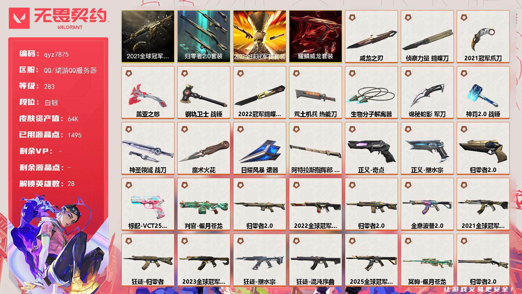 21冠军套-滋滋狂徒混沌狂徒-rgx爪刀-qyz7875-亮点皮肤:-狂徒-2023全球冠军赛狂徒-2021全球冠军赛爪刀-2021全球冠军赛幻影-2022全球冠军赛蝴蝶刀-2022全球冠军赛-套装:-2021全球冠军赛套装耀鳞威龙套装归零者//20套装2022全球冠军赛-近战武器皮肤:-盖亚之怒蝴蝶刀-侦察力量威龙之刃战锤-钢轨卫士荒土机兵热能刀生物分子解离器神圣领域-战刀诡秘蛇影神罚20-战锤魔术火花-步呛皮肤:-狂徒-盖亚的复仇幻影-侦察力量狂徒-归零者狂徒-塑水宗狂徒-耀鳞威龙獠犬-日冕雄师狂徒-全息波普//20狂徒-混沌序曲幻影-归零者//20戍卫-归零者//20-佩呛皮肤:-正义-奇点正义-塑水宗鬼魅-耀鳞威龙正义-归零者//20标配-vct25xblg-狙击呛皮肤:-冥驹-偃月苍龙冥驹-起源莽侠-归零者//20-冲锋呛皮肤:-骇灵-神中神罚-霰弹呛皮肤:-判官-偃月苍龙-机呛皮肤:-奥丁-紫阙金琅20战神-离子武器20-亮点:-【qyz7875】【套装】:2022全球冠军赛套装,2021全球冠军赛套装,归零者//20套装,耀鳞威龙套装【英雄】:幻棱,炼狱,维斯,暮蝶,钛狐,壹决,铁臂,捷风,雷兹,幽影,不死鸟,贤者,猎枭,蝰蛇,零,芮娜,奇乐,尚勃勒,霓虹,斯凯,夜露,星礈,k/o,海神,盖可,黑梦,钢锁【近战-武器】:近战武器-2022全球冠军赛-蝴蝶刀,近战武器-2021全球冠军赛-爪刀,近战武器-魔术火花,近战武器-侦察力量-蝴蝶刀,近战武器-威龙之刃,近战武器-盖亚之怒,近战武器-钢轨卫士-战锤,近战武器-荒土机兵-热能刀,近战武器-生物分子解离器,近战武器-诡秘蛇影-军刀,近战武器-神罚//20-战锤,近战武器-神圣领域-战刀,近战武器-日耀风暴-遗器,近战武器-阿特拉斯指挥部-甩棍,近战武器-魔术火花【狂徒】:狂徒-2025全球冠军赛,狂徒-2023全球冠军赛,狂徒-2021全球冠军赛,狂徒-归零者,狂徒-混沌序曲,狂徒-全息波普//20,狂徒-塑水宗,狂徒-盖亚的复仇,狂徒-耀鳞威龙,狂徒-钢轨卫士,狂徒-荒土机兵,狂徒-诡秘蛇影【幻影】:幻影-2022全球冠军赛,幻影-归零者//20,幻影-侦察力量,幻影-神圣领域,幻影-纳米打击,幻影-战术小伙伴,幻影-末日之翼【戍卫】:戍卫-归零者//2