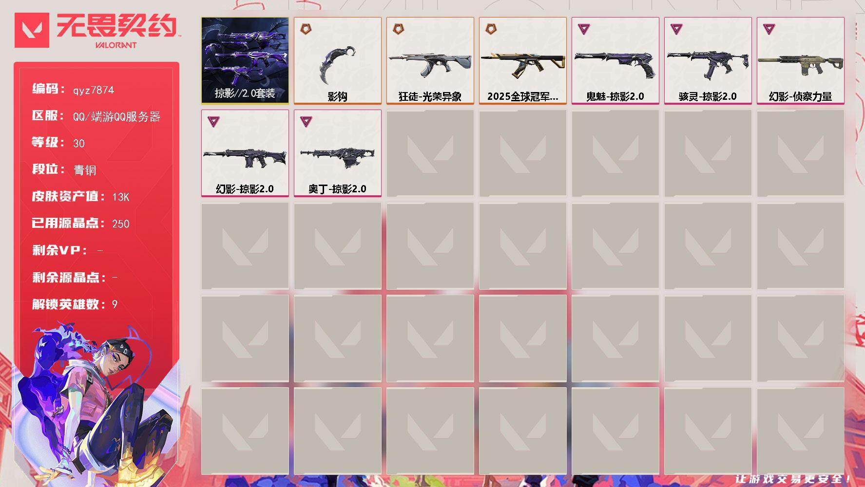 精品30级青铜号-掠夺20/25光荣狂徒-嘎嘎性价比-qyz7874-套装:-掠影20套装-近战武器皮肤:-影钩-步呛皮肤:-幻影-侦察力量狂徒-光荣异象幻影-掠影20-佩呛皮肤:-鬼魅-掠影20-冲锋呛皮肤:-骇灵-掠影20-机呛皮肤:-奥丁-掠影20-亮点:-【qyz7874】【套装】:掠影//20套装【英雄】:炼狱,暮蝶,捷风,不死鸟,贤者,猎枭,芮娜,霓虹,钢锁【近战-武器】:近战武器-影钩【狂徒】:狂徒-2025全球冠军赛,狂徒-光荣异象【幻影】:幻影-侦察力量,幻影-掠影//20【奥丁】:奥丁-掠影//20【骇灵】:骇灵-掠影//20【鬼魅】:鬼魅-掠影//20【卡面】:无畏契约:暮蝶-卡面,无畏契约go!第一卷:零-卡面,代号红色-卡面,新兵报到-卡面,v契约-卡面,无畏契约-卡面【喷漆】:伤心心-喷漆,暴走萝莉-喷漆,战术小伙伴-喷漆,胜利属于无畏契约-喷漆,glhf-喷漆,无畏契约-喷漆【挂饰】:z世代特饮-挂饰,《双城之战》魄罗-挂饰,无畏契约-纪念币-挂饰