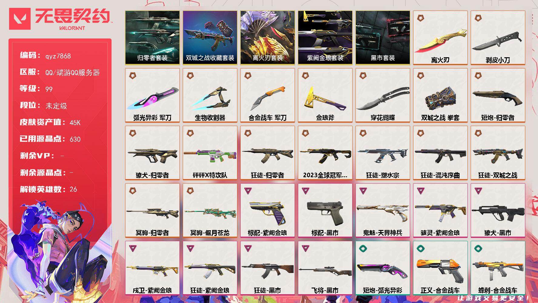 精品离火/单23狂徒未定级小号-喜欢的来吧-qyz7868-亮点皮肤:-离火刃狂徒-2023全球冠军赛-套装:-紫阙金琅套装归零者套装《双城之战》收藏套装黑市套装-近战武器皮肤:-军刀-合金战车金琅斧军刀-弧光异彩生物收割器剥皮小刀拳套-双城之战穿花蝴蝶-步呛皮肤:-戍卫-紫阙金琅幻影-砰砰x特攻队狂徒-紫阙金琅獠犬-归零者狂徒-归零者狂徒-塑水宗狂徒-混沌序曲狂徒-双城之战狂徒-黑市獠犬-黑市-佩呛皮肤:-标配-紫阙金琅短炮-归零者鬼魅-天界神兵标配-黑市-狙击呛皮肤:-冥驹-偃月苍龙冥驹-归零者飞将-黑市-冲锋呛皮肤:-骇灵-紫阙金琅-亮点:-【qyz7868】【套装】:离火刃套装,离火刃套装,《双城之战》收藏套装,归零者套装,紫阙金琅套装,黑市套装【英雄】:幻棱,炼狱,维斯,暮蝶,壹决,铁臂,捷风,雷兹,幽影,不死鸟,贤者,猎枭,蝰蛇,零,芮娜,奇乐,尚勃勒,霓虹,斯凯,夜露,星礈,k/o,海神,盖可,黑梦,钢锁【近战-武器】:近战武器-穿花蝴蝶,近战武器-剥皮小刀,近战武器-离火刃,近战武器-双城之战-拳套,近战武器-合金战车-军刀,近战武器-弧光异彩-军刀,近战武器-金琅斧,近战武器-生物收割器【狂徒】:狂徒-2023全球冠军赛,狂徒-归零者,狂徒-混沌序曲,狂徒-双城之战,狂徒-塑水宗,狂徒-黑市,狂徒-紫阙金琅,狂徒-弧光异彩【幻影】:幻影-砰砰x特攻队,幻影-合金战车,幻影-噬源兽防卫工程【戍卫】:戍卫-紫阙金琅,戍卫-彩梦之城,戍卫-花漾粉红【獠犬】:獠犬-归零者,獠犬-黑市,獠犬-弧光异彩,獠犬-胡桃狂想,獠犬-数码咒术【冥驹】:冥驹-归零者,冥驹-偃月苍龙,冥驹-胡桃狂想,冥驹-花漾粉红【飞将】:飞将-黑市,飞将-合金战车,飞将-沙尘幻旅,飞将-信手涂鸦【战神】:战神-萌彩剪影,战神-数码咒术【奥丁】:奥丁-信手涂鸦【判官】:判官-萌彩剪影,判官-数码咒术【雄鹿】:雄鹿-彩梦之城【骇灵】:骇灵-紫阙金琅,骇灵-沙尘幻旅,骇灵-花漾粉红,骇灵-信手涂鸦【蜂刺】:蜂刺-合金战车,蜂刺-弧光异彩,蜂刺-胡桃狂想【标配】:标配-黑市,标配-紫阙金琅,标配-彩梦之城【正义】:正义-合金战车【鬼魅】:鬼魅-天界神兵,鬼魅-胡桃狂想,鬼魅-数码咒术,鬼魅-信手涂鸦【狂怒】:狂怒-花漾粉红,狂怒-萌彩剪影【短炮】:短炮-归零者,短炮-弧光异彩