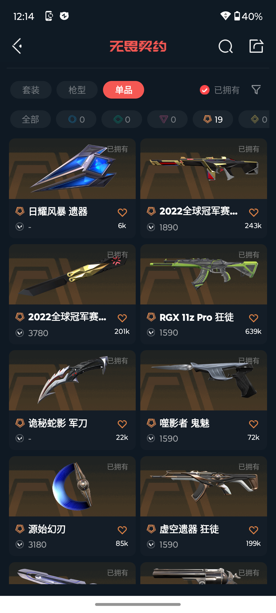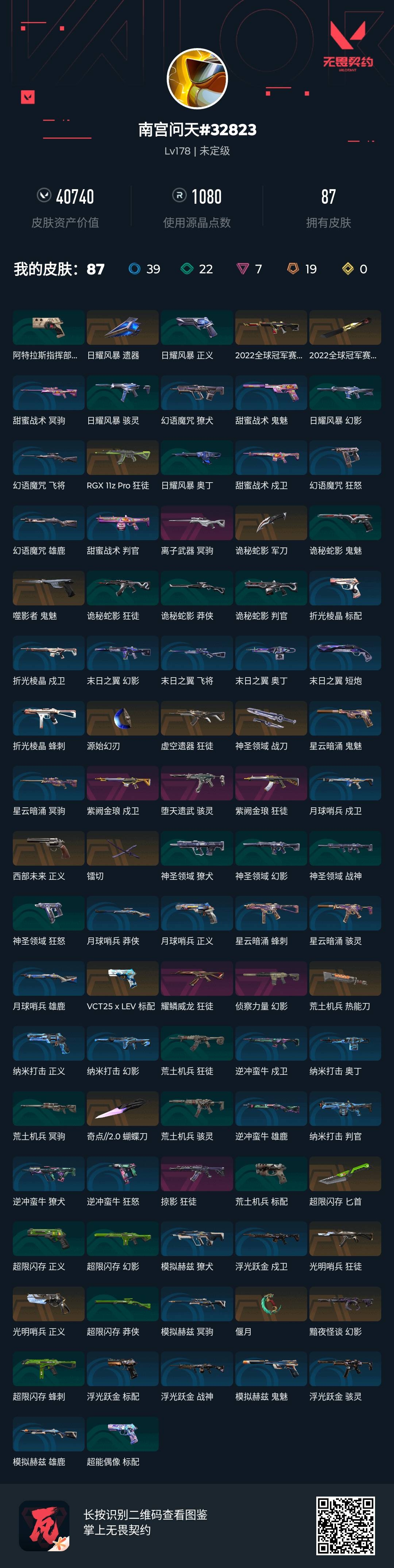 [14381883]b189485 (2022全球冠军赛套装)无畏契约/178等级/未定级/27英雄/87皮肤/40740资产/已使用r点1080/剩余r点70/2022全球冠军赛-幻影2022全球冠军赛-蝴蝶刀,日耀风暴-遗器,诡秘蛇影-军刀,神圣领域-战刀,荒土机兵-热能刀,超限闪存-匕首,源始幻刃,镭切,奇点//2.0-蝴蝶刀,偃月,rgx-11z-pro-狂徒,虚空遗器-狂徒,光明哨兵-狂徒,黯夜怪谈-幻影,紫阙金琅-戍卫,紫阙金琅-狂徒,侦察力量-幻影,耀鳞威龙-狂徒-,掠影-狂徒,离子武器-冥驹,堕天遗武-骇灵,vct25-x-lev-标配,噬影者-鬼魅,西部未来-正义,光明哨兵-正义