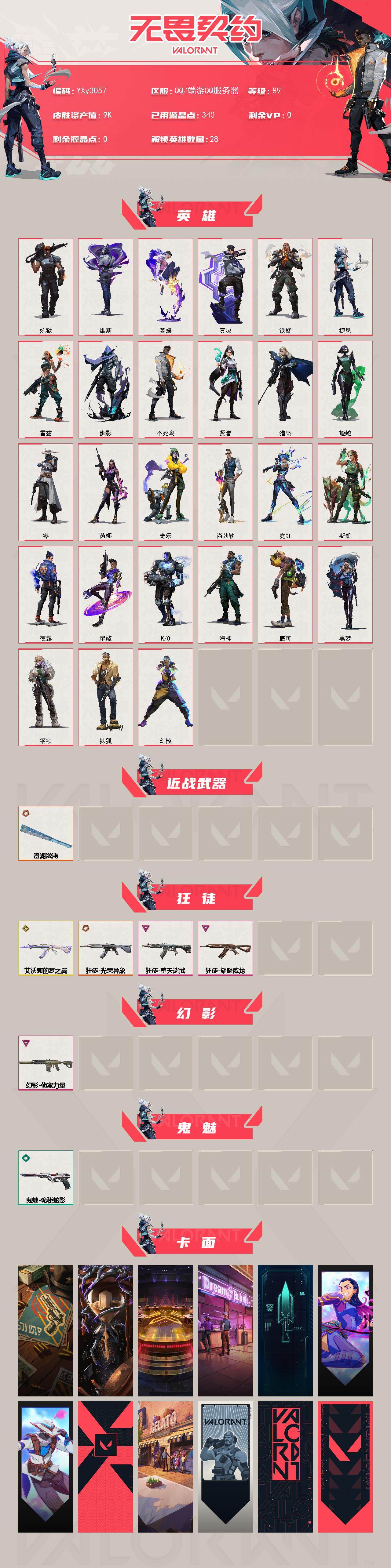【9k库存鱼扇.四狂徒单幻影.猫猫.光荣异象.弃王.威龙.侦查】y3057【无二次】【因赛季更新游戏段付以上号为准!】 【英雄】:幻棱,炼狱,维斯,暮蝶,钛狐,壹决,铁臂,捷风,雷兹,幽影,不死鸟,贤者,猎枭,蝰蛇,零,芮娜,奇乐,尚勃勒,霓虹,斯凯,夜露,星礈,k/o,海神,盖可,黑梦,钢锁 【近战 武器】:近战武器-澄湖潋滟 【狂徒】:狂徒-艾沃莉的梦之翼,狂徒-光荣异象,狂徒-堕天遗