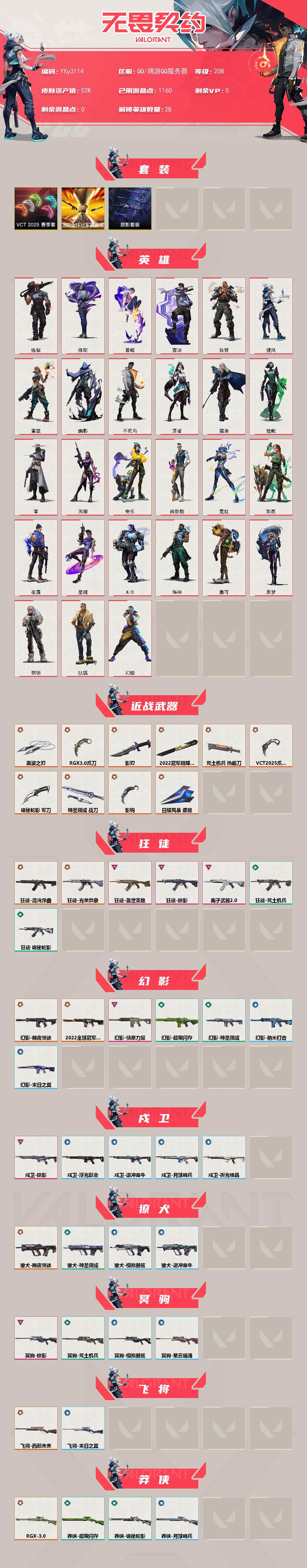 【5.2w库存22冠军套.vct爪刀.掠夺套.黑波之刃.显卡爪.五狂徒三幻影混沌.光荣异象.猴子.离子.古神.侦查】y3114【可二次】【因赛季更新游戏段付以上号为准!】 【套装】:2022全球冠军赛套装,vct 2025 赛季套装,掠影套装 【英雄】:幻棱,炼狱,维斯,暮蝶,钛狐,壹决,铁臂,捷风,雷兹,幽影,不死鸟,贤者,猎枭,蝰蛇,零,芮娜,奇乐,尚勃勒,霓虹,斯凯,夜露,星礈,k/