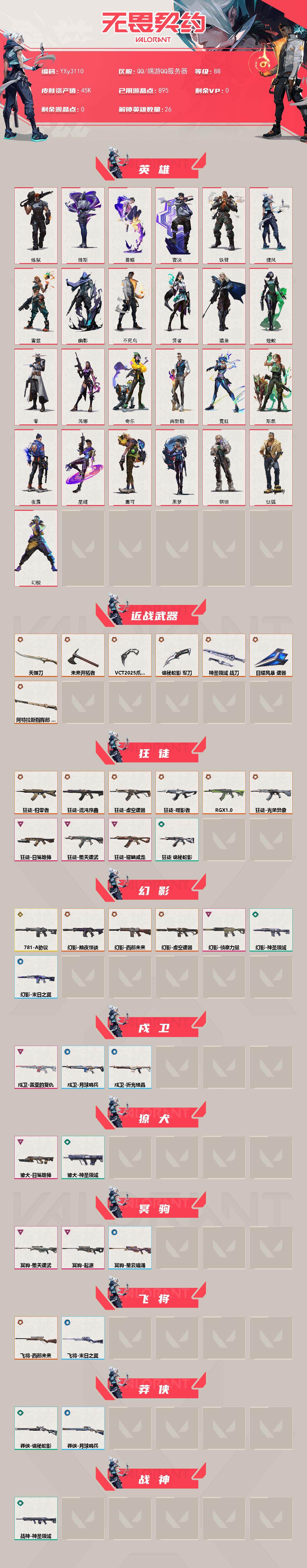 【4.5w库存vct爪刀.天御刀.边陲斧.九狂徒五幻影混沌.虚空.光荣异象.781协议.古神.侦查.起源狙】y3110【无二次】【因赛季更新游戏段付以上号为准!】 【套装】:vct 2025 赛季套装,西部未来套装 【英雄】:幻棱,炼狱,维斯,暮蝶,钛狐,壹决,铁臂,捷风,雷兹,幽影,不死鸟,贤者,猎枭,蝰蛇,零,芮娜,奇乐,尚勃勒,霓虹,斯凯,夜露,星礈,盖可,黑梦,钢锁 【近战 武器】
