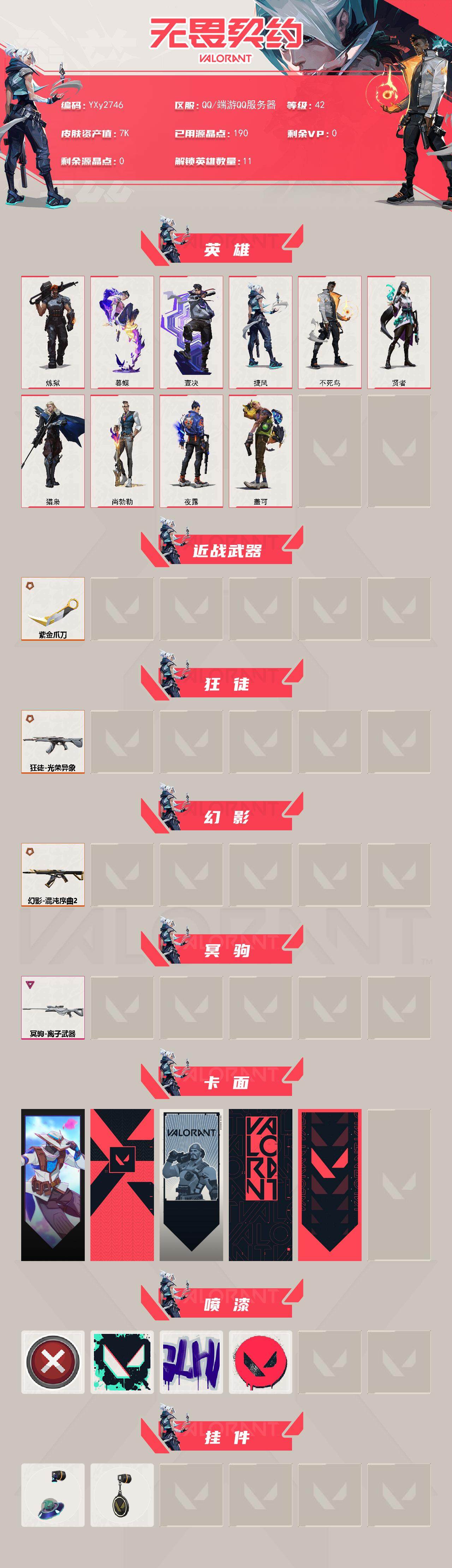 【7k库存性价比小号紫金爪刀.光荣异象.混沌2.0.离子狙】y2746【无二次】【因赛季更新游戏段付以上号为准!】 【英雄】:炼狱,暮蝶,壹决,捷风,不死鸟,贤者,猎枭,尚勃勒,夜露,盖可 【近战 武器】:近战武器-紫金爪刀 【狂徒】:狂徒-光荣异象 【幻影】:幻影-混沌序曲//2.0 【冥驹】:冥驹-离子武器 【卡面】:无畏契约go!第一卷:零 卡面,代号红色 卡面,新兵报到 卡面,v契