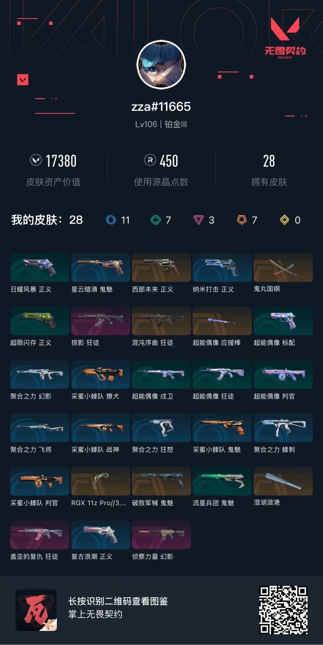 [14345131]7橙皮 3紫皮 28皮肤 27英雄 71卡面 450已用源晶 铂金段位 【近战武器皮肤】:鬼丸国纲爪刀-rgx 11z pro 3.0澄湖潋滟超能偶像 应援棒 【佩呛皮肤】:正义-西部未来鬼魅-破败军械 【步呛皮肤】:狂徒-混沌序曲狂徒-掠影狂徒-盖亚的复仇幻影-