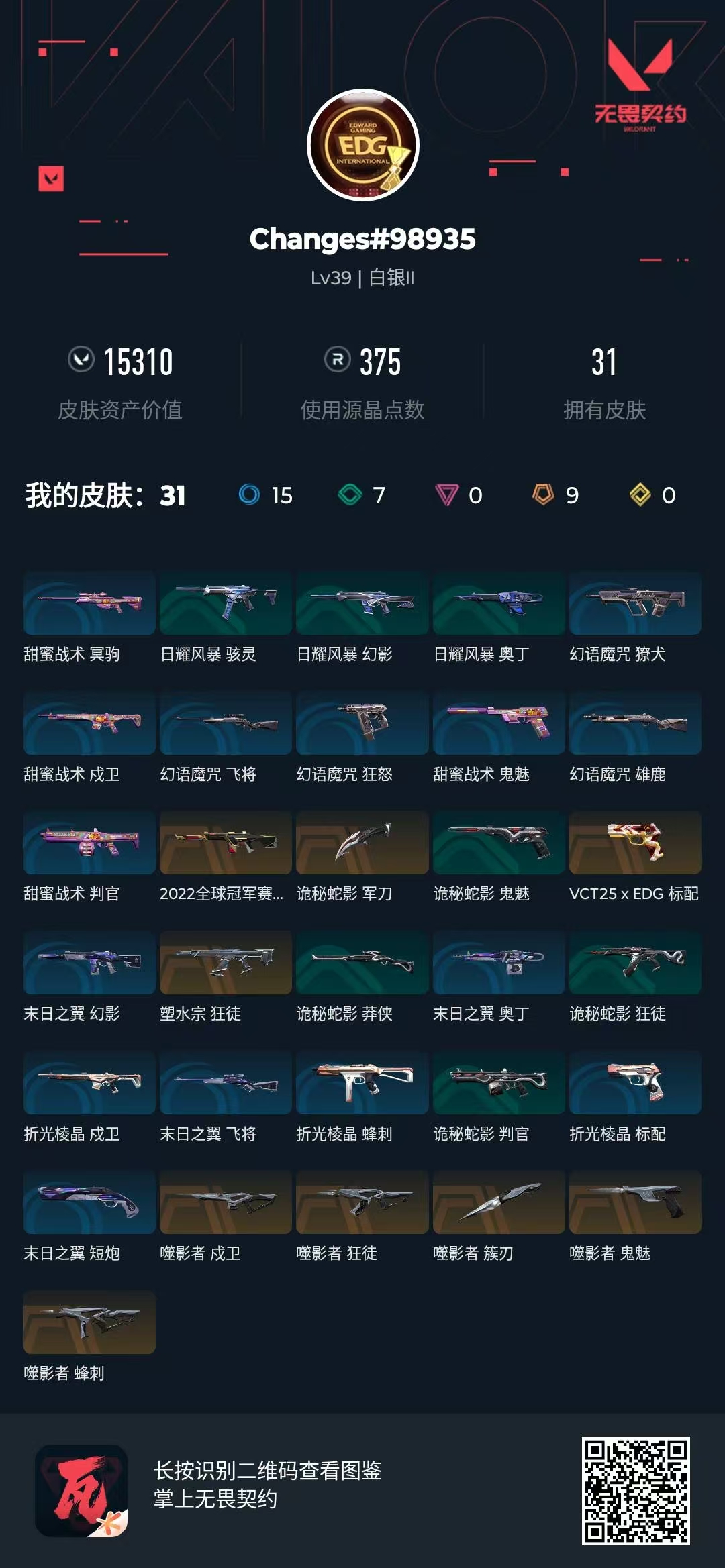 [14395125]s192316(噬影者套装)无畏契约/39等级/白银段位/14英雄/31皮肤/资产15310/已使用r点375/剩余r点25/2022全球冠军赛-幻影,塑水宗-狂徒,诡秘蛇影-军刀,噬影者-狂徒噬影者-戍卫噬影者-蜂刺噬影者-鬼魅噬影者-簇刃,vct25-x-edg-标配