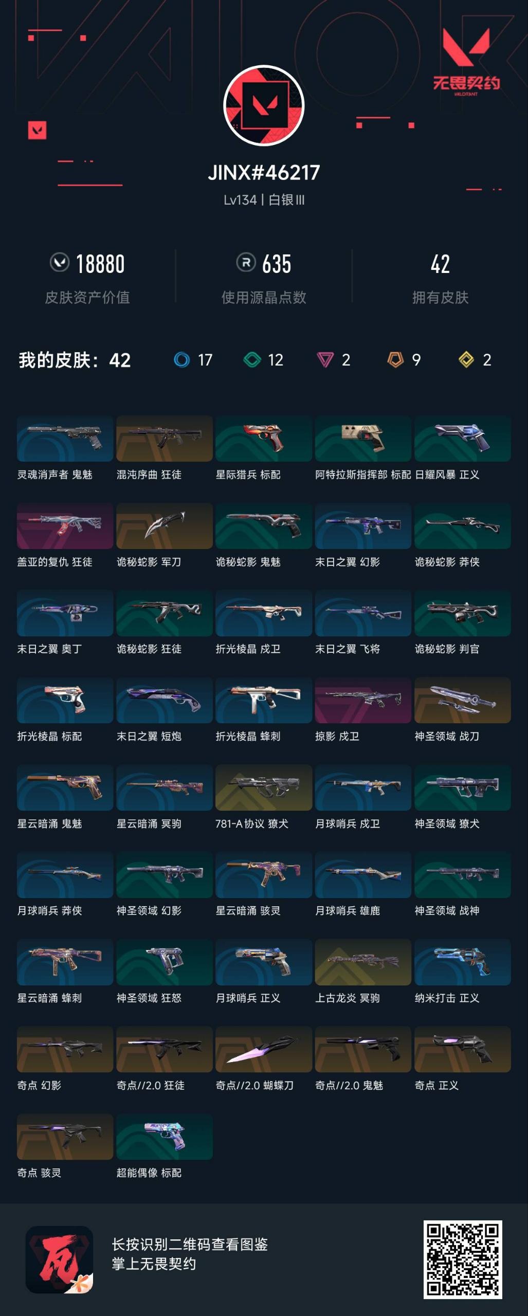 [14397934]9橙皮 2金皮 2紫皮 42皮肤 28英雄 87卡面 635已用源晶 白银段位 【套装】:奇点//2.0套装 【近战武器皮肤】:神圣领域 战刀诡秘蛇影蝴蝶刀-奇点//2.0 【佩呛皮肤】:鬼魅-奇点//2.0正义-奇点 【冲锋呛皮肤】:骇灵-奇点 【步呛皮肤】:戍卫-掠影