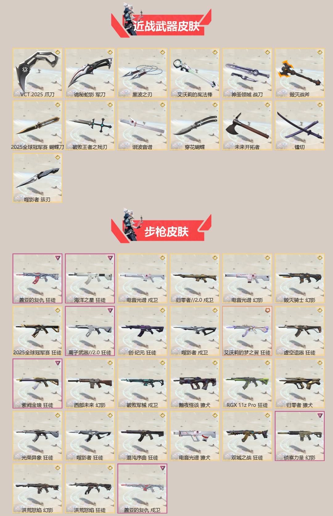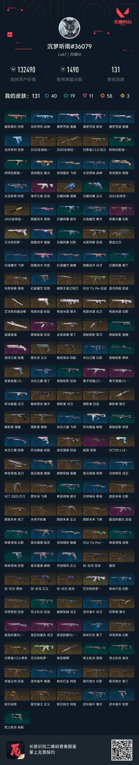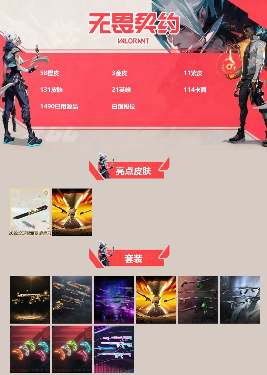 [14398147]58橙皮 3金皮 11紫皮 131皮肤 21英雄 114卡面 1490已用源晶 白银段位 【亮点皮肤】:幻影-2022全球冠军赛蝴蝶刀-2022全球冠军赛 【套装】:毁灭骑士套装电音光谱2025全球冠军赛2022全球冠军赛创·纪元套装噬影者vct 2025赛季礼包