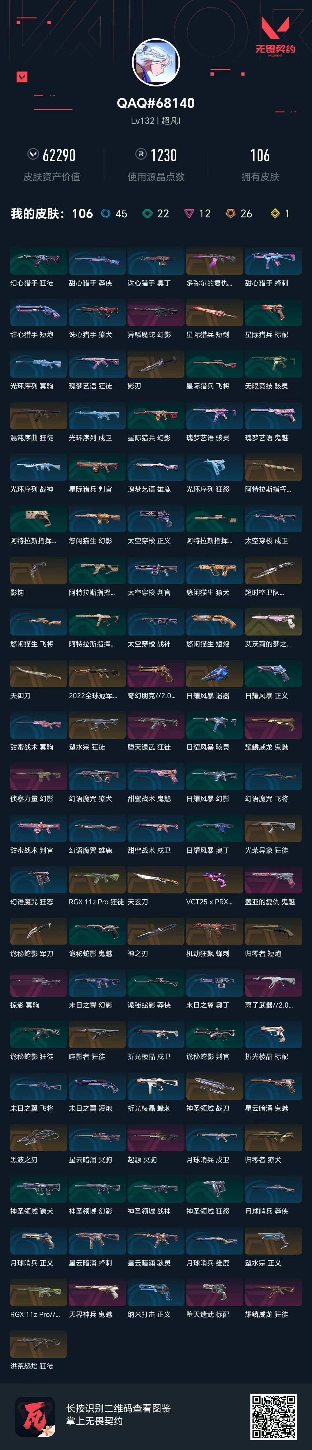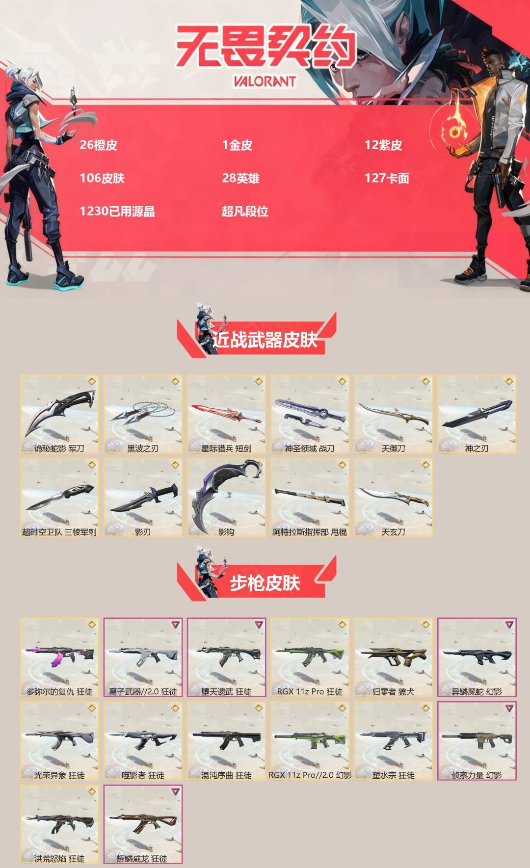 [14399088]26橙皮 1金皮 12紫皮 106皮肤 28英雄 127卡面 1230已用源晶 超凡段位 【近战武器皮肤】:神之刃影刃阿特拉斯指挥部神圣领域 战刀超时空卫队 三棱军刺诡秘蛇影星际猎兵 短剑影钩黑波之刃天御刀天玄刀 【佩呛皮肤】:标配-vct25xprx正义
