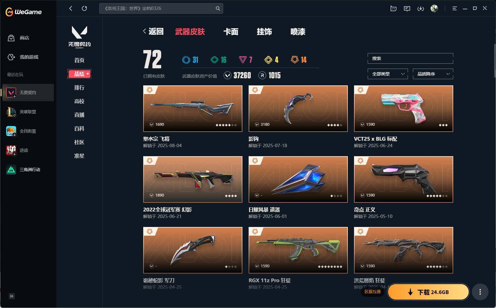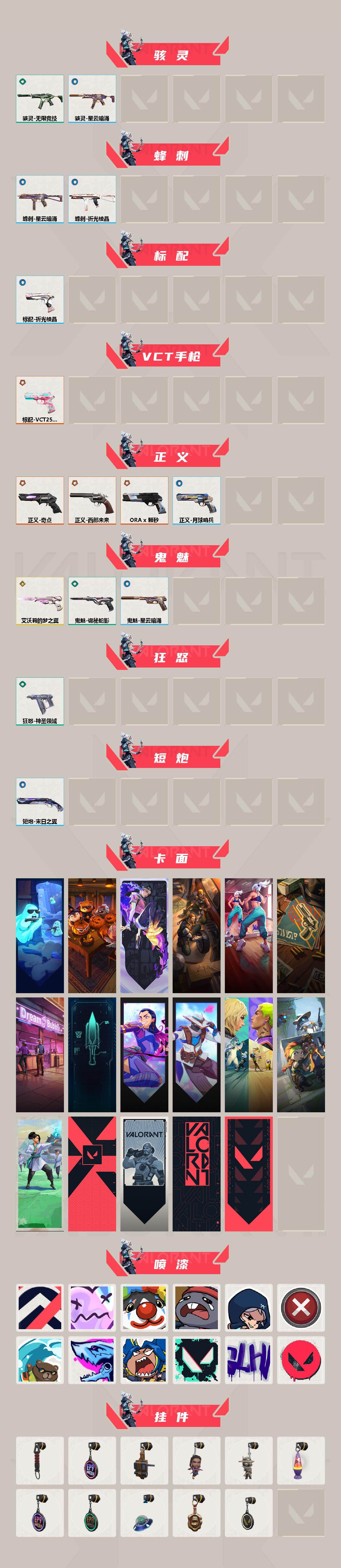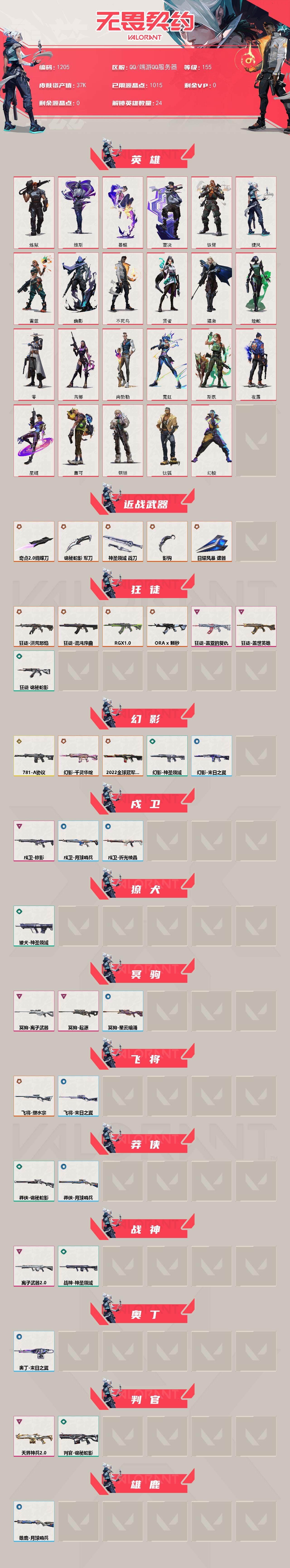 【1205】xq33812 【英雄】:幻棱,炼狱,维斯,暮蝶,钛狐,壹决,铁臂,捷风,雷兹,幽影,不死鸟,贤者,猎枭,蝰蛇,零,芮娜,尚勃勒,霓虹,斯凯,夜露,星礈,盖可,钢锁 【近战 武器】:近战武器-影钩,近战武器-奇点//2.0 蝴蝶刀,近战武器-诡秘蛇影 军刀,近战武器-神圣领域 战刀,近战武器-日耀风暴 遗器 【狂徒】:狂徒-洪荒怒焰,狂徒-混沌序曲,狂徒-rgx 11z pro,狂徒-a x 颗秒,狂徒-盖世英雄,狂徒-盖亚的复仇,狂徒-诡秘蛇影 【幻影】:幻影-781-a协议,幻影-2022全球冠军赛,幻影-千灵华绽,幻影-神圣领域,幻影-末日之翼 【戍卫】:戍卫-掠影,戍卫-月球哨兵,戍卫-折光棱晶 【獠犬】:獠犬-神圣领域 【冥驹】:冥驹-离子武器,冥驹-起源,冥驹-星云暗涌 【飞将】:飞将-塑水宗,飞将-末日之翼 【莽侠】:莽侠-诡秘蛇影,莽侠-月球哨兵 【战神】:战神-离子武器//2.0,战神-神圣领域 【奥丁】:奥丁-末日之翼 【判官】:判官-天界神兵//2.0,判官-诡秘蛇影 【雄鹿】:雄鹿-月球哨兵 【骇灵】:骇灵-无限竞技,骇灵-星云暗涌 【蜂刺】:蜂刺-星云暗涌,蜂刺-折光棱晶 【标配】:标配-折光棱晶 【vct手呛】:标配-vct25 x blg 【正义】:正义-奇点,正义-西部未来,正义-a x 颗秒,正义-月球哨兵 【鬼魅】:鬼魅-艾沃莉的梦之翼,鬼魅-诡秘蛇影,鬼魅-星云暗涌 【狂怒】:狂怒-神圣领域 【短炮】:短炮-末日之翼 【卡面】:精灵大战 卡面,南瓜盛典 卡面,无畏契约:暮蝶 卡面,修车达人 卡面,热舞环节 卡面,正义的化身 卡面,梦幻奶茶 卡面,零点嗅探设计图 卡面,无畏契约go!第一卷:芮娜 卡面,无畏契约go!第一卷:零 卡面,钢锁vs盖可 卡面,别冒尖 卡面,夯实根基 卡面,代号红色 卡面,新兵报到 卡面,v契约 卡面,无畏契约 卡面 【喷漆】:控场勿近 喷漆,伤心心 喷漆,小丑猫 喷漆,熊抱 喷漆,捷风差距 喷漆,买装还是存钱 喷漆,酷熊冲浪 喷漆,暴走萝莉 喷漆,请你冷静点 喷漆 ,胜利属于无畏契约 喷漆,glhf 喷漆,无畏契约 喷漆 【挂饰】:伞绳 挂饰,第九季//第三幕 纪念币 挂饰,工具腰带 挂饰,无畏契约go!第一卷 芮娜 挂饰,无畏契约go!第一卷 零 挂饰,熔岩灯 挂饰,第九季//第二幕 纪念币 挂饰,第八季//第三幕 纪念币 挂饰,天外飞客 挂饰,海豹的认可 挂饰,无畏契约 纪念币 挂饰
