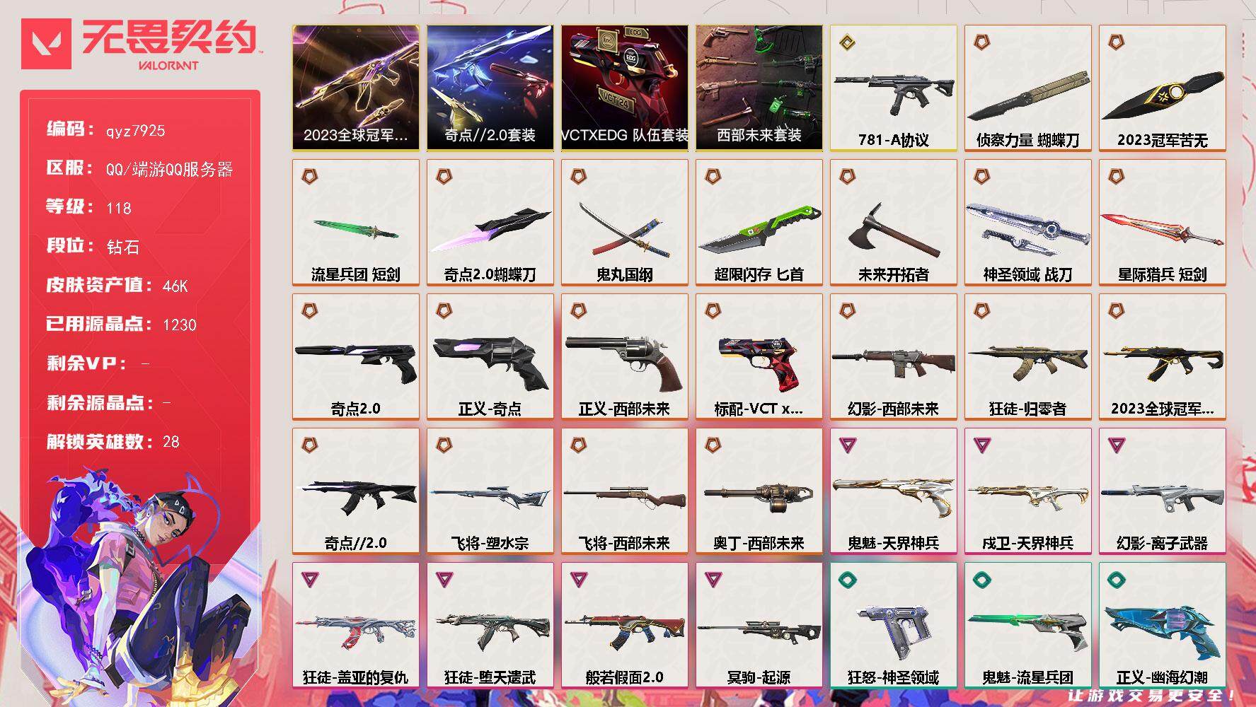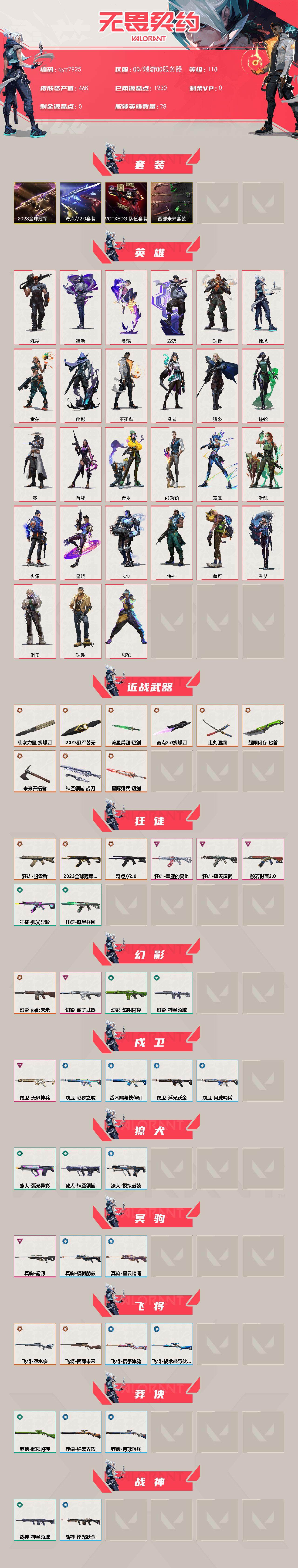 23冠军-侦查-qyz7925-亮点皮肤:-狂徒-2023全球冠军赛苦无-2023全球冠军赛-套装:-2023全球冠军赛套装奇点//20套装vctcn2025套装西部未来-近战武器皮肤:-蝴蝶刀-侦察力量短剑-流星兵团匕首-超限闪存蝴蝶刀-奇点//20鬼丸国纲神圣领域-战刀未来开拓者-步呛皮肤:-狂徒-盖亚的复仇狂徒-归零者戍卫-天界神兵狂徒-堕天遗武幻影-离子武器狂徒-奇点//20狂徒-般若假面//20幻影-西部未来-佩呛皮肤:-正义-奇点鬼魅-天界神兵标配-vctxedg鬼魅-奇点//20正义-西部未来-狙击呛皮肤:-冥驹-起源飞将-塑水宗飞将-西部未来-冲锋呛皮肤:-骇灵-781-a协议-机呛皮肤:-奥丁-西部未来-亮点:-【qyz7925】【套装】:2023全球冠军赛套装,西部未来套装,奇点//20套装,vctxedg-队伍套装【英雄】:幻棱,炼狱,维斯,暮蝶,钛狐,壹决,铁臂,捷风,雷兹,幽影,不死鸟,贤者,猎枭,蝰蛇,零,芮娜,奇乐,尚勃勒,霓虹,斯凯,夜露,星礈,k/o,海神,盖可,黑梦,钢锁【近战-武器】:近战武器-2023全球冠军赛-苦无,近战武器-侦察力量-蝴蝶刀,近战武器-奇点//20-蝴蝶刀,近战武器-鬼丸国纲,近战武器-未来开拓者,近战武器-流星兵团-短剑,近战武器-超限闪存-匕首,近战武器-神圣领域-战刀,近战武器-星际猎兵-短剑【狂徒】:狂徒-2023全球冠军赛,狂徒-归零者,狂徒-奇点//20,狂徒-般若假面//20,狂徒-堕天遗武,狂徒-盖亚的复仇,狂徒-弧光异彩,狂徒-流星兵团【幻影】:幻影-西部未来,幻影-离子武器,幻影-超限闪存,幻影-神圣领域,幻影-西部未来【戍卫】:戍卫-天界神兵,戍卫-彩梦之城,戍卫-浮光跃金,戍卫-战术熊与伙伴们,戍卫-月球哨兵【獠犬】:獠犬-弧光异彩,獠犬-神圣领域,獠犬-模拟赫兹【冥驹】:冥驹-起源,冥驹-模拟赫兹,冥驹-星云暗涌【飞将】:飞将-塑水宗,飞将-西部未来,飞将-信手涂鸦,飞将-战术熊与伙伴们【莽侠】:莽侠-超限闪存,莽侠-纤云弄巧,莽侠-月球哨兵【战神】:战神-神圣领域,战神-浮光跃金【奥丁】:奥丁-西部未来,奥丁-流星兵团,奥丁-信手涂鸦【雄鹿】:雄鹿-彩梦之城,雄鹿-模拟赫兹,雄鹿-月球哨兵【骇灵】:骇灵-781-a协议,骇灵-流星兵团