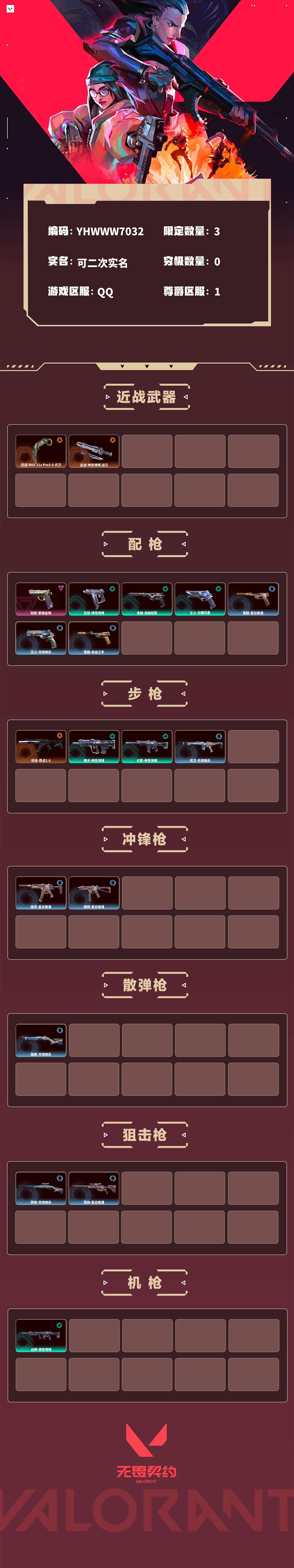 【无畏契约】【yhwww7032】等级:95,已用无畏点6650,已用源晶点205,橙皮:近战-rgx 11z pro3.0 爪刀|狂徒-奇点2.0|近战-神圣领域 战刀__紫皮:标配-紫阙金琅__段位:青铜__蓝皮:鬼魅-星云暗涌|骇灵-星云暗涌|正义-月球哨兵|莽侠-月球哨兵|戍卫-月球哨兵|雄鹿-月球哨兵|鬼魅-命运之手|冥驹-星云暗涌|蜂刺-星云暗涌__绿皮:獠犬-神圣领域|狂怒-神圣领域|战神-神圣领域|幻影-神圣领域|鬼魅-诡秘蛇影|正义-日耀风暴__英雄:尚勃勒|维斯|黑梦|斯凯|暮蝶|盖可|霓虹|壹决|星礈|k/o|幽影|夜露|钢锁|海神|奇乐|炼狱|铁臂|贤者|猎枭|钛狐|芮娜|零|捷风|蝰蛇|不死鸟|幻棱|雷兹