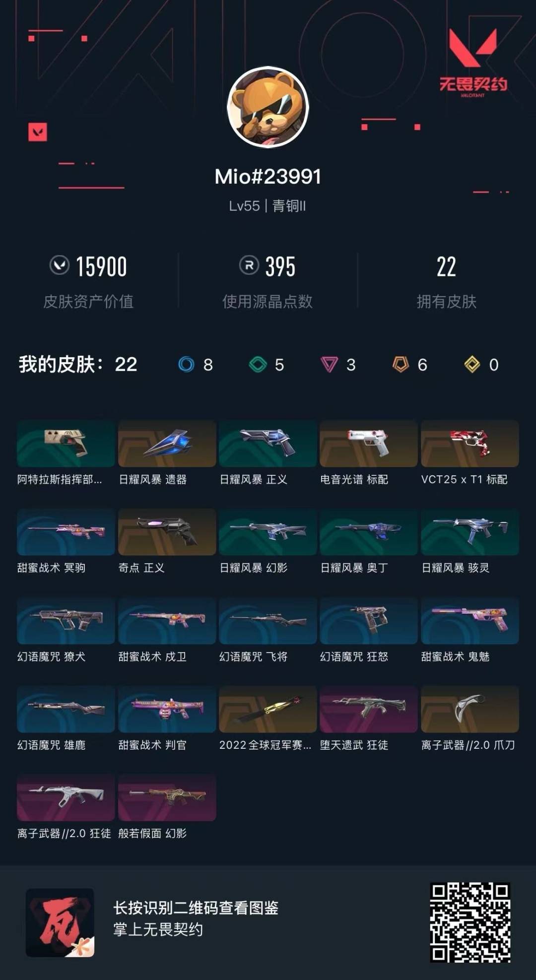 6橙皮 3紫皮 22皮肤 20英雄 55卡面 395已用源晶 青铜段位 【亮点皮肤】:蝴蝶刀-2022全球冠军赛 【近战武器皮肤】:离子武器2.0 爪刀 【佩呛皮肤】:标配-vct25xt1标配-电音光谱正义-奇点 【步呛皮肤】:狂徒-离子武器2.0狂徒-堕天遗武幻影-般若假面