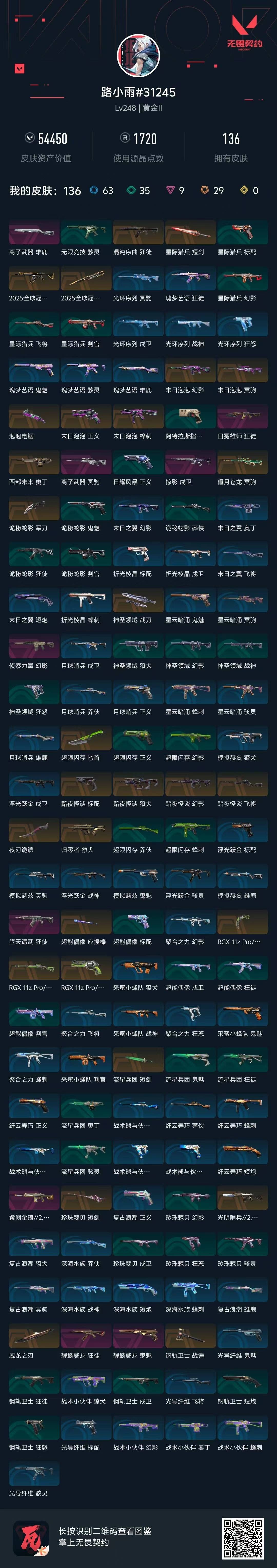 [14554642]29橙皮 9紫皮 136皮肤 28英雄 179卡面 1720已用源晶 黄金段位 【套装】:黯夜怪谈套装2025全球冠军赛耀鳞威龙套装rgx 11z pro//3.0套装 【近战武器皮肤】:匕首-超限闪存战锤-钢轨卫士夜刃诡镰短剑-流星兵团神圣领域 战刀诡秘蛇影泡泡电锯星际猎兵 短剑2025全球冠军赛 蝴蝶刀威龙之刃爪刀-rgx 11z pro 3.0短剑-珍珠棘贝超能偶像 应援棒 【佩呛皮肤】:标配-黯夜怪谈正义-末日泡泡正义-rgx 11z pro 3.0鬼魅-耀鳞威龙 【冲锋呛皮肤】:蜂刺-末日泡泡 【霰弹呛皮肤】:雄鹿-离子武器 【步呛皮肤】:狂徒-混沌序曲獠犬-黯夜怪谈幻影-黯夜怪谈戍卫-掠影2025全球冠军赛 狂徒幻影-末日泡泡狂徒-耀鳞威龙狂徒-堕天遗武狂徒-日冕雄师幻影-侦察力量幻影-紫阙金琅2.0幻影-光明哨兵2.0獠犬-归零者 【狙击呛皮肤】:飞将-黯夜怪谈冥驹-末日泡泡冥驹-偃月苍龙莽侠-rgx 11z pro 3.0冥驹-离子武器 【机呛皮肤】:奥丁-西部未来 【挂饰】:超能偶像挂饰永生玫瑰挂饰袖珍捷风挂饰传世莲华挂饰金属蝶翼挂饰rgx11zpro3.0挂饰2025全球冠军赛挂饰末日泡泡挂饰耀鳞威龙挂饰糖葫芦挂饰云开见日挂饰数码咒术挂饰迷你机甲挂饰终章ko小金人挂饰飞刀挂饰