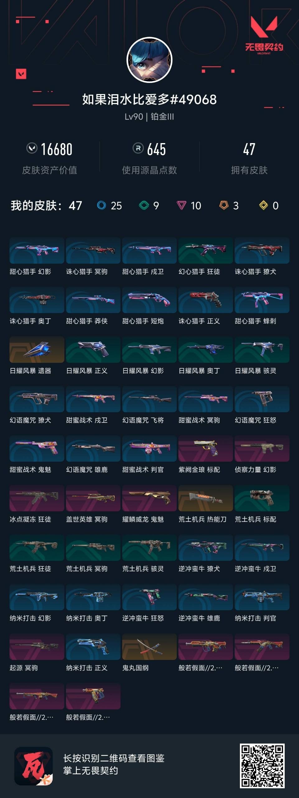 [14574057]3橙皮 10紫皮 47皮肤 19英雄 68卡面 645已用源晶 铂金段位 【套装】:般若假面//2.0套装 【近战武器皮肤】:鬼丸国纲荒土机兵热能刀 【佩呛皮肤】:狂怒-般若假面//2.0鬼魅-耀鳞威龙标配-紫阙金琅 【步呛皮肤】:獠犬-般若假面//2.0狂徒-般若假面//2.0狂徒-冰点凝冻幻影-侦察力量 【狙击呛皮肤】:冥驹-起源冥驹-盖世英雄 【机呛皮肤】:战神-般若假面//2.0 【挂饰】:双城之战小蛋糕挂饰神中神挂饰