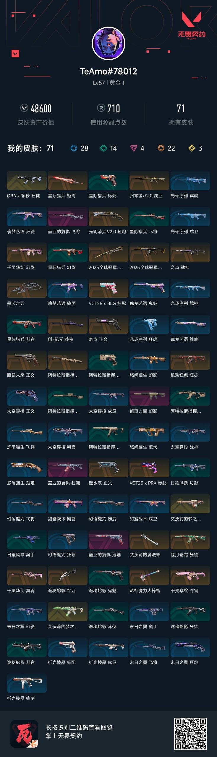 22橙皮 3金皮 4紫皮 71皮肤 21英雄 69卡面 710已用源晶 黄金段位 【套装】:2025全球冠军赛 【近战武器皮肤】:彩虹魔力大棒槌诡秘蛇影阿特拉斯指挥部2025全球冠军赛 蝴蝶刀星际猎兵 短剑黑波之刃艾沃莉的魔法棒 【佩呛皮肤】:标配-vct25xblg标配-vct25