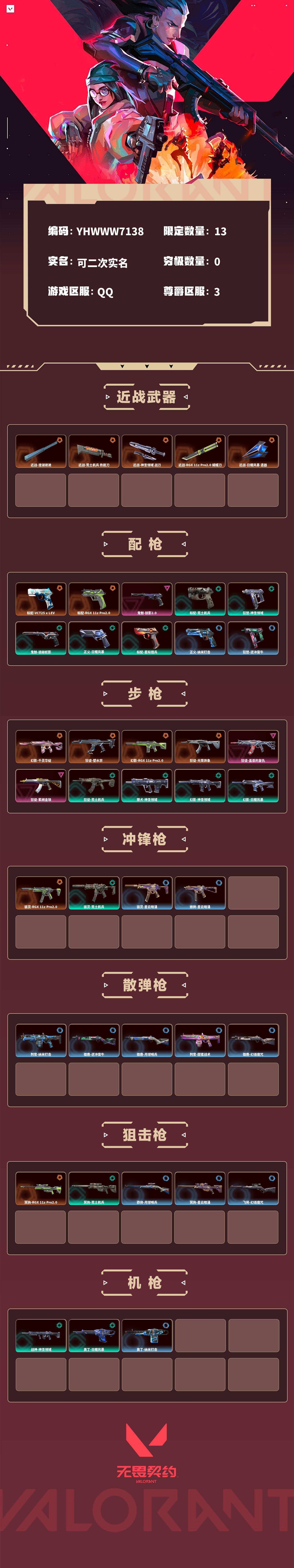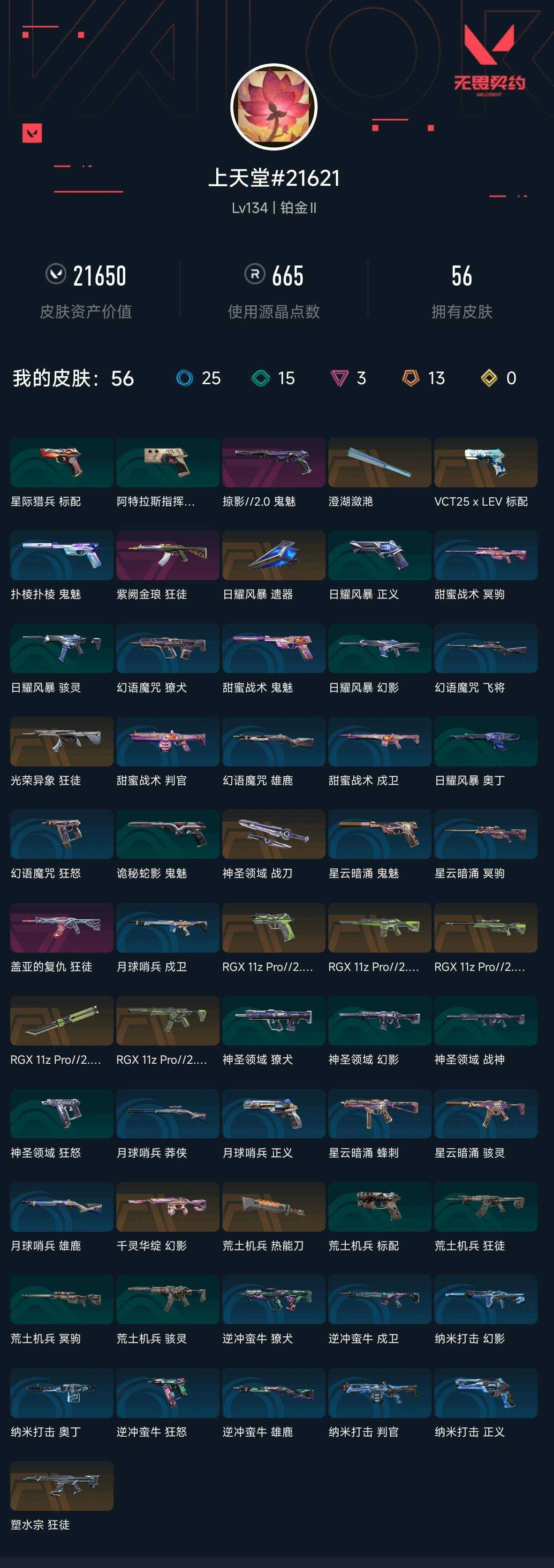 【无畏契约】【yhwww7138】等级:134,已用无畏点21650,已用源晶点665,橙皮:幻影-千灵华绽|近战-澄湖潋滟|狂徒-塑水宗|近战-荒土机兵 热能刀|近战-神圣领域 战刀|标配-vct25 x lev|冥驹-rgx 11z pro2.0|近战-rgx 11z pro2.0 蝴蝶刀|幻影-rgx 11z pro2.0|骇灵-rgx 11z pro2.0|标配-rgx 11z pro2.0|狂徒-光荣异象|近战-日耀风暴 遗器__紫皮:狂徒-盖亚的复仇|狂徒-紫阙金琅|鬼魅-掠影2.0__段位:铂金__蓝皮:判官-纳米打击|正义-纳米打击|奥丁-纳米打击|幻影-纳米打击|雄鹿-逆冲蛮牛|狂怒-逆冲蛮牛|戍卫-逆冲蛮牛|獠犬-逆冲蛮牛|鬼魅-星云暗涌|骇灵-星云暗涌|正义-月球哨兵|莽侠-月球哨兵|戍卫-月球哨兵|雄鹿-月球哨兵|鬼魅-扑棱扑棱|冥驹-星云暗涌|蜂刺-星云暗涌|鬼魅-甜蜜战术|判官-甜蜜战术|戍卫-甜蜜战术|雄鹿-幻语魔咒|獠犬-幻语魔咒|飞将-幻语魔咒|狂怒-幻语魔咒|标配-阿特拉斯指挥部__绿皮:狂徒-荒土机兵|标配-荒土机兵|骇灵-荒土机兵|冥驹-荒土机兵|獠犬-神圣领域|狂怒-神圣领域|战神-神圣领域|幻影-神圣领域|鬼魅-诡秘蛇影|正义-日耀风暴|幻影-日耀风暴|奥丁-日耀风暴|标配-星际猎兵__英雄:尚勃勒|维斯|黑梦|斯凯|暮蝶|盖可|霓虹|壹决|星礈|k/o|幽影|夜露|钢锁|海神|奇乐|炼狱|铁臂|贤者|猎枭|钛狐|芮娜|零|捷风|蝰蛇|不死鸟|幻棱|雷兹|禁灭