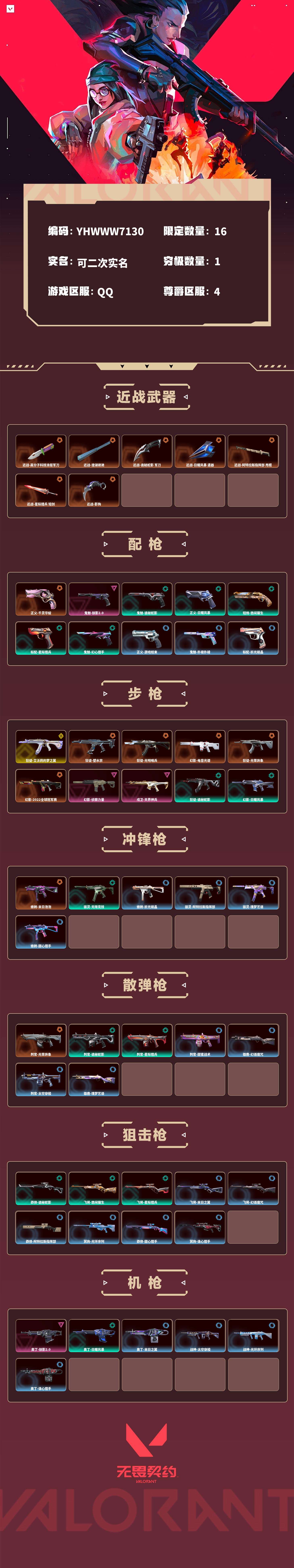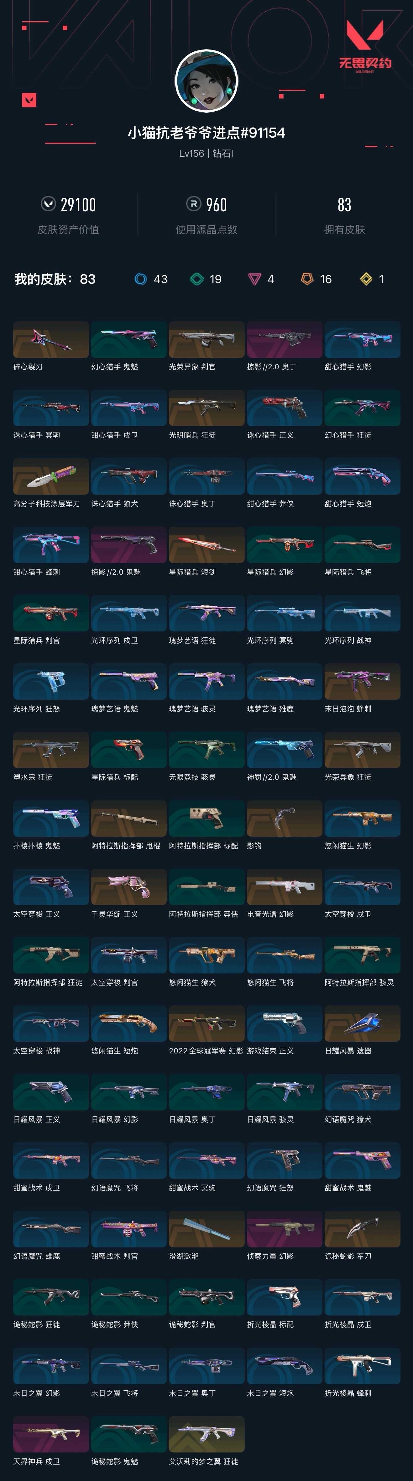 【无畏契约】【yhwww7130】等级:156,已用无畏点29100,已用源晶点960,金皮:狂徒-艾沃莉的梦之翼__橙皮:近战-高分子科技涂层军刀|近战-澄湖潋滟|狂徒-塑水宗|狂徒-光明哨兵|正义-千灵华绽|近战-诡秘蛇影 军刀|幻影-电音光谱|判官-光荣异象|狂徒-光荣异象|近战-日耀风暴 遗器|幻影-2022全球冠军赛|近战-阿特拉斯指挥部 甩棍|近战-星际猎兵 短剑|蜂刺-末日泡泡|近战-影钩__紫皮:幻影-侦察力量|戍卫-天界神兵|奥丁-掠影2.0|鬼魅-掠影2.0__段位:钻石__绿皮:骇灵-无限竞技|判官-诡秘蛇影|鬼魅-诡秘蛇影|莽侠-诡秘蛇影|狂徒-诡秘蛇影|正义-日耀风暴|幻影-日耀风暴|奥丁-日耀风暴|短炮-悠闲猫生|飞将-悠闲猫生|幻影-悠闲猫生|獠犬-悠闲猫生|判官-星际猎兵|飞将-星际猎兵|标配-星际猎兵|狂徒-幻心猎手|鬼魅-幻心猎手__蓝皮:正义-游戏结束|鬼魅-扑棱扑棱|蜂刺-折光棱晶|戍卫-折光棱晶|标配-折光棱晶|飞将-末日之翼|幻影-末日之翼|短炮-末日之翼|奥丁-末日之翼|鬼魅-神罚2.0|鬼魅-甜蜜战术|判官-甜蜜战术|戍卫-甜蜜战术|雄鹿-幻语魔咒|獠犬-幻语魔咒|飞将-幻语魔咒|狂怒-幻语魔咒|正义-太空穿梭|战神-太空穿梭|判官-太空穿梭|戍卫-太空穿梭|骇灵-阿特拉斯指挥部|莽侠-阿特拉斯指挥部|标配-阿特拉斯指挥部|狂徒-阿特拉斯指挥部|狂怒-光环序列|戍卫-光环序列|冥驹-光环序列|战神-光环序列|狂徒-瑰梦艺语|鬼魅-瑰梦艺语|骇灵-瑰梦艺语|雄鹿-瑰梦艺语|蜂刺-甜心猎手|短炮-甜心猎手|莽侠-甜心猎手|幻影-甜心猎手|戍卫-甜心猎手|正义-诛心猎手|冥驹-诛心猎手|獠犬-诛心猎手|奥丁-诛心猎手__英雄:维斯|黑梦|暮蝶|盖可|霓虹|壹决|钢锁|奇乐|炼狱|贤者|猎枭|芮娜|零|捷风|蝰蛇|不死鸟|幻棱|禁灭