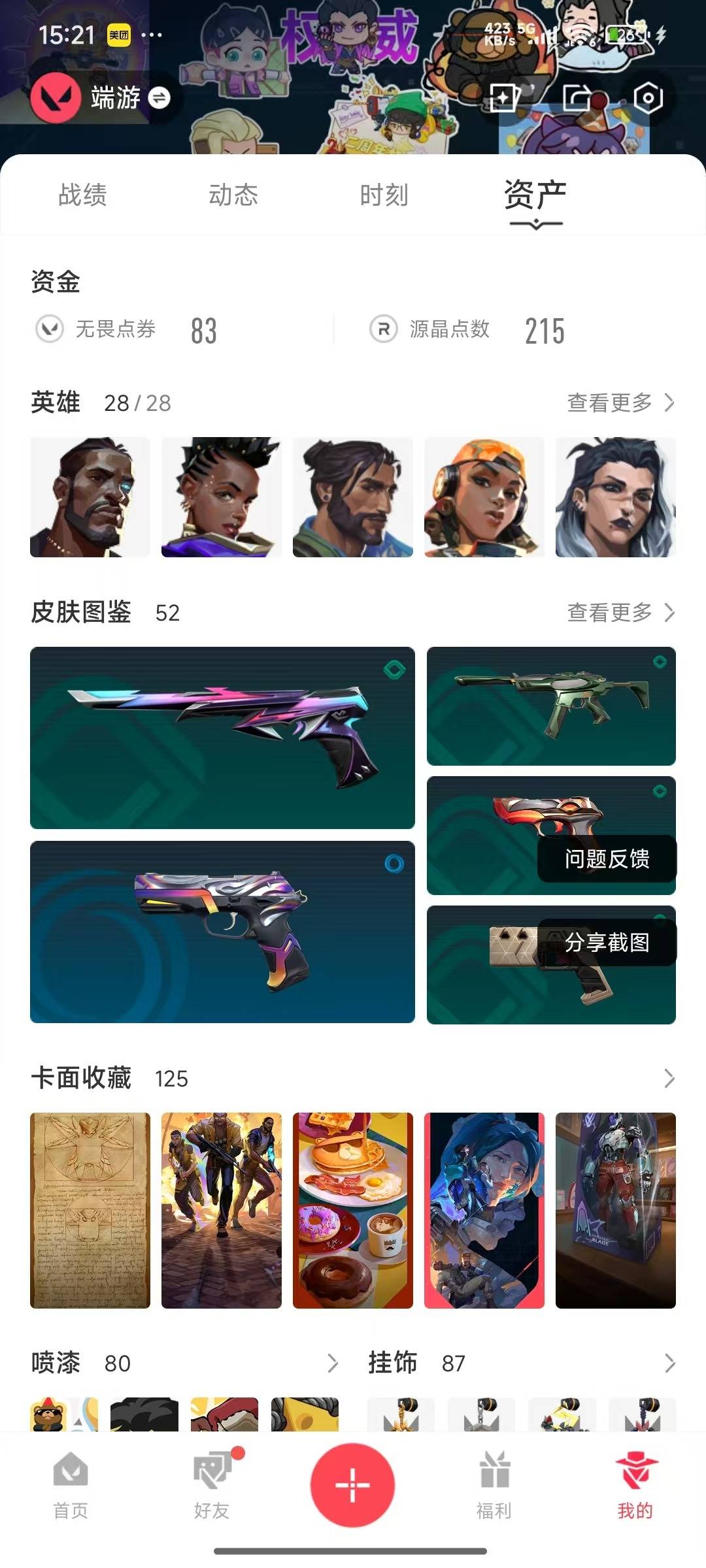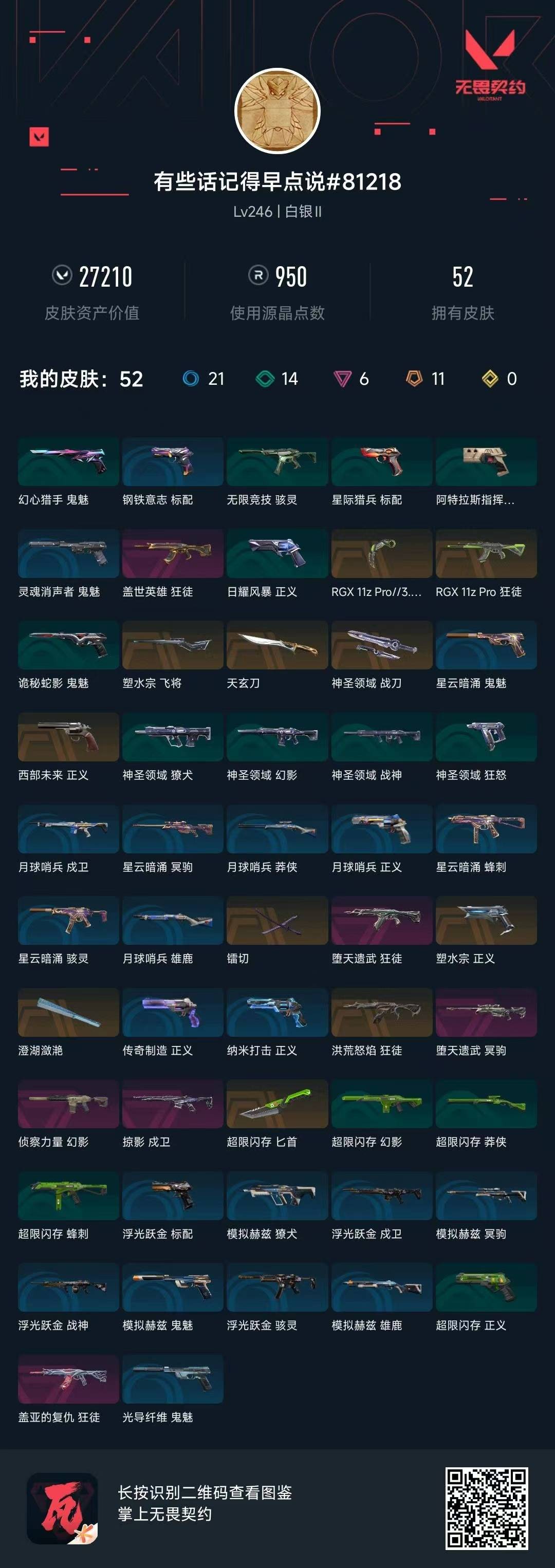 11橙皮 6紫皮 52皮肤 28英雄 125卡面 950已用源晶 白银段位 【近战武器皮肤】:匕首-超限闪存神圣领域 战刀镭切爪刀-rgx 11z pro 3.0天玄刀澄湖潋滟 【佩呛皮肤】:正义-西部未来正义-塑水宗 【步呛皮肤】:狂徒-rgx 11z pro戍卫-掠影狂徒-洪荒