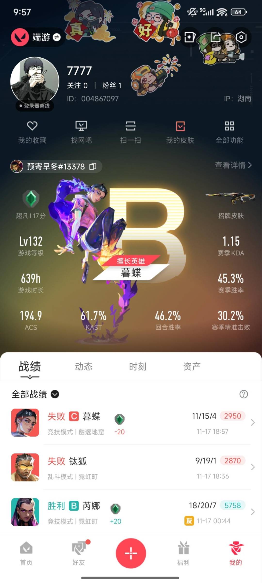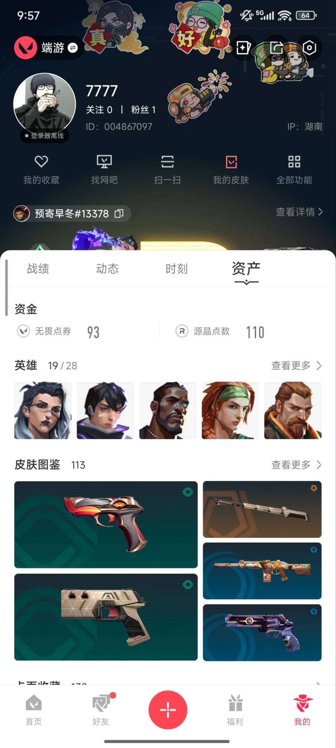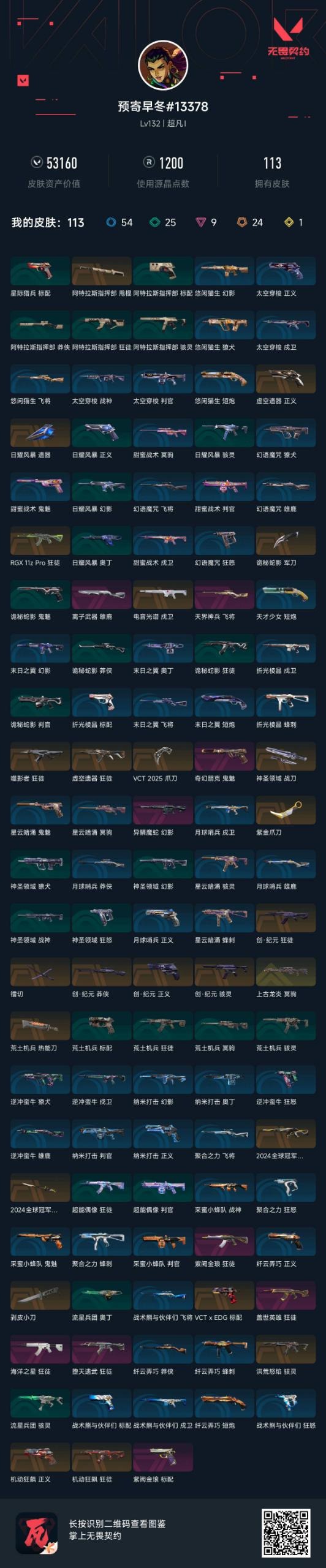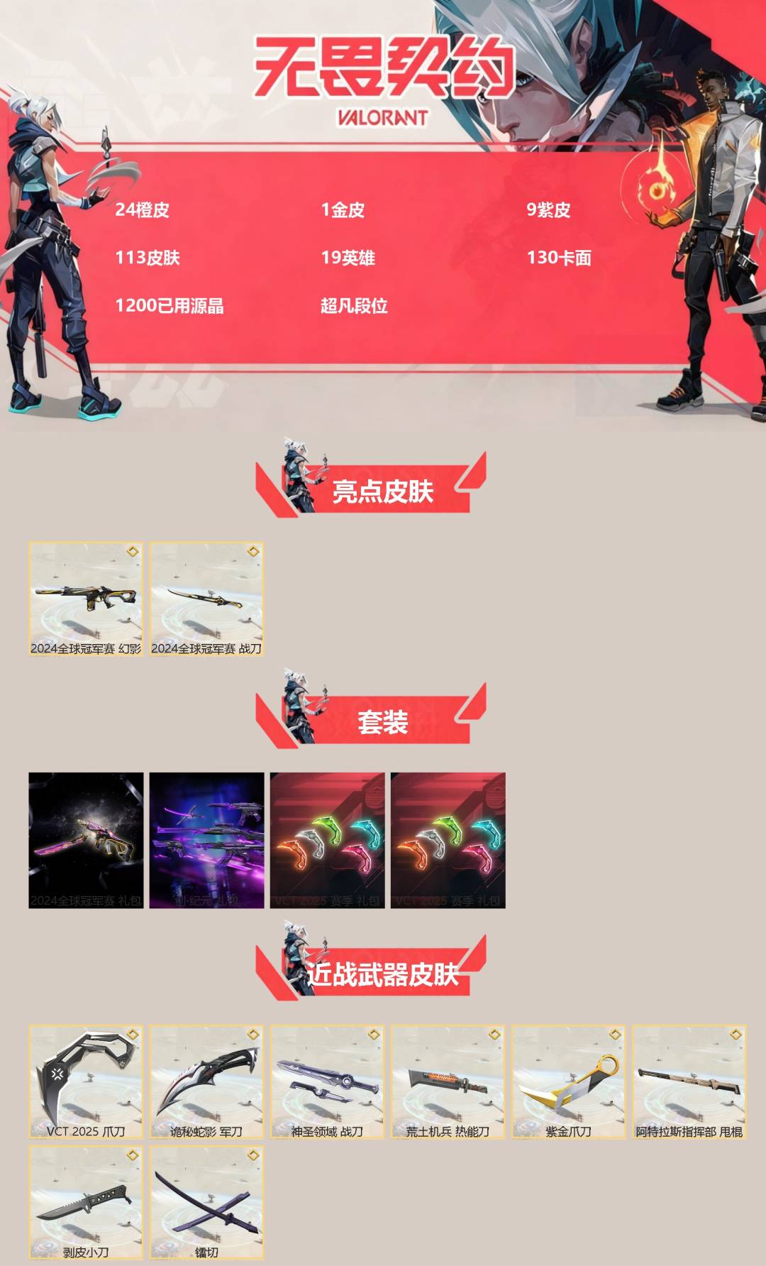 24橙皮 1金皮 9紫皮 113皮肤 19英雄 130卡面 1200已用源晶 超凡段位 【亮点皮肤】:幻影-2024全球冠军赛战刀-2024全球冠军赛 【套装】:创·纪元套装vct 2025赛季礼包vcn2025套装2024全球冠军赛套装 【近战武器皮肤】:阿特拉斯指挥部神圣领域 战
