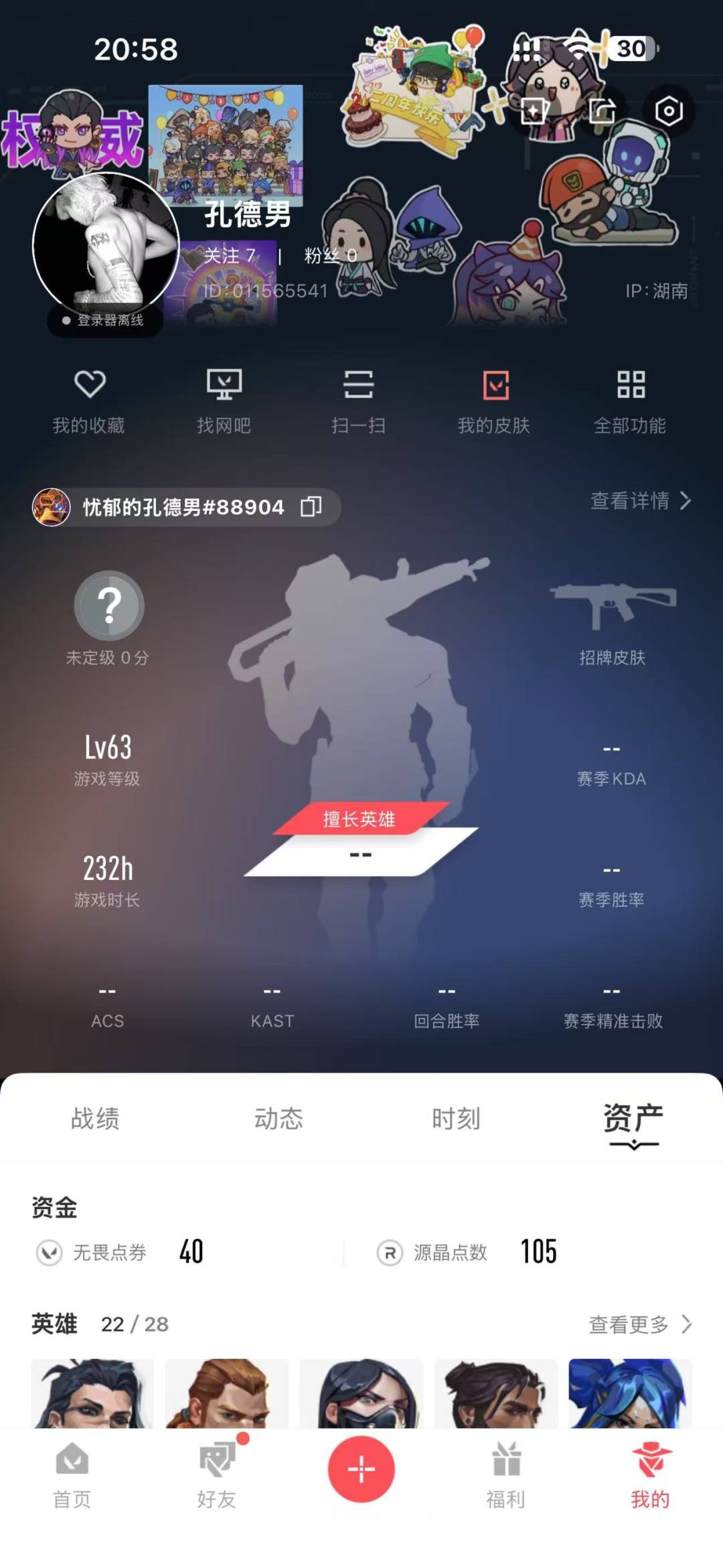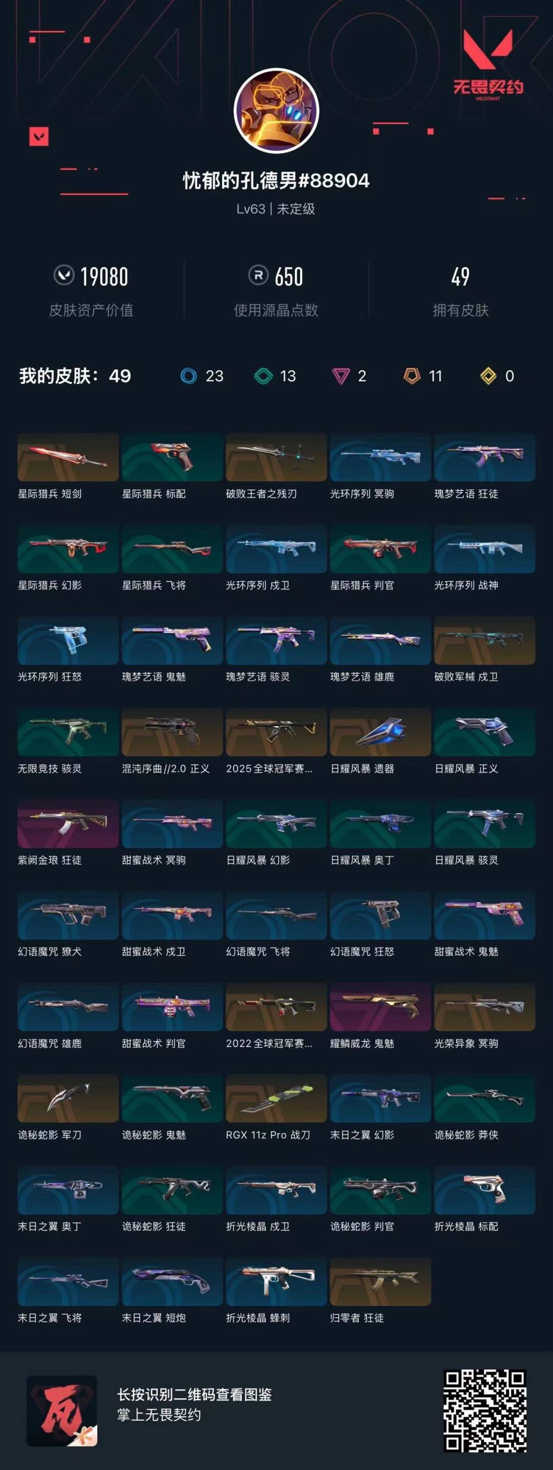 11橙皮 2紫皮 49皮肤 22英雄 71卡面 650已用源晶 未定级段位 【近战武器皮肤】:诡秘蛇影rgx 11z pro 战刀星际猎兵 短剑破败王者之残刃 【佩呛皮肤】:正义-混沌序曲2.0鬼魅-耀鳞威龙 【步呛皮肤】:2025全球冠军赛 狂徒狂徒-紫阙金琅狂徒-归零者戍卫-破败