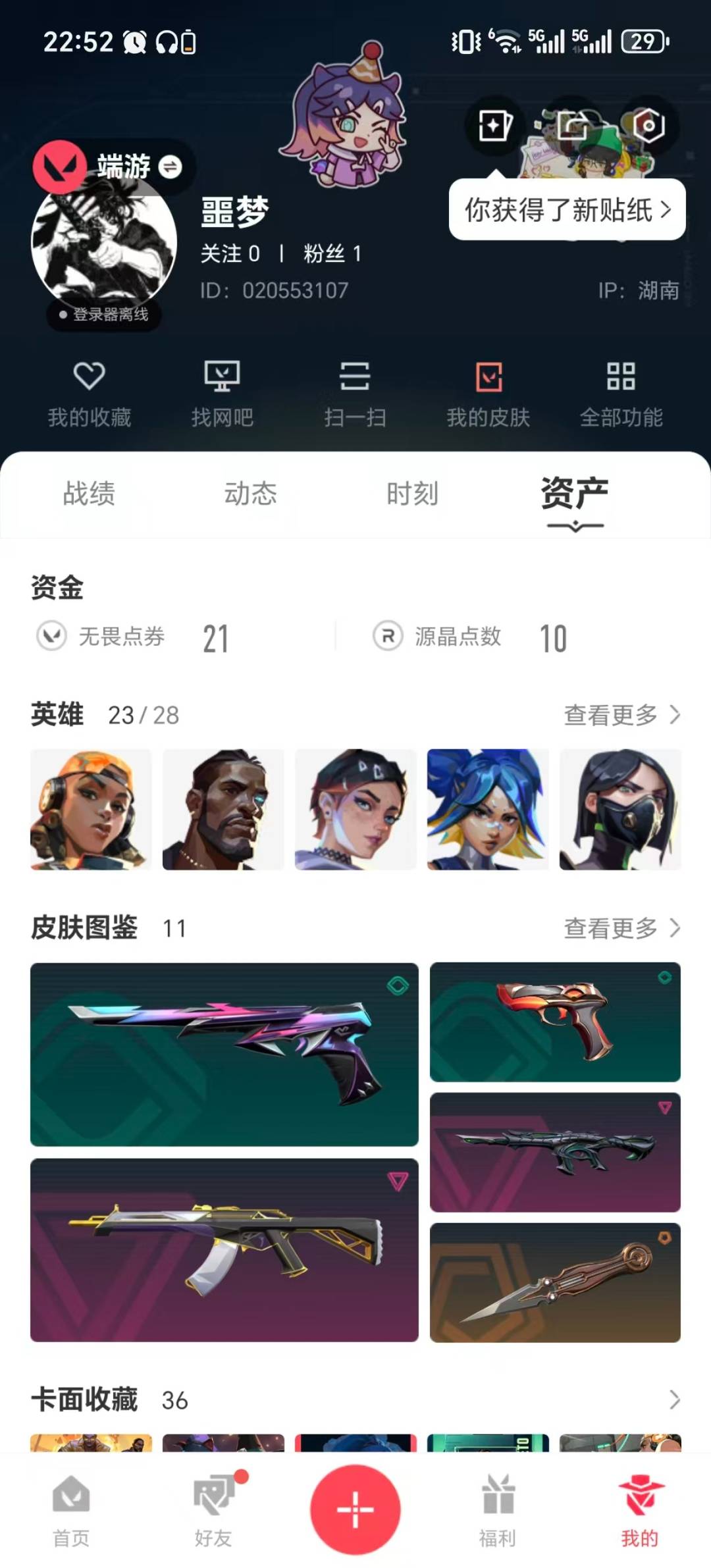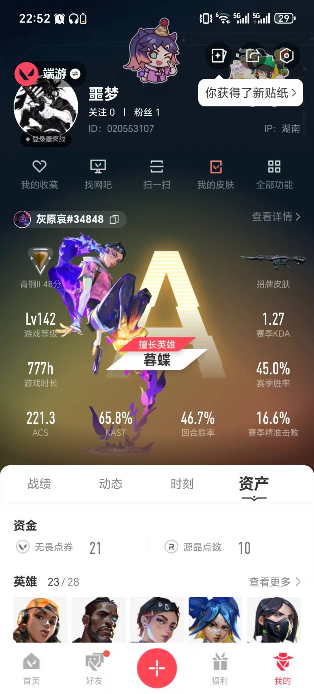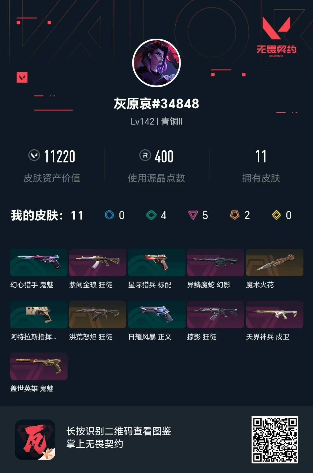 2橙皮 5紫皮 11皮肤 23英雄 36卡面 400已用源晶 青铜段位 【近战武器皮肤】:魔术火花 【佩呛皮肤】:鬼魅-盖世英雄 【步呛皮肤】:幻影-异鳞魔蛇狂徒-掠影狂徒-紫阙金琅狂徒-洪荒怒焰戍卫-天界神兵 【挂饰】:神中神挂饰