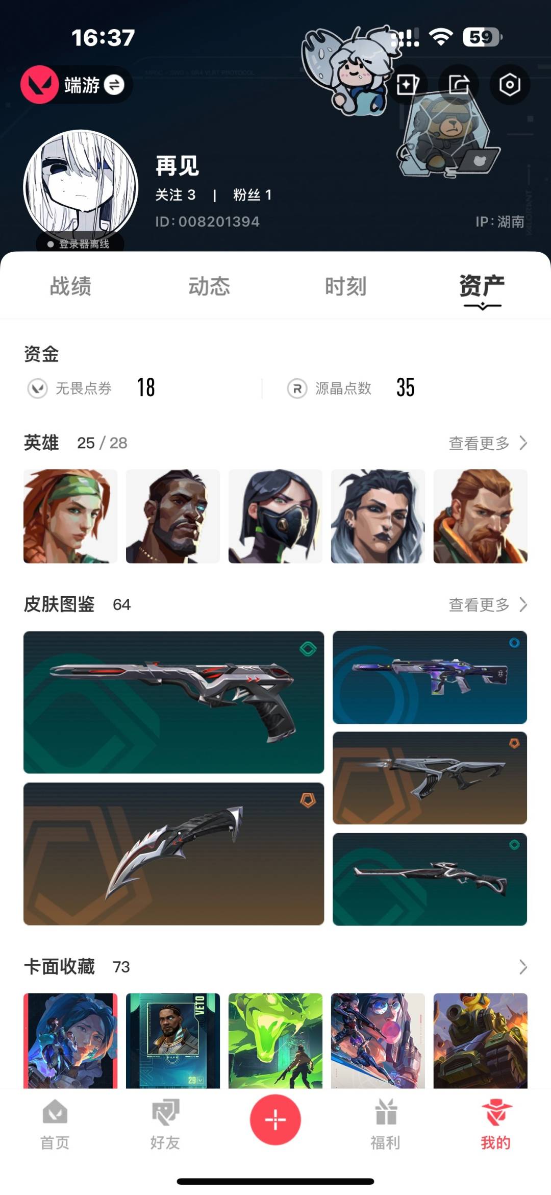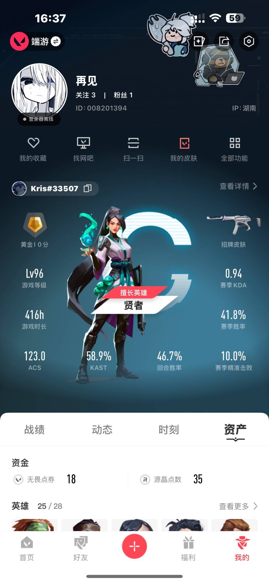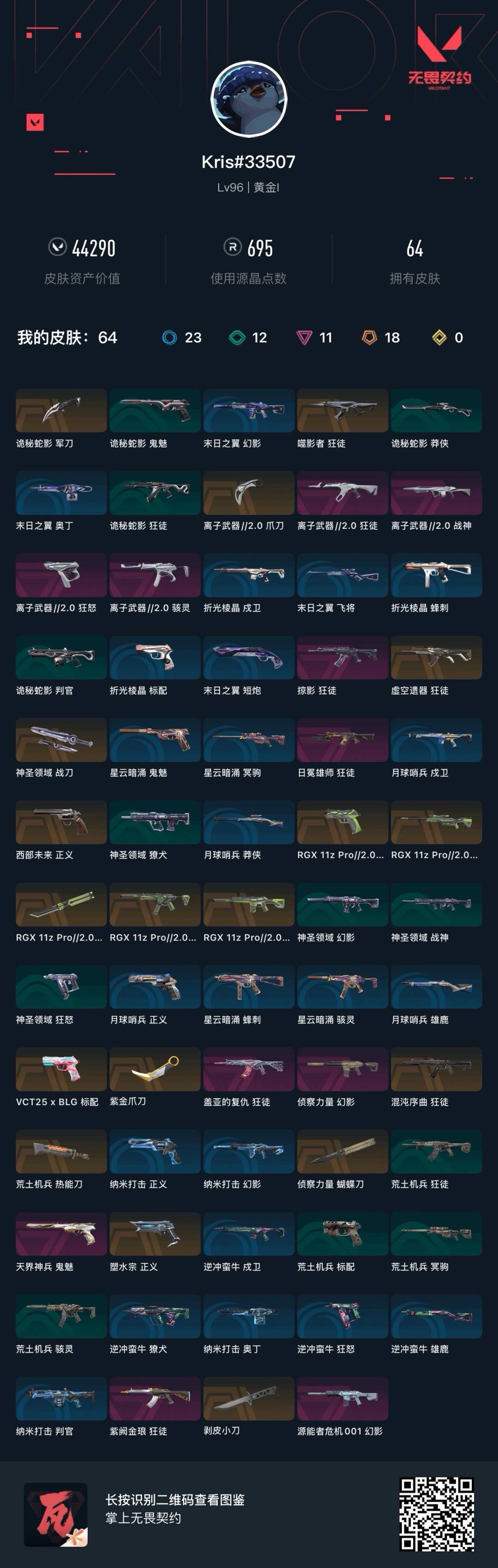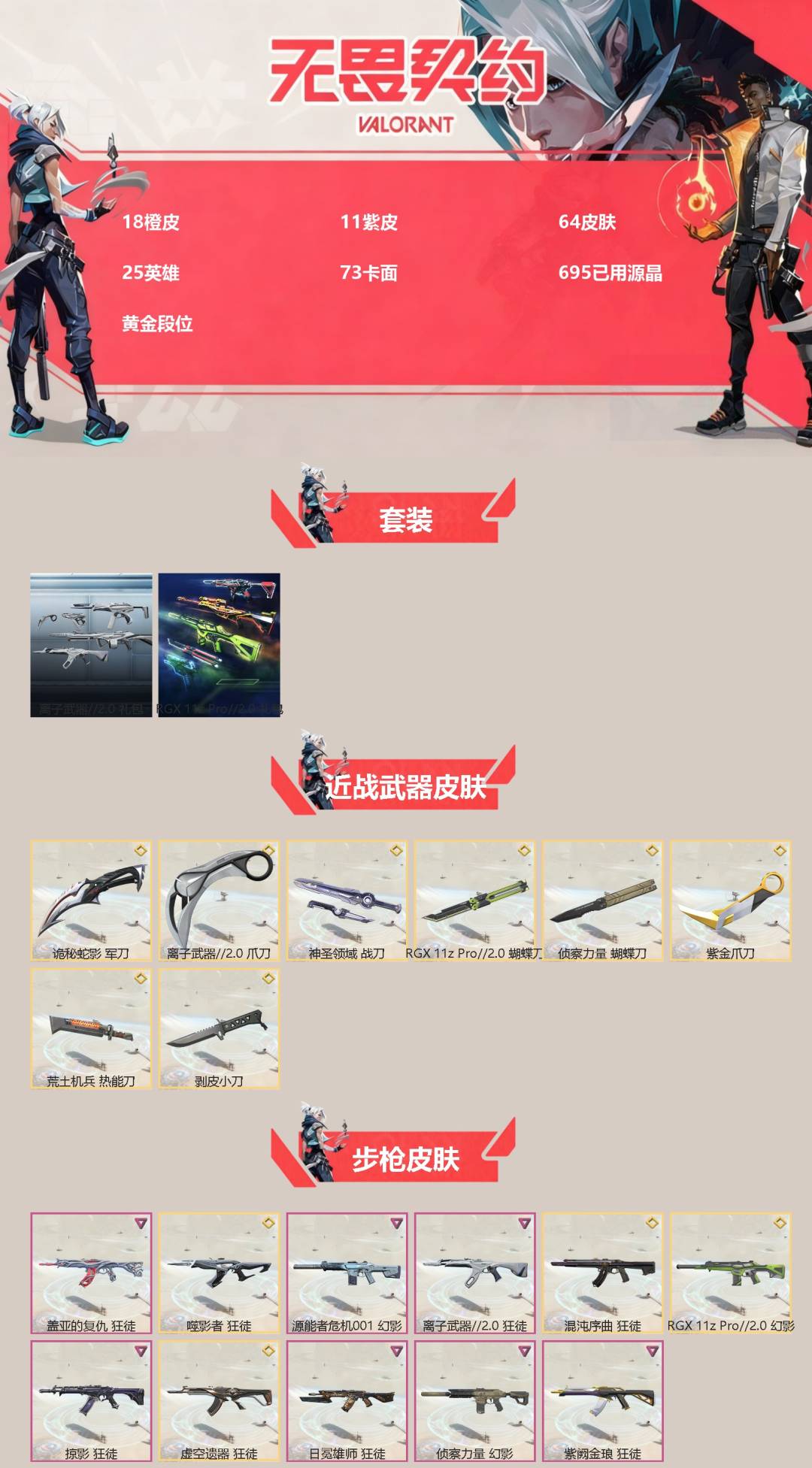 18橙皮 11紫皮 64皮肤 25英雄 73卡面 695已用源晶 黄金段位 【套装】:离子武器2.0rgx 11z pro//2.0 【近战武器皮肤】:神圣领域 战刀离子武器2.0 爪刀rgx 11z pro//2.0 蝴蝶刀荒土机兵热能刀诡秘蛇影蝴蝶刀-侦察力量剥皮小刀紫金爪刀