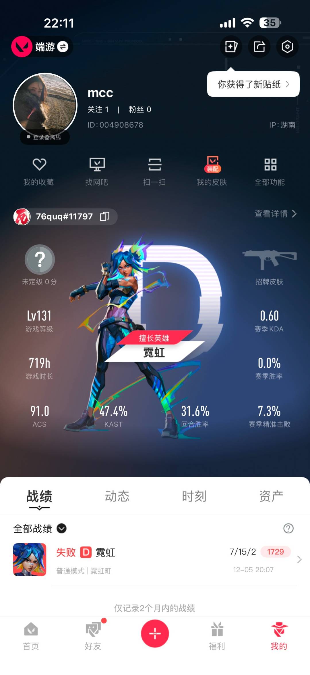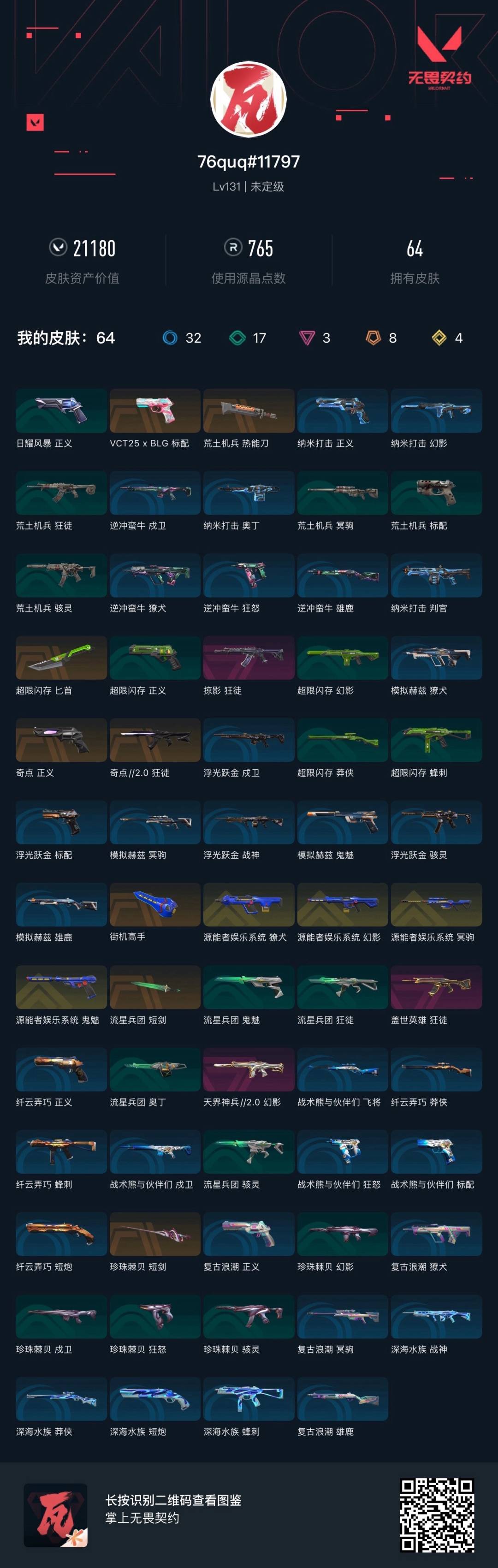 [14589151]8橙皮 4金皮 3紫皮 64皮肤 27英雄 91卡面 765已用源晶 未定级段位 【套装】:源能者娱乐系统套装 【近战武器皮肤】:匕首-超限闪存短剑-流星兵团荒土机兵热能刀短剑-珍珠棘贝街机高手 【佩呛皮肤】:标配-vct25xblg正义-奇点鬼魅-源能者娱乐系统 【步呛皮肤】:狂徒-奇点//2.0狂徒-掠影狂徒-盖世英雄幻影-天界神兵2.0幻影-源能者娱乐系统獠犬-源能者娱乐系统 【狙击呛皮肤】:冥驹-源能者娱乐系统 【挂饰】:薰衣草之心挂饰传世莲华挂饰双城之战小蛋糕挂饰双城之战魄罗挂饰第八季神话挂饰vctxblg挂饰云开见日挂饰迷你机甲挂饰终章ko小金人挂饰