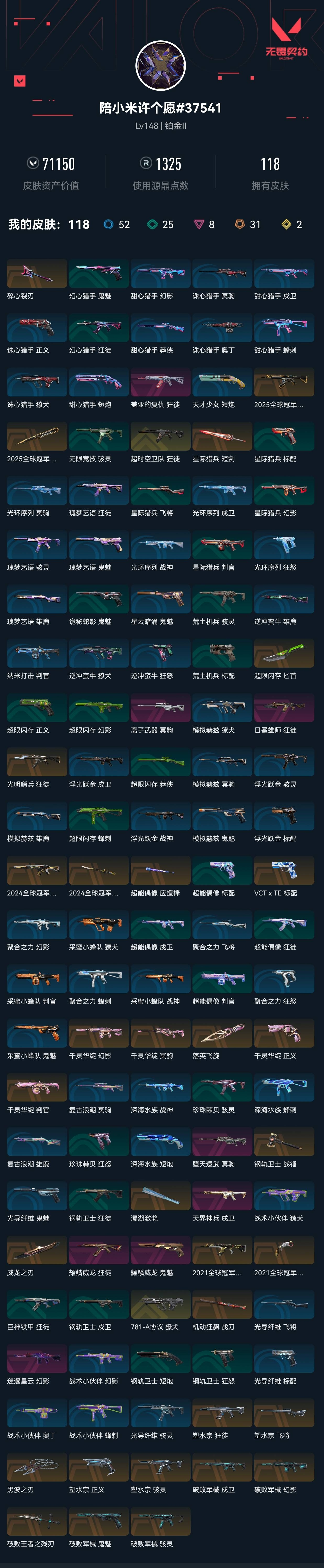 【无畏契约】【yhwww7147】等级:148,已用无畏点71150,已用源晶点1325,金皮:獠犬-781-a协议|狂徒-超时空卫队__橙皮:标配-vct x te|骇灵-破败军械|飞将-塑水宗|鬼魅-破败军械|幻影-2024全球冠军赛|幻影-破败军械|幻影-千灵华绽|近战-2024全球冠军赛 战刀|近战-2021全球冠军赛 爪刀|骇灵-塑水宗|近战-超限闪存 匕首|近战-黑波之刃|近战-钢轨卫士 战锤|近战-澄湖潋滟|近战-超能偶像 应援棒|近战-机动狂飙 战刀|近战-破败王者之残刃|近战-落英飞旋|近战-威龙之刃|狂徒-2021全球冠军赛|狂徒-塑水宗|狂徒-光明哨兵|冥驹-千灵华绽|正义-塑水宗|戍卫-破败军械|判官-千灵华绽|正义-千灵华绽|近战-星际猎兵 短剑|狂徒-2025全球冠军赛|近战-2025全球冠军赛 蝴蝶刀__紫皮:鬼魅-耀鳞威龙|幻影-迷邃星云|狂徒-日冕雄师|狂徒-盖亚的复仇|冥驹-堕天遗武|冥驹-离子武器|戍卫-天界神兵|狂徒-耀鳞威龙__绿皮:短炮-钢轨卫士|骇灵-珍珠棘贝|狂怒-钢轨卫士|狂徒-钢轨卫士|狂怒-珍珠棘贝|戍卫-钢轨卫士|骇灵-无限竞技|标配-荒土机兵|骇灵-荒土机兵|狂徒-巨神铁甲|戍卫-超能偶像|标配-超能偶像|狂徒-超能偶像|判官-超能偶像|正义-超限闪存|莽侠-超限闪存|幻影-超限闪存|蜂刺-超限闪存|鬼魅-诡秘蛇影|判官-星际猎兵|飞将-星际猎兵|标配-星际猎兵|狂徒-幻心猎手|鬼魅-幻心猎手__蓝皮:鬼魅-光导纤维|飞将-光导纤维|标配-光导纤维|骇灵-光导纤维|冥驹-复古浪潮|雄鹿-复古浪潮|短炮-天才少女|判官-纳米打击|雄鹿-逆冲蛮牛|狂怒-逆冲蛮牛|獠犬-逆冲蛮牛|鬼魅-星云暗涌|鬼魅-采蜜小蜂队|战神-采蜜小蜂队|獠犬-采蜜小蜂队|判官-采蜜小蜂队|骇灵-浮光跃金|标配-浮光跃金|戍卫-浮光跃金|战神-浮光跃金|蜂刺-聚合之力|幻影-聚合之力|狂怒-聚合之力|飞将-聚合之力|鬼魅-模拟赫兹|獠犬-模拟赫兹|冥驹-模拟赫兹|雄鹿-模拟赫兹|战神-深海水族|短炮-深海水族|蜂刺-深海水族|蜂刺-战术小伙伴|幻影-战术小伙伴|獠犬-战术小伙伴|奥丁-战术小伙伴|狂怒-光环序列|戍卫-光环序列|冥驹-光环序列|战神-光环序列|狂徒-瑰梦艺语|鬼魅-瑰梦艺语|骇灵-瑰梦艺语|雄鹿-瑰梦艺语|蜂刺-甜心猎手|短炮-甜心猎手|莽侠-甜心猎手|幻影-甜心猎手|戍卫-甜心猎手|正义-诛心猎手|冥驹-诛心猎手|獠犬-诛心猎手|奥丁-诛心猎手__段位:铂金__英雄:尚勃勒|维斯|黑梦|斯凯|暮蝶|盖可|霓虹|壹决|星礈|k/o|幽影|夜露|钢锁|海神|奇乐|炼狱|铁臂|贤者|猎枭|钛狐|芮娜|零|捷风|蝰蛇|不死鸟|幻棱|雷兹|禁灭