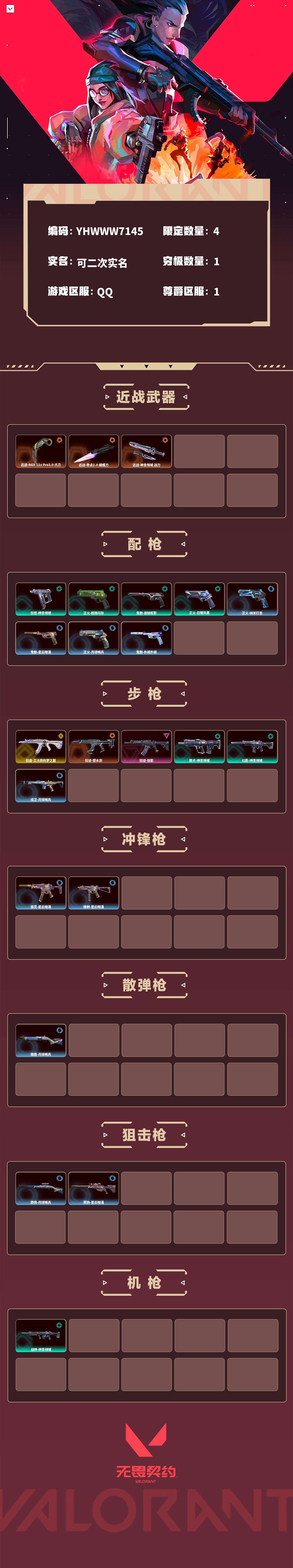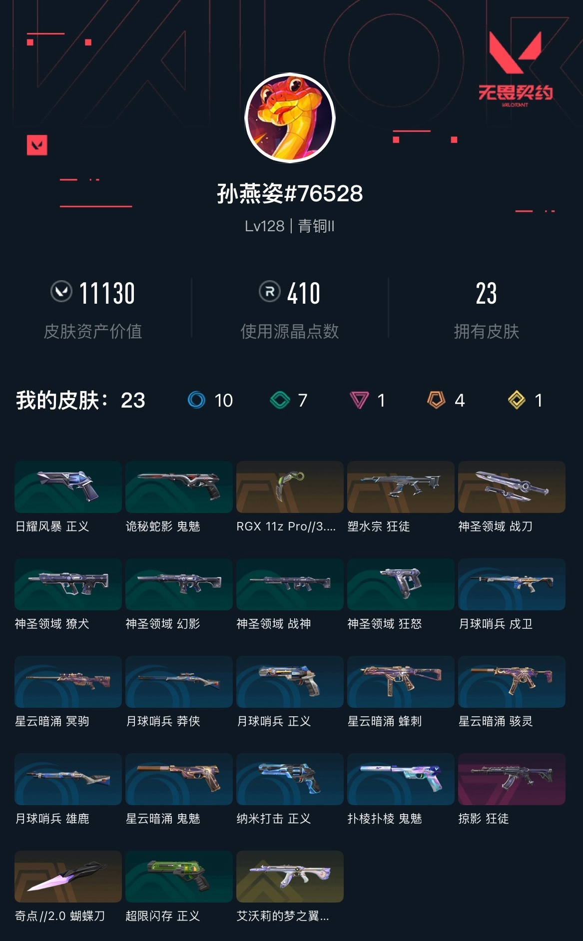 【无畏契约】【yhwww7145】等级:128,已用无畏点11130,已用源晶点410,金皮:狂徒-艾沃莉的梦之翼__橙皮:近战-rgx 11z pro3.0 爪刀|狂徒-塑水宗|近战-奇点2.0 蝴蝶刀|近战-神圣领域 战刀__段位:青铜__紫皮:狂徒-掠影__蓝皮:正义-纳米打击|鬼魅-星云暗涌|骇灵-星云暗涌|正义-月球哨兵|莽侠-月球哨兵|戍卫-月球哨兵|雄鹿-月球哨兵|鬼魅-扑棱扑棱|冥驹-星云暗涌|蜂刺-星云暗涌__绿皮:獠犬-神圣领域|狂怒-神圣领域|战神-神圣领域|幻影-神圣领域|正义-超限闪存|鬼魅-诡秘蛇影|正义-日耀风暴__英雄:尚勃勒|维斯|黑梦|斯凯|暮蝶|盖可|霓虹|壹决|星礈|k/o|幽影|夜露|钢锁|海神|奇乐|炼狱|铁臂|贤者|猎枭|钛狐|芮娜|零|捷风|蝰蛇|不死鸟|幻棱|雷兹