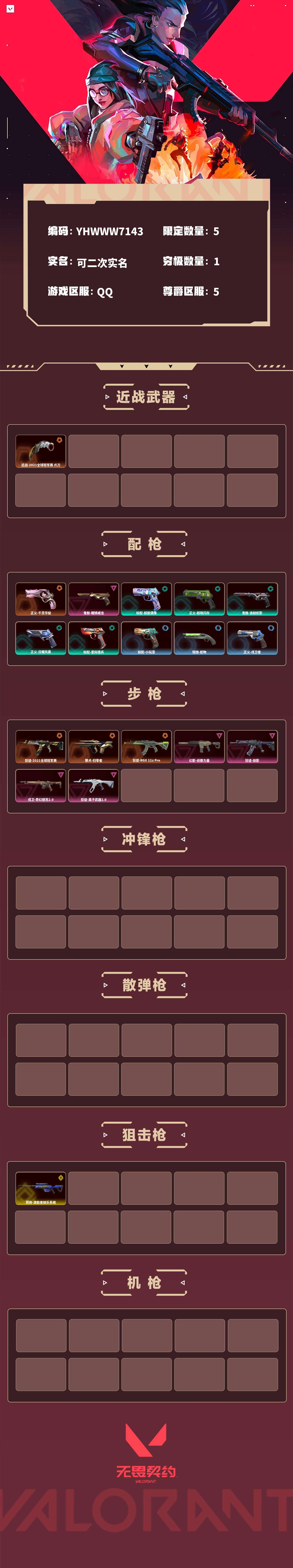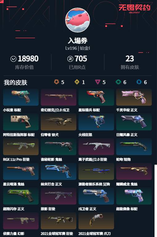 【无畏契约】【yhwww7143】等级:196,已用无畏点18980,已用源晶点705,金皮:冥驹-源能者娱乐系统__橙皮:近战-2021全球冠军赛 爪刀|狂徒-2021全球冠军赛|獠犬-归零者|正义-千灵华绽|狂徒-rgx 11z pro__紫皮:鬼魅-耀鳞威龙|幻影-侦察力量|狂徒-掠影|戍卫-奇幻朋克2.0|狂徒-离子武器2.0__段位:铂金__蓝皮:标配-小玩意|短炮-蛇吻|正义-戍卫者|正义-纳米打击|鬼魅-星云暗涌|标配-阿特拉斯指挥部__绿皮:标配-超能偶像|正义-超限闪存|鬼魅-诡秘蛇影|正义-日耀风暴|标配-星际猎兵__英雄:尚勃勒|维斯|斯凯|暮蝶|盖可|霓虹|壹决|k/o|幽影|夜露|钢锁|炼狱|铁臂|贤者|猎枭|钛狐|芮娜|零|捷风|蝰蛇|不死鸟|幻棱|雷兹|禁灭