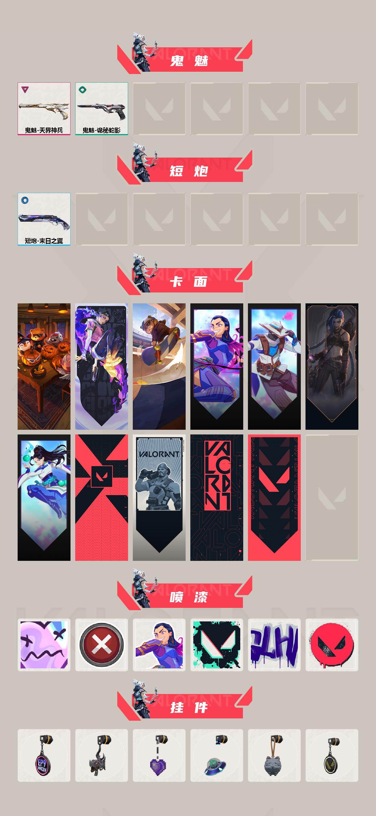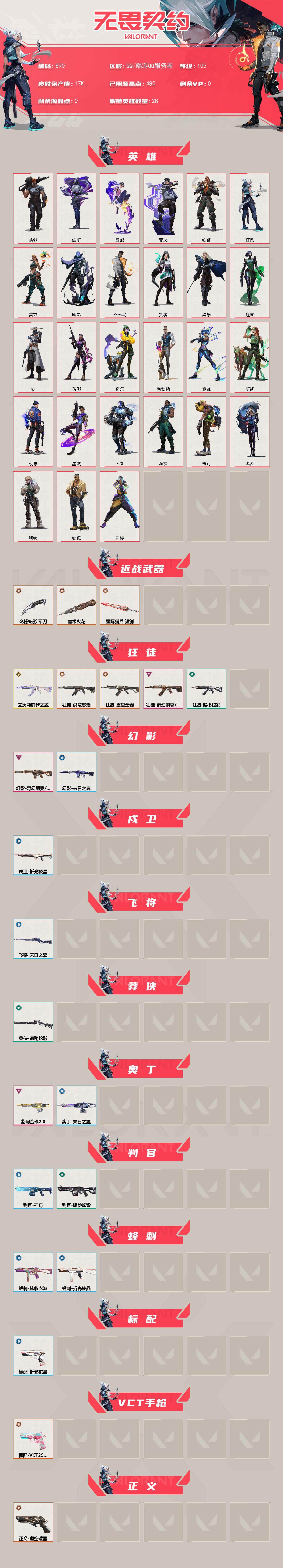 [14614211]【英雄】:幻棱,炼狱,维斯,暮蝶,钛狐,壹决,铁臂,捷风,雷兹,幽影,不死鸟,贤者,猎枭,蝰蛇,零,芮娜,奇乐,尚勃勒,霓虹,斯凯,夜露,星礈,k/o,海神,盖可,黑梦,钢锁 【近战 武器】:近战武器-魔术火花,近战武器-诡秘蛇影 军刀,近战武器-星际猎兵 短剑,近战武器-魔术火花 【狂徒】:狂徒-艾沃莉的梦之翼,狂徒-洪荒怒焰,狂徒-虚空遗器,狂徒-奇幻朋克//3.0,狂徒-诡秘蛇影 【幻影】:幻影-奇幻朋克//3.0,幻影-末日之翼 【戍卫】:戍卫-折光棱晶 【飞将】:飞将-末日之翼 【莽侠】:莽侠-诡秘蛇影 【奥丁】:奥丁-紫阙金琅//2.0,奥丁-末日之翼 【判官】:判官-诡秘蛇影,判官-神罚 【蜂刺】:蜂刺-炫彩澎湃,蜂刺-折光棱晶 【标配】:标配-折光棱晶 【vct手呛】:标配-vct25 x blg 【正义】:正义-虚空遗器 【鬼魅】:鬼魅-天界神兵,鬼魅-诡秘蛇影 【短炮】:短炮-末日之翼 【卡面】:南瓜盛典 卡面,无畏契约:暮蝶 卡面,clutch 卡面,无畏契约go!第一卷:芮娜 卡面,无畏契约go!第一卷:零 卡面,《双城之战》金克丝 卡面,无畏契约go!第一卷:贤者 卡面,代号红色 卡面,新兵报到 卡面,v契约 卡面,无畏契约 卡面 【喷漆】:伤心心 喷漆,买装还是存钱 喷漆,无畏契约go!第一卷:芮娜 喷漆,胜利属于无畏契约 喷漆,glhf 喷漆,无畏契约 喷漆 【挂饰】:第九季//第三幕 纪念币 挂饰,鱼骨头 挂饰,薰衣草之心 挂饰,天外飞客 挂饰,《双城之战》魄罗 挂饰,无畏契约 纪念币 挂饰