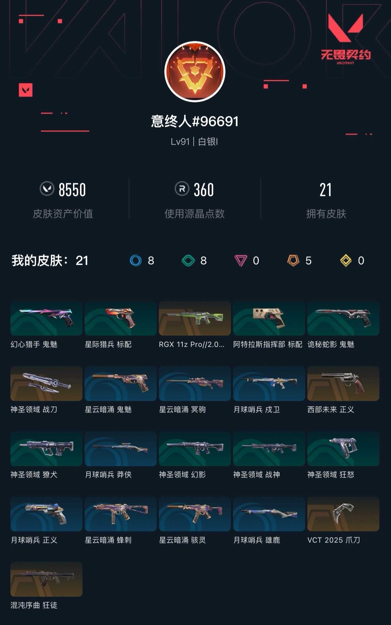 【无畏契约】【yhwww6971】等级:91,已用无畏点8550,已用源晶点360,橙皮:狂徒-混沌序曲|近战-神圣领域 战刀|幻影-rgx 11z pro2.0|正义-西部未来|近战-vct 2025 爪刀__段位:白银__蓝皮:鬼魅-星云暗涌|骇灵-星云暗涌|正义-月球哨兵|莽侠-月球哨兵|戍卫-月球哨兵|雄鹿-月球哨兵|冥驹-星云暗涌|蜂刺-星云暗涌|标配-阿特拉斯指挥部__绿皮:獠犬-神圣领域|狂怒-神圣领域|战神-神圣领域|幻影-神圣领域|鬼魅-诡秘蛇影|标配-星际猎兵|鬼魅-幻心猎手__英雄:尚勃勒|黑梦|暮蝶|盖可|霓虹|壹决|k/o|幽影|夜露|炼狱|铁臂|贤者|猎枭|芮娜|零|捷风|不死鸟|幻棱|雷兹|禁灭