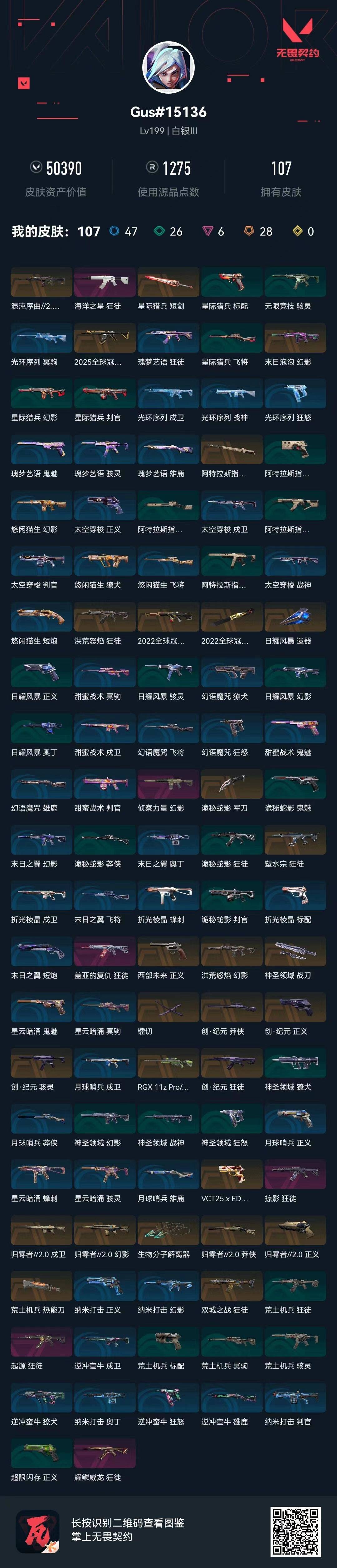 28橙皮 6紫皮 107皮肤 27英雄 165卡面 1275已用源晶 白银段位 【亮点皮肤】:幻影-2022全球冠军赛蝴蝶刀-2022全球冠军赛 【套装】:归零者//2.0套装2022全球冠军赛创·纪元套装 【近战武器皮肤】:阿特拉斯指挥部神圣领域 战刀镭切生物分子解离器荒土机兵热能
