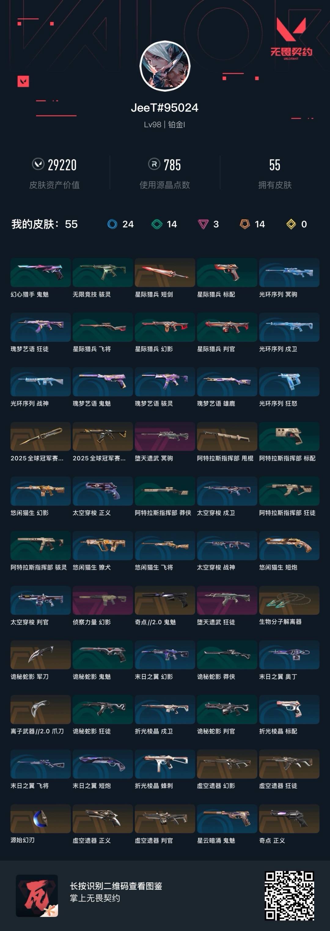 [14622833]14橙皮 3紫皮 55皮肤 25英雄 74卡面 785已用源晶 铂金段位 【套装】:2025全球冠军赛虚空遗器 【近战武器皮肤】:阿特拉斯指挥部离子武器2.0 爪刀源始幻刃生物分子解离器诡秘蛇影星际猎兵 短剑2025全球冠军赛 蝴蝶刀 【佩呛皮肤】:鬼魅-奇点//2.0正义-虚空遗器正义-奇点 【霰弹呛皮肤】:判官-虚空遗器 【步呛皮肤】:幻影-虚空遗器狂徒-虚空遗器2025全球冠军赛 狂徒狂徒-堕天遗武幻影-侦察力量 【狙击呛皮肤】:冥驹-堕天遗武 【挂饰】:双城之战魄罗挂饰神中神挂饰2025全球冠军赛挂饰蓄势待滚挂饰