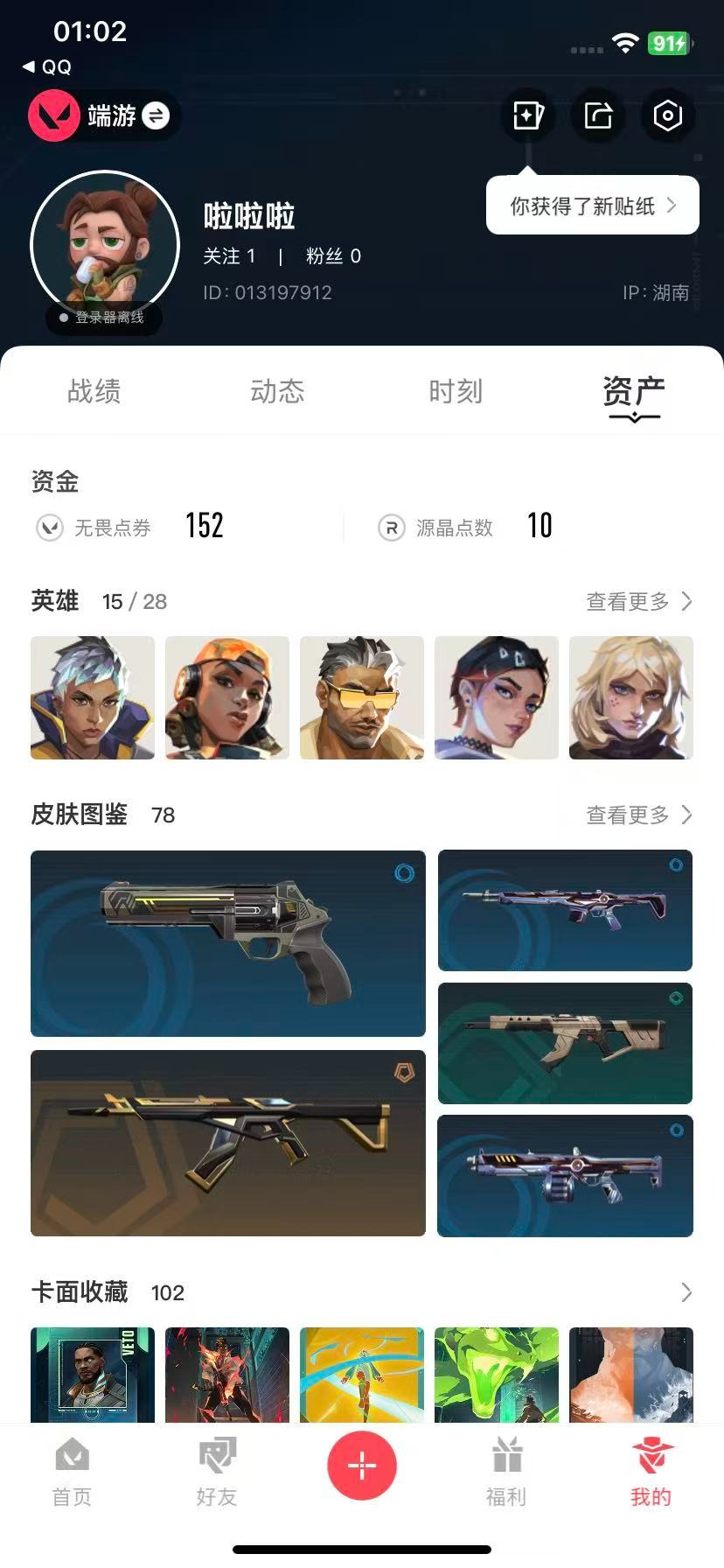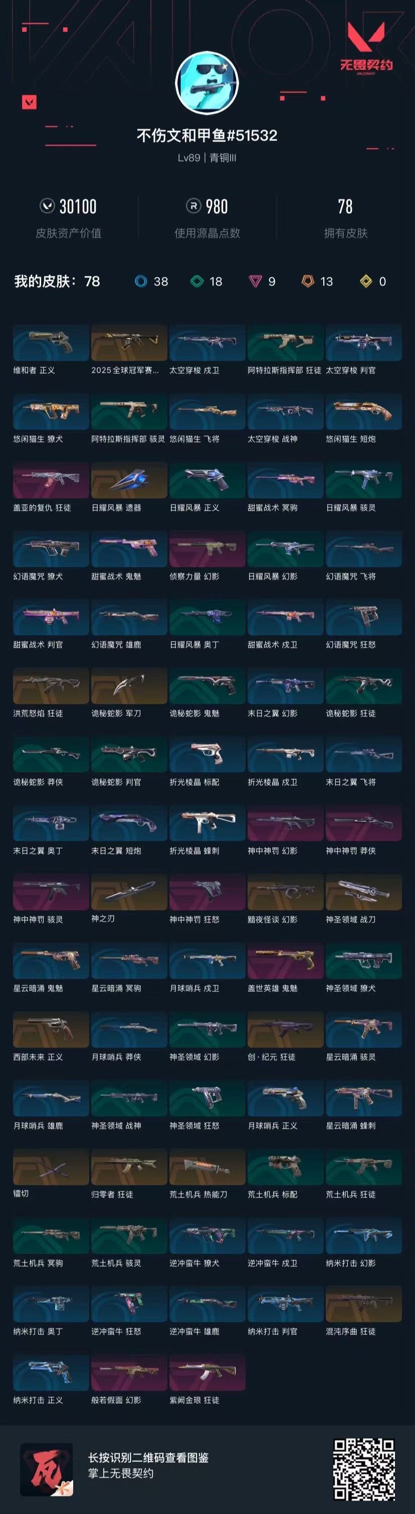 13橙皮 9紫皮 78皮肤 15英雄 102卡面 980已用源晶 青铜段位 【套装】:神罚套装神中神罚套装 【近战武器皮肤】:神之刃神圣领域 战刀镭切荒土机兵热能刀诡秘蛇影 【佩呛皮肤】:狂怒-神中神罚正义-西部未来鬼魅-盖世英雄 【冲锋呛皮肤】:骇灵-神中神罚 【步呛皮肤】:狂徒-