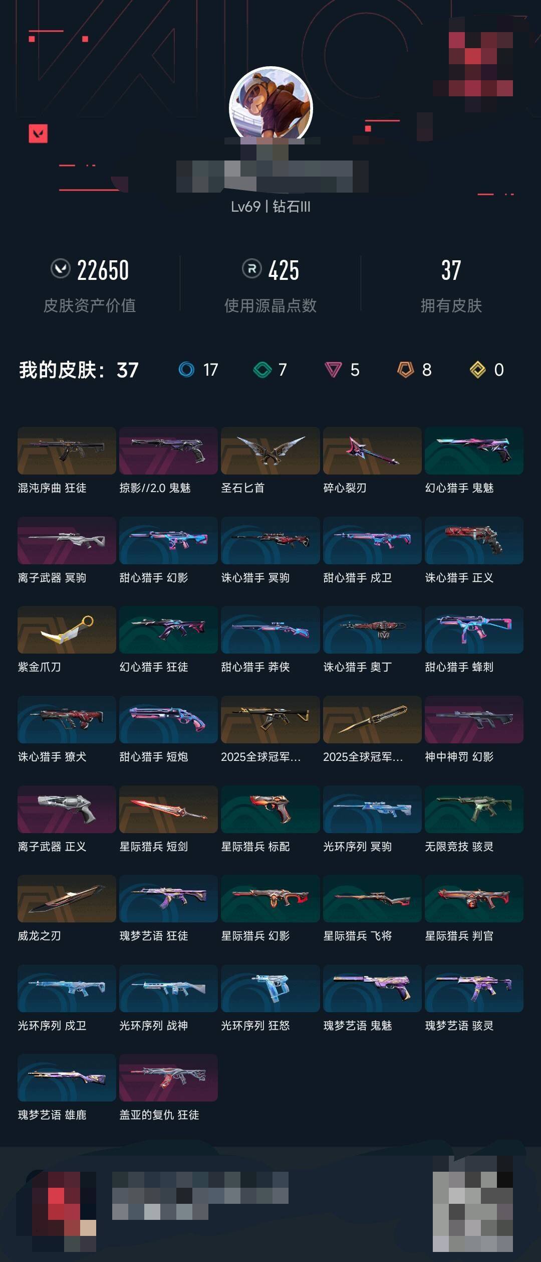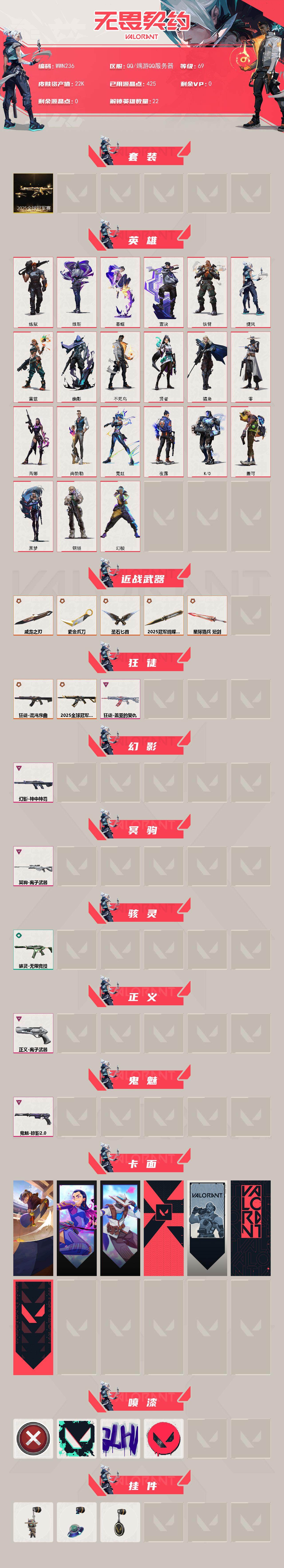 【wwn236】终极8/卓越5/皮肤37/等级69/段位:钻石/2025全球冠军赛套装/幻棱/炼狱/维斯/暮蝶/壹决/铁臂/捷风/雷兹/幽影/不死鸟/贤者/猎枭/零/芮娜/尚勃勒/霓虹/夜露/k/o/盖可/黑梦/钢锁/近战武器-2025全球冠军赛 蝴蝶刀/近战武器-紫金爪刀/近战武器-威龙之刃/近战武器-圣石匕首/近战武器-星际猎兵 短剑/狂徒-2025全球冠军赛/狂徒-混沌序曲/狂徒-盖亚的复仇/幻影-神中神罚/冥驹-离子武器/骇灵-无限竞技/正义-离子武器/鬼魅-掠影//2.0/clutch 卡面/无畏契约go!第一卷:芮娜 卡面/无畏契约go!第一卷:零 卡面/代号红色 卡面/新兵报到 卡面/v契约 卡面/无畏契约 卡面/买装还是存钱 喷漆/胜利属于无畏契约 喷漆/glhf 喷漆/无畏契约 喷漆/无畏契约go!第一卷 零 挂饰/天外飞客 挂饰/无畏契约 纪念币 挂饰