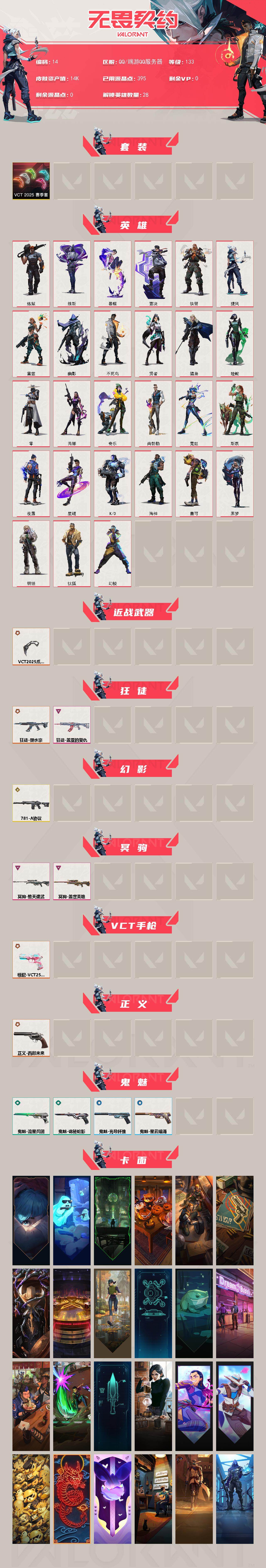 [14628984]【套装】:vct 2025 赛季套装 【英雄】:幻棱,炼狱,维斯,暮蝶,钛狐,壹决,铁臂,捷风,雷兹,幽影,不死鸟,贤者,猎枭,蝰蛇,零,芮娜,奇乐,尚勃勒,霓虹,斯凯,夜露,星礈,k/o,海神,盖可,黑梦,钢锁 【近战 武器】:近战武器-vct 2025 爪刀 【狂徒】:狂徒-塑水宗,狂徒-盖亚的复仇 【幻影】:幻影-781-a协议 【冥驹】:冥驹-堕天遗武,冥驹-盖世英雄 【vct手呛】:标配-vct25 x blg 【正义】:正义-西部未来 【鬼魅】:鬼魅-流星兵团,鬼魅-诡秘蛇影,鬼魅-光导纤维,鬼魅-星云暗涌 【卡面】:《双城之战》拥抱 卡面,精灵大战 卡面,欢迎来到底城 卡面,南瓜盛典 卡面,修车达人 卡面,正义的化身 卡面,时间到 卡面,最高舞台 卡面,归乡 // 蝰蛇 卡面,声感陷阱设计图 卡面,霓帧牛蛙 卡面,梦幻奶茶 卡面,趁热吃 卡面,源能反应 卡面,零点嗅探设计图 卡面,虹吸式咖啡壶 卡面,无畏契约go!第一卷:芮娜 卡面,无畏契约go!第一卷:零 卡面,终章:同步耍酷 卡面,龍记 卡面,化茧成蝶 卡面,完美调谐 卡面 ,没有什么能逃过我的眼睛 卡面,暗呛 卡面,代号红色 卡面,新兵报到 卡面,v契约 卡面,无畏契约 卡面 【喷漆】:嗨宝南瓜灯 喷漆,嘭! 喷漆,都算到了 喷漆,控场勿近 喷漆,熊抱 喷漆,超级粉丝 喷漆,捷风差距 喷漆,拼一呛 喷漆,我觉得不行 喷漆,我的刀呢? 喷漆,买装还是存钱 喷漆,醒狮贺春 喷漆,关门放狗 喷漆,辣得好下饭 喷漆,旅行小熊 喷漆,蕊形灯 喷漆,胜利属于无畏契约 喷漆,glhf 喷漆,无畏契约 喷漆 【挂饰】:悠闲鸡块 挂饰,伞绳 挂饰,《双城之战》小蛋糕 挂饰,第九季//第三幕 纪念币 挂饰,鱼骨头 挂饰,熔岩灯 挂饰,第九季//第二幕 纪念币 挂饰,袖珍捷风 挂饰,z世代特饮 挂饰,第九季//第一幕 纪念币 挂饰,第八季:白银 挂饰,终章:迷你机甲 挂饰,战术河童 挂饰,荧光棒 挂饰,第八季//第三幕 纪念币 挂饰,天外飞客 挂饰,好运福爪 挂饰,终章:晒出笑脸 挂饰,红鳞松叶 挂饰,酷闪轮滑 挂饰,瞄这里 挂饰,第八季//第一幕 纪念币 挂饰,无畏契约 纪念币 挂饰