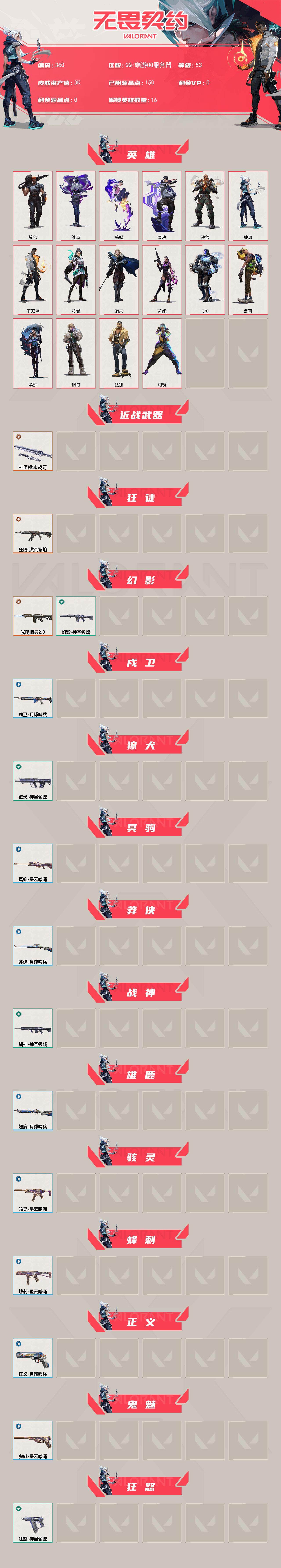 【英雄】:幻棱,炼狱,维斯,暮蝶,钛狐,壹决,铁臂,捷风,不死鸟,贤者,猎枭,芮娜,k/o,盖可,黑梦,钢锁 【近战 武器】:近战武器-神圣领域 战刀 【狂徒】:狂徒-洪荒怒焰 【幻影】:幻影-光明哨兵//2.0,幻影-神圣领域 【戍卫】:戍卫-月球哨兵 【獠犬】:獠犬-神圣领域 【冥驹】:冥驹-星云暗涌 【莽侠】:莽侠-月球哨兵 【战神】:战神-神圣领域 【雄鹿】:雄鹿-月球哨兵 【骇灵】: