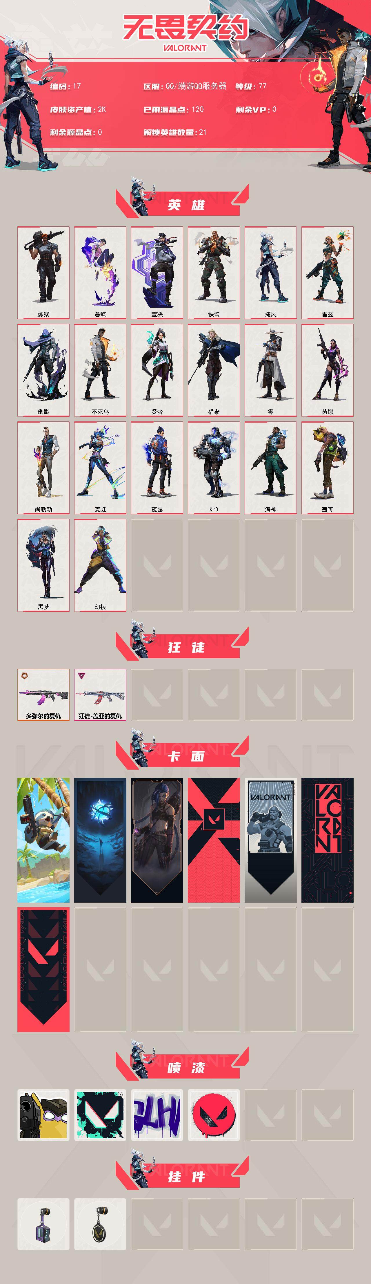 [14629811]【英雄】:幻棱,炼狱,暮蝶,壹决,铁臂,捷风,雷兹,幽影,不死鸟,贤者,猎枭,零,芮娜,尚勃勒,霓虹,夜露,k/o,海神,盖可,黑梦 【狂徒】:狂徒-多弥尔的复仇,狂徒-盖亚的复仇 【卡面】:树懒大作战 卡面,无垠星环 卡面,《双城之战》金克丝 卡面,代号红色 卡面,新兵报到 卡面,v契约 卡面,无畏契约 卡面 【喷漆】:放下武器 喷漆,胜利属于无畏契约 喷漆,glhf 喷漆,无畏契约 喷漆 【挂饰】:动力机箱 挂饰,无畏契约 纪念币 挂饰